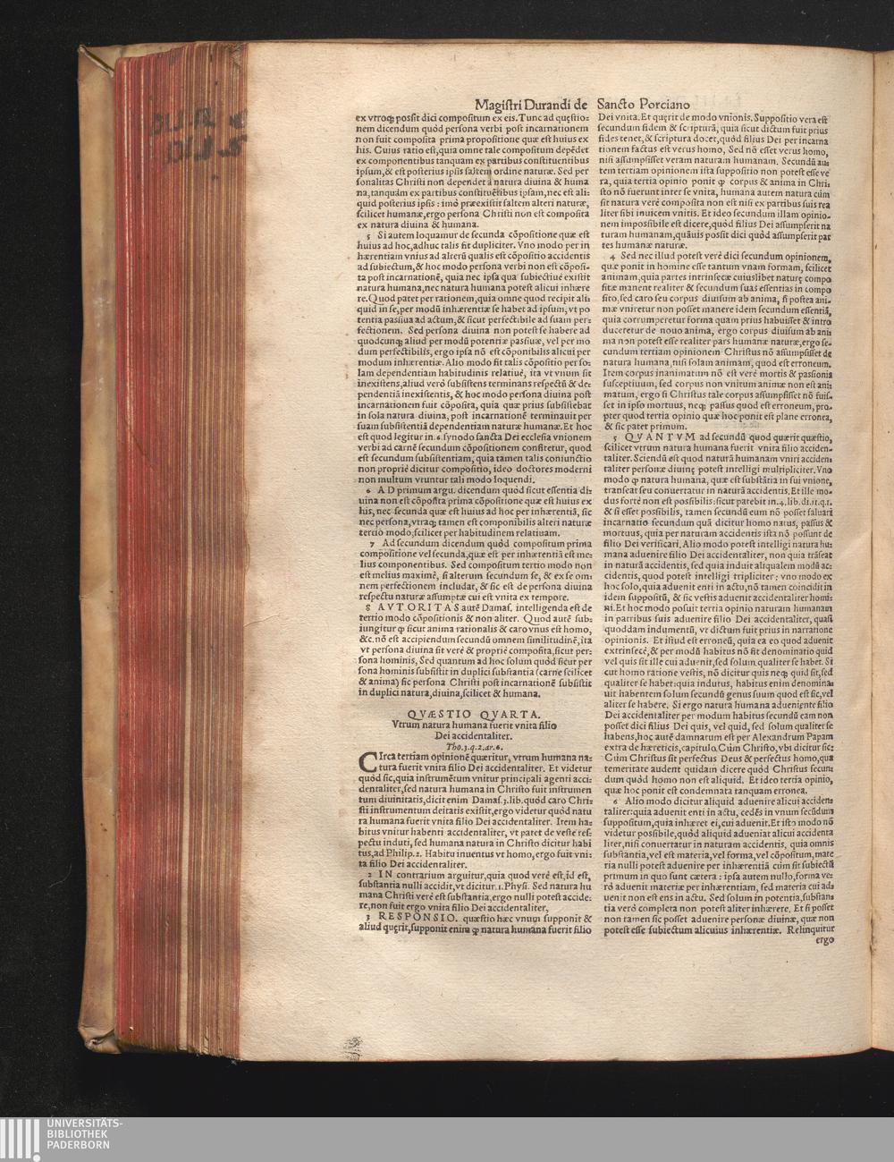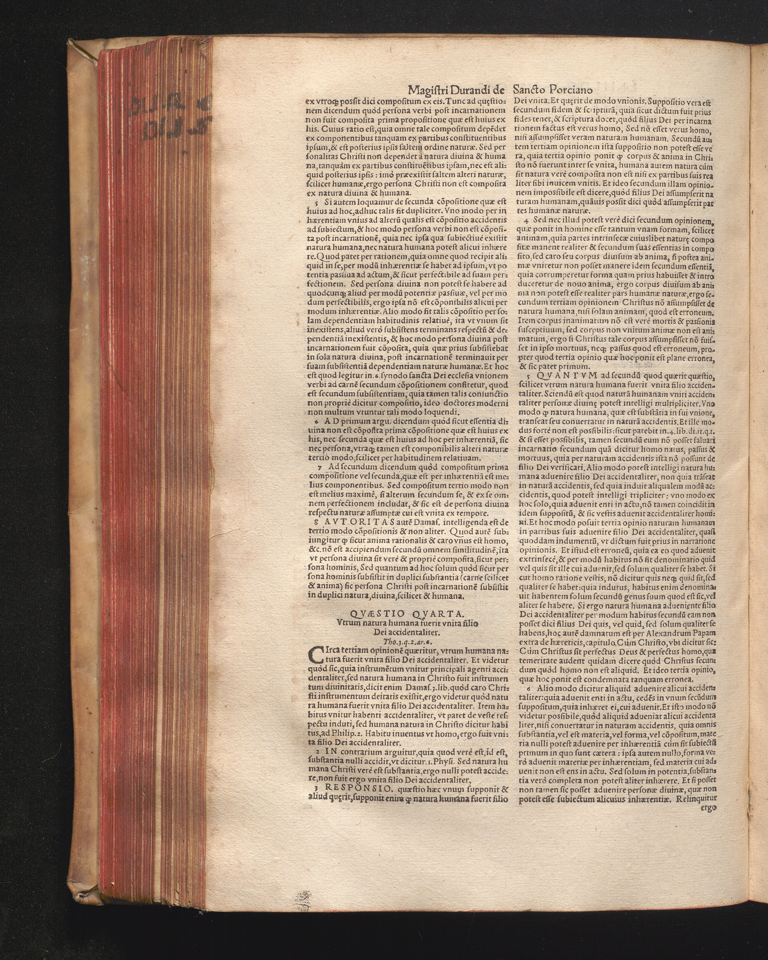 DN. DVRANDI|| à Sancto Portiano, in Senten=||tias Theologicas Petri Lombardi|| Commentariorum libri|| quatuor.|| / Primùm quidem per Nicolaum à Martimbos, eximium Nauarrensis|| Collegij Theologum, nunc verò denuo per alios quosdam|| non inferioris notæ Doctores quanta fieri po-||tuit cura diligentiáque emendati.|| Vná cum Auctoris Vita, & copiosissimo|| decisionum omnium|| Indice.||