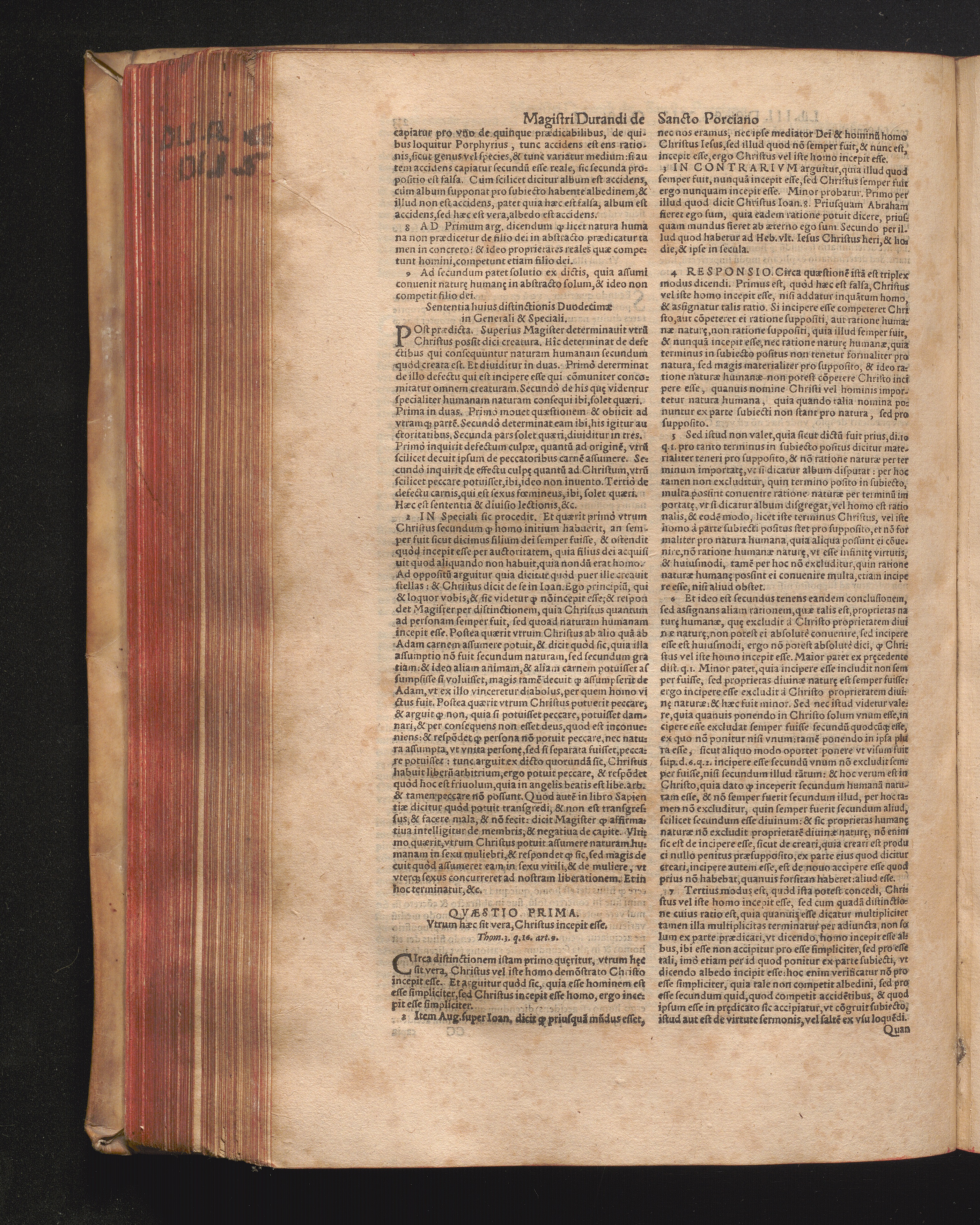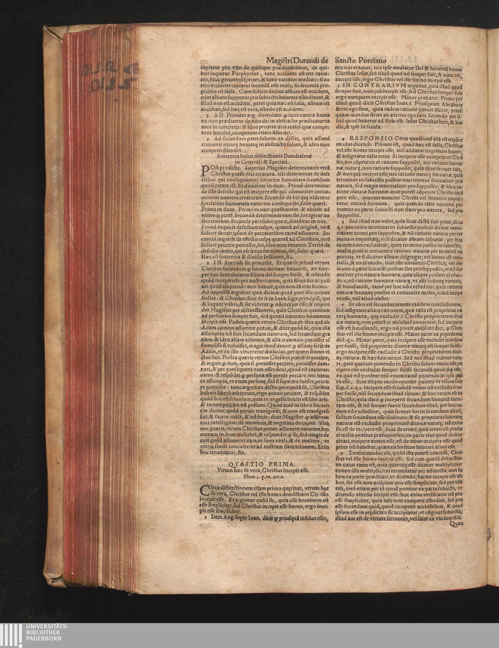 DN. DVRANDI|| à Sancto Portiano, in Senten=||tias Theologicas Petri Lombardi|| Commentariorum libri|| quatuor.|| / Primùm quidem per Nicolaum à Martimbos, eximium Nauarrensis|| Collegij Theologum, nunc verò denuo per alios quosdam|| non inferioris notæ Doctores quanta fieri po-||tuit cura diligentiáque emendati.|| Vná cum Auctoris Vita, & copiosissimo|| decisionum omnium|| Indice.||