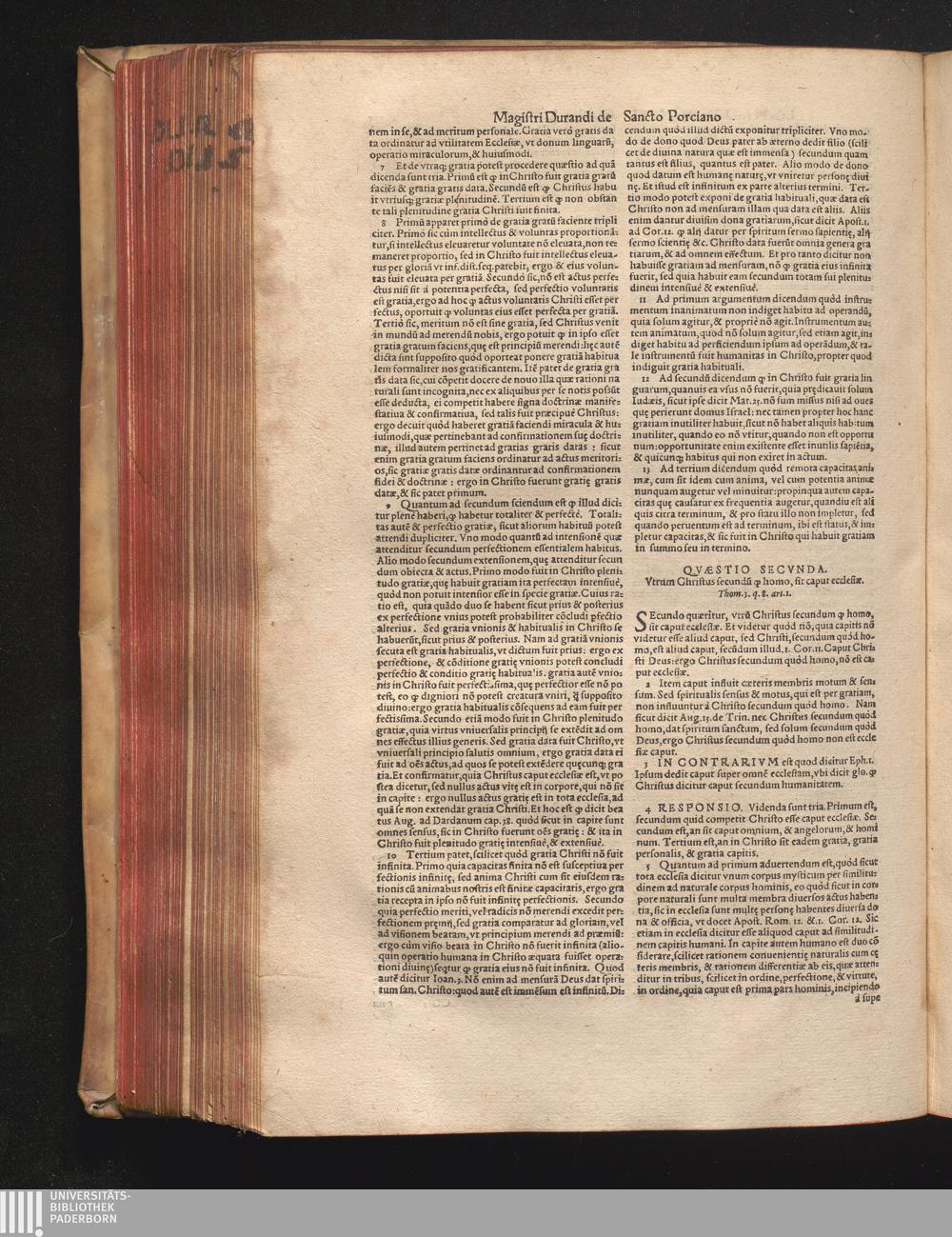 DN. DVRANDI|| à Sancto Portiano, in Senten=||tias Theologicas Petri Lombardi|| Commentariorum libri|| quatuor.|| / Primùm quidem per Nicolaum à Martimbos, eximium Nauarrensis|| Collegij Theologum, nunc verò denuo per alios quosdam|| non inferioris notæ Doctores quanta fieri po-||tuit cura diligentiáque emendati.|| Vná cum Auctoris Vita, & copiosissimo|| decisionum omnium|| Indice.||
