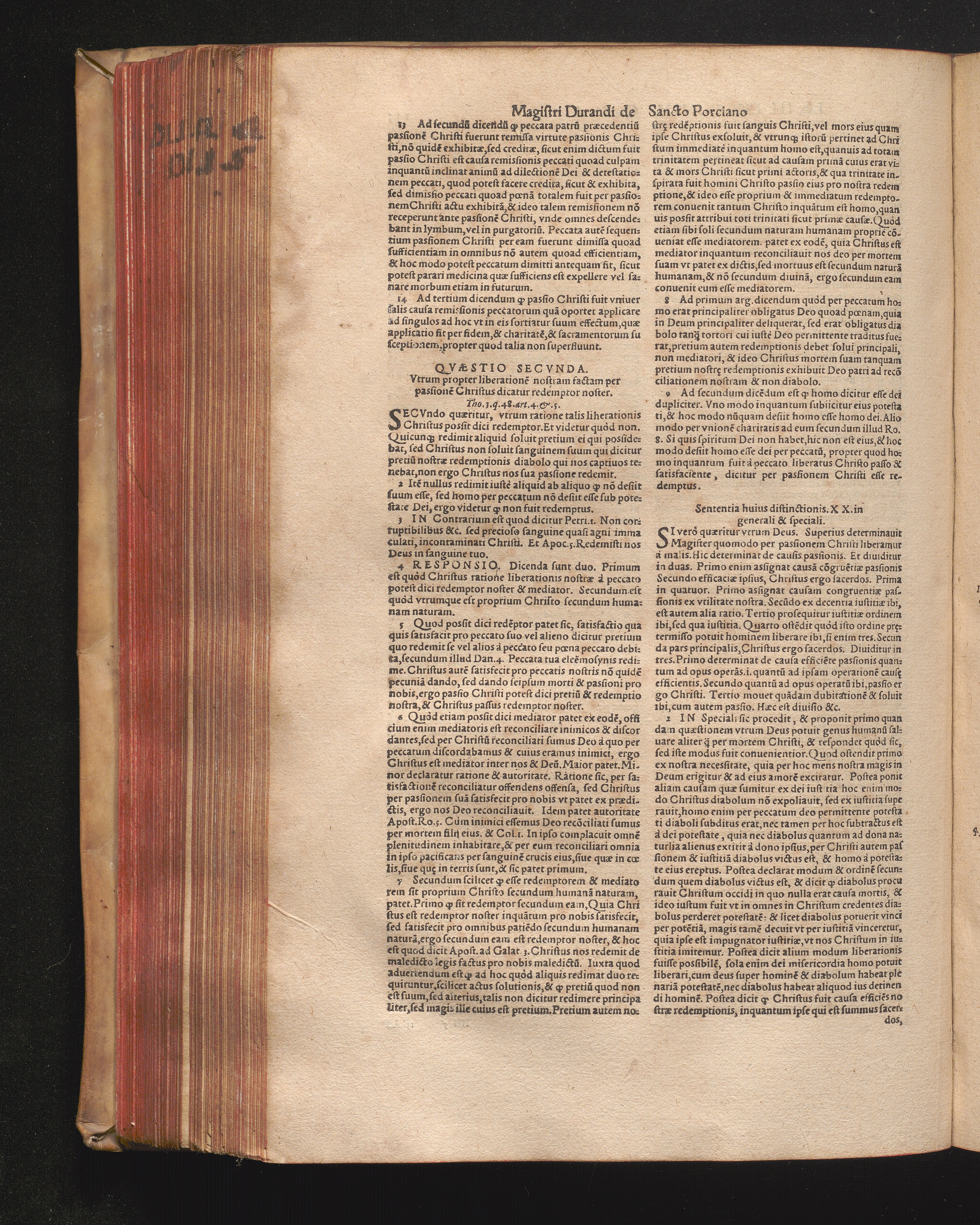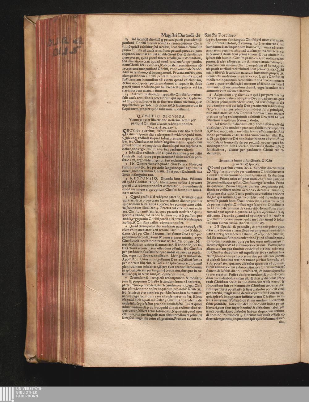 DN. DVRANDI|| à Sancto Portiano, in Senten=||tias Theologicas Petri Lombardi|| Commentariorum libri|| quatuor.|| / Primùm quidem per Nicolaum à Martimbos, eximium Nauarrensis|| Collegij Theologum, nunc verò denuo per alios quosdam|| non inferioris notæ Doctores quanta fieri po-||tuit cura diligentiáque emendati.|| Vná cum Auctoris Vita, & copiosissimo|| decisionum omnium|| Indice.||