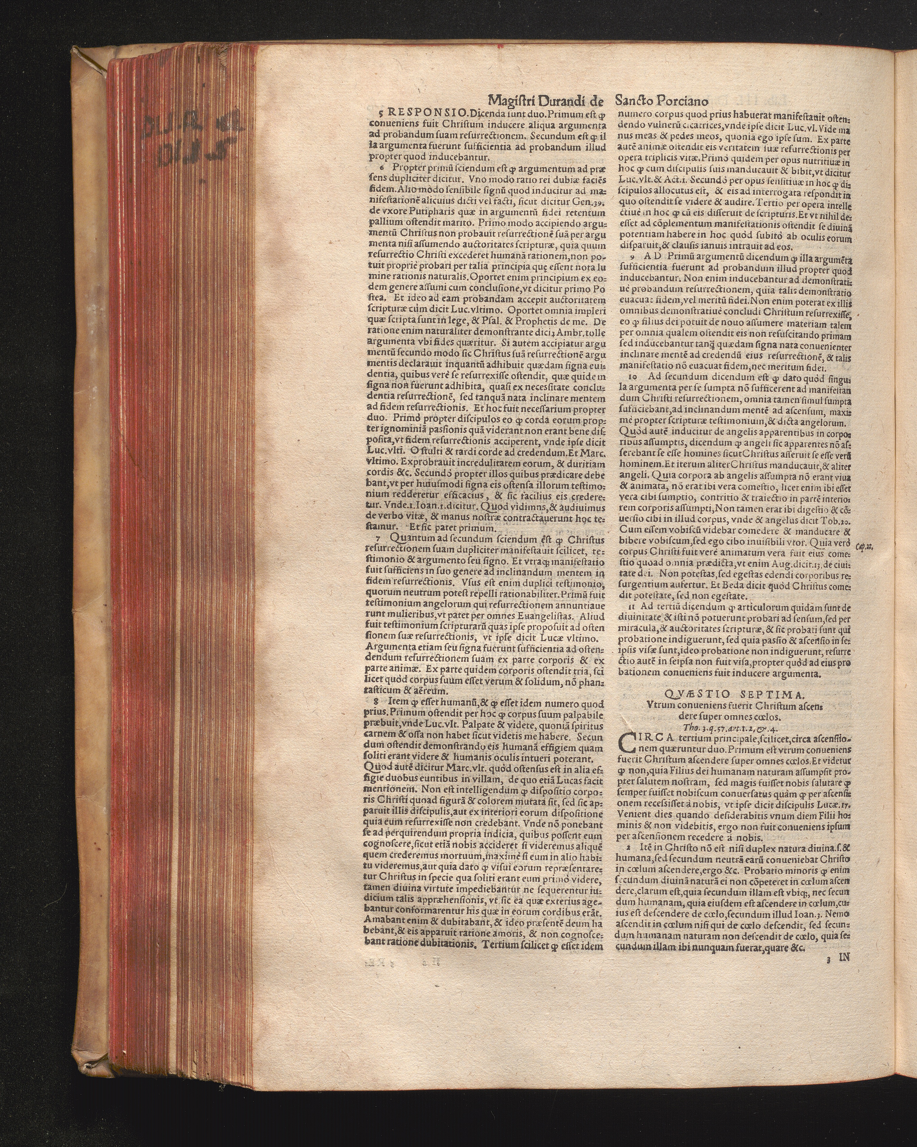 DN. DVRANDI|| à Sancto Portiano, in Senten=||tias Theologicas Petri Lombardi|| Commentariorum libri|| quatuor.|| / Primùm quidem per Nicolaum à Martimbos, eximium Nauarrensis|| Collegij Theologum, nunc verò denuo per alios quosdam|| non inferioris notæ Doctores quanta fieri po-||tuit cura diligentiáque emendati.|| Vná cum Auctoris Vita, & copiosissimo|| decisionum omnium|| Indice.||