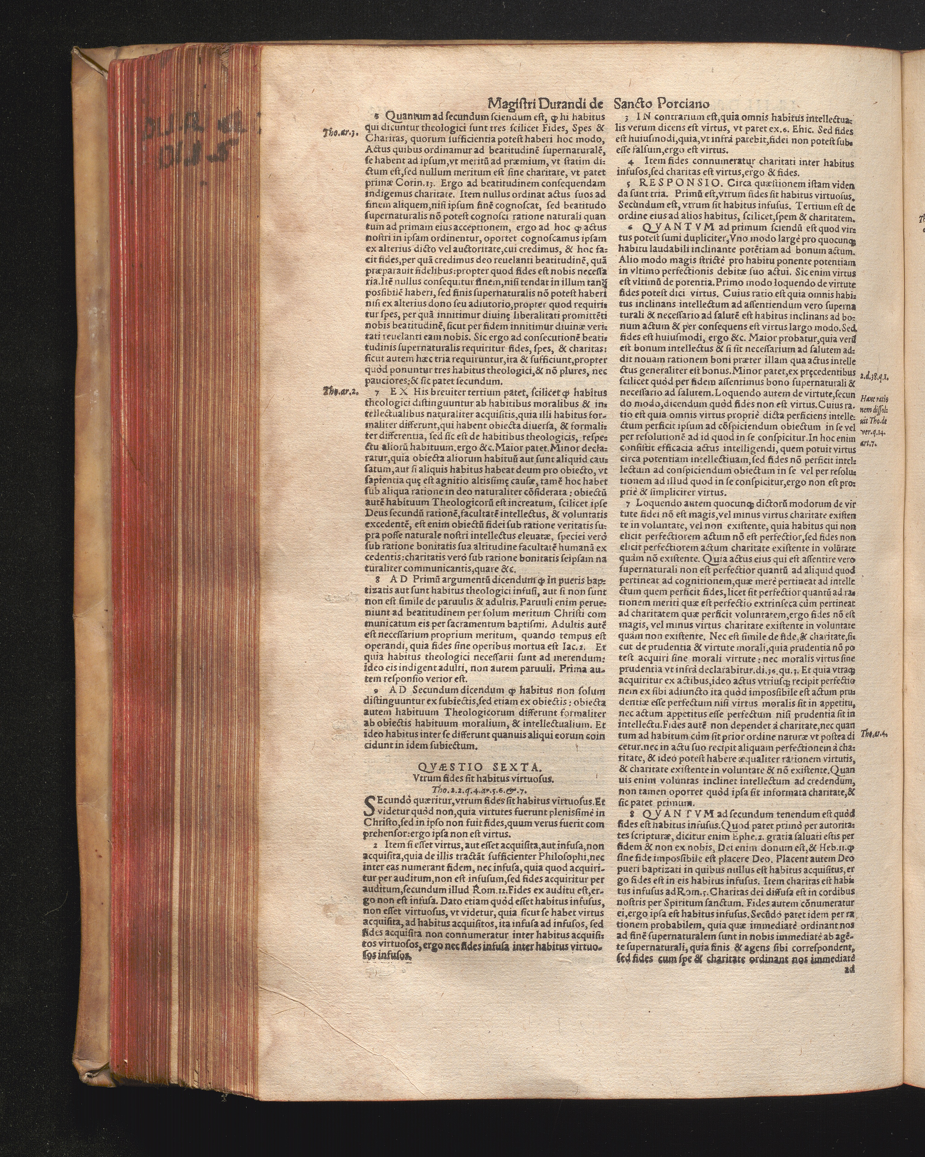 DN. DVRANDI|| à Sancto Portiano, in Senten=||tias Theologicas Petri Lombardi|| Commentariorum libri|| quatuor.|| / Primùm quidem per Nicolaum à Martimbos, eximium Nauarrensis|| Collegij Theologum, nunc verò denuo per alios quosdam|| non inferioris notæ Doctores quanta fieri po-||tuit cura diligentiáque emendati.|| Vná cum Auctoris Vita, & copiosissimo|| decisionum omnium|| Indice.||