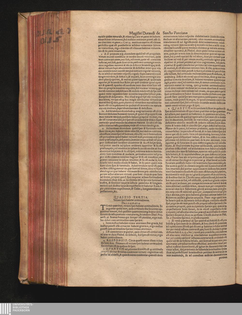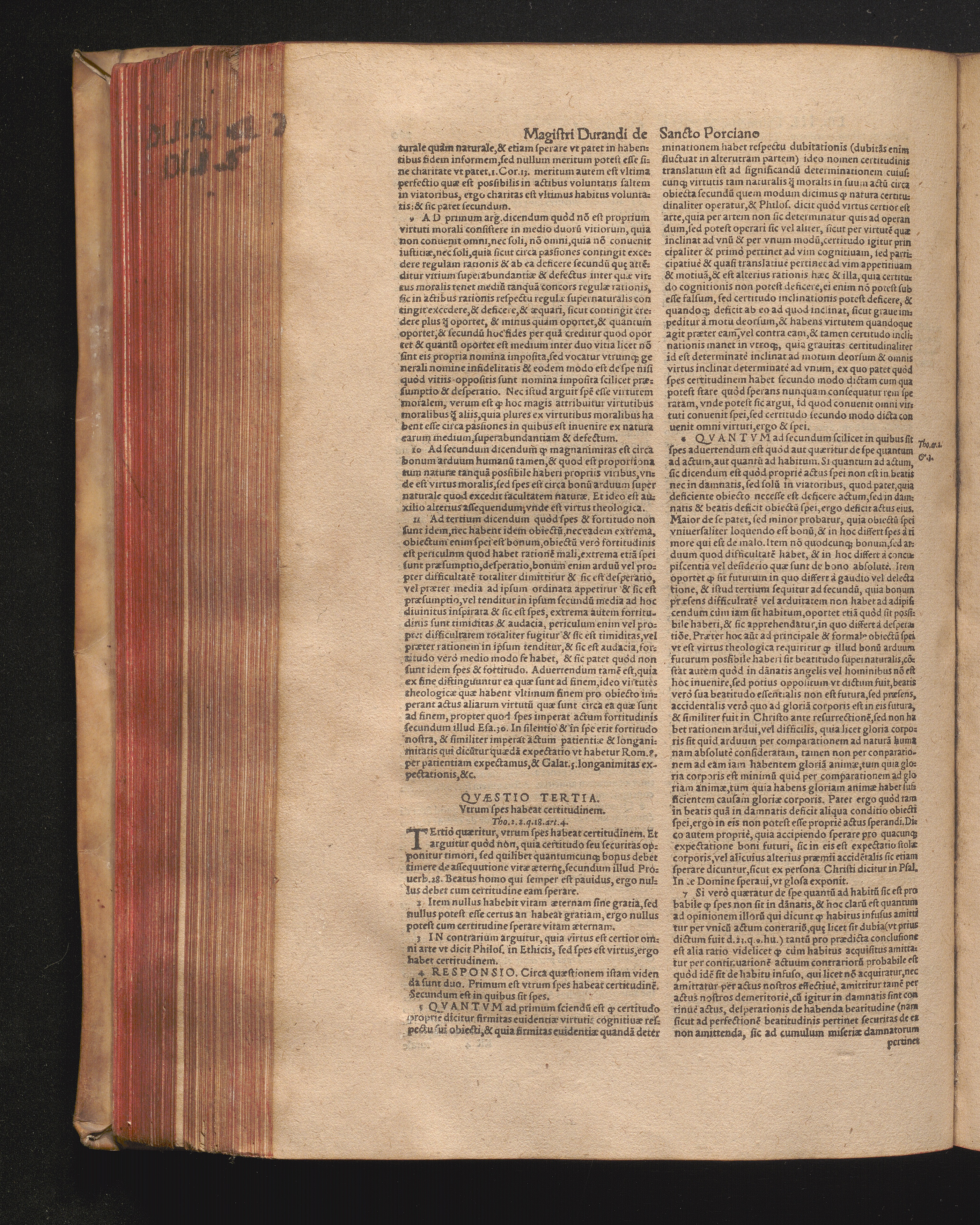 DN. DVRANDI|| à Sancto Portiano, in Senten=||tias Theologicas Petri Lombardi|| Commentariorum libri|| quatuor.|| / Primùm quidem per Nicolaum à Martimbos, eximium Nauarrensis|| Collegij Theologum, nunc verò denuo per alios quosdam|| non inferioris notæ Doctores quanta fieri po-||tuit cura diligentiáque emendati.|| Vná cum Auctoris Vita, & copiosissimo|| decisionum omnium|| Indice.||