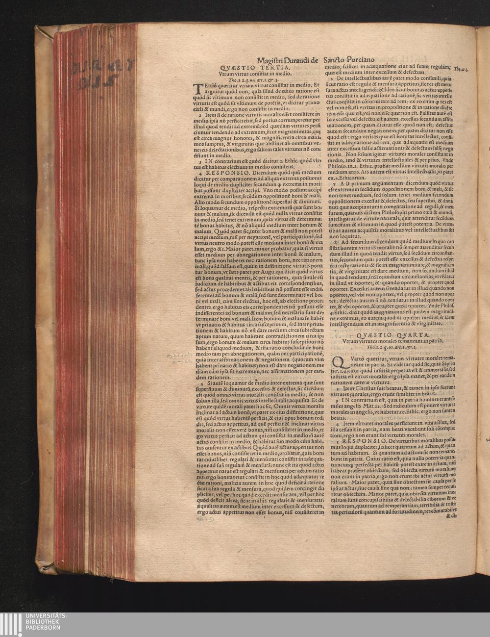 DN. DVRANDI|| à Sancto Portiano, in Senten=||tias Theologicas Petri Lombardi|| Commentariorum libri|| quatuor.|| / Primùm quidem per Nicolaum à Martimbos, eximium Nauarrensis|| Collegij Theologum, nunc verò denuo per alios quosdam|| non inferioris notæ Doctores quanta fieri po-||tuit cura diligentiáque emendati.|| Vná cum Auctoris Vita, & copiosissimo|| decisionum omnium|| Indice.||