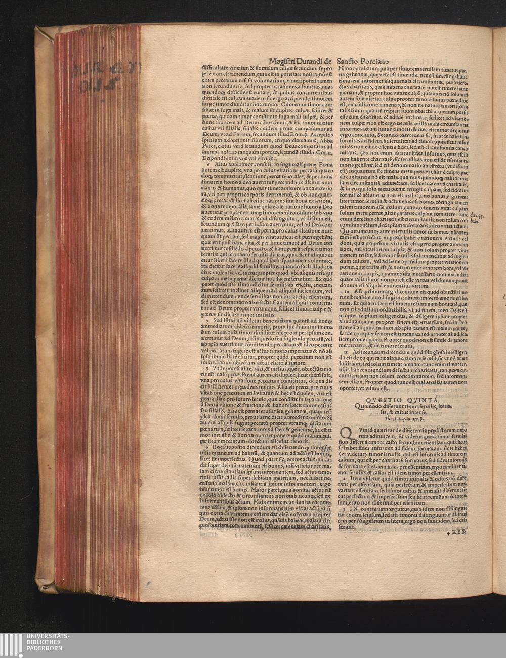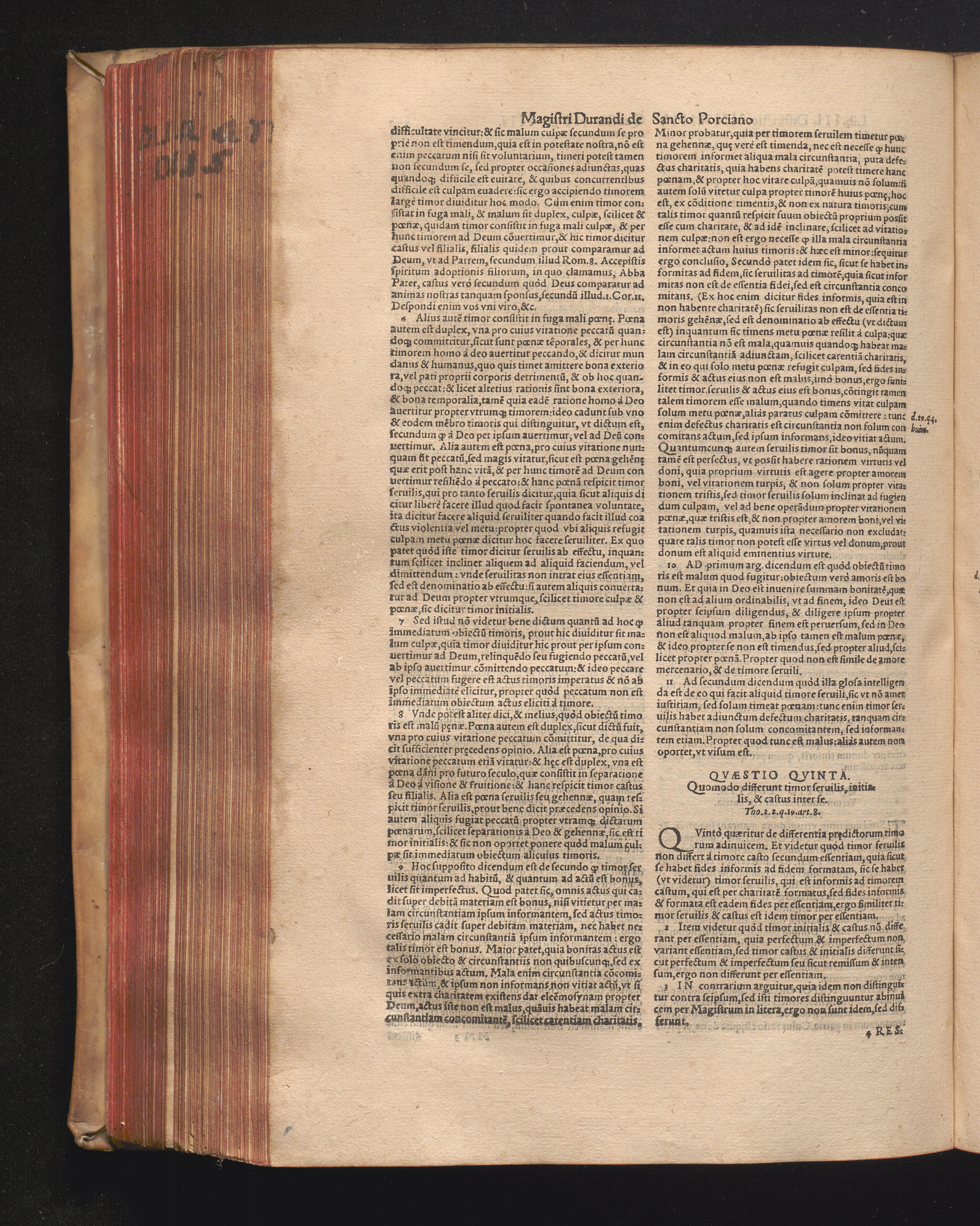 DN. DVRANDI|| à Sancto Portiano, in Senten=||tias Theologicas Petri Lombardi|| Commentariorum libri|| quatuor.|| / Primùm quidem per Nicolaum à Martimbos, eximium Nauarrensis|| Collegij Theologum, nunc verò denuo per alios quosdam|| non inferioris notæ Doctores quanta fieri po-||tuit cura diligentiáque emendati.|| Vná cum Auctoris Vita, & copiosissimo|| decisionum omnium|| Indice.||