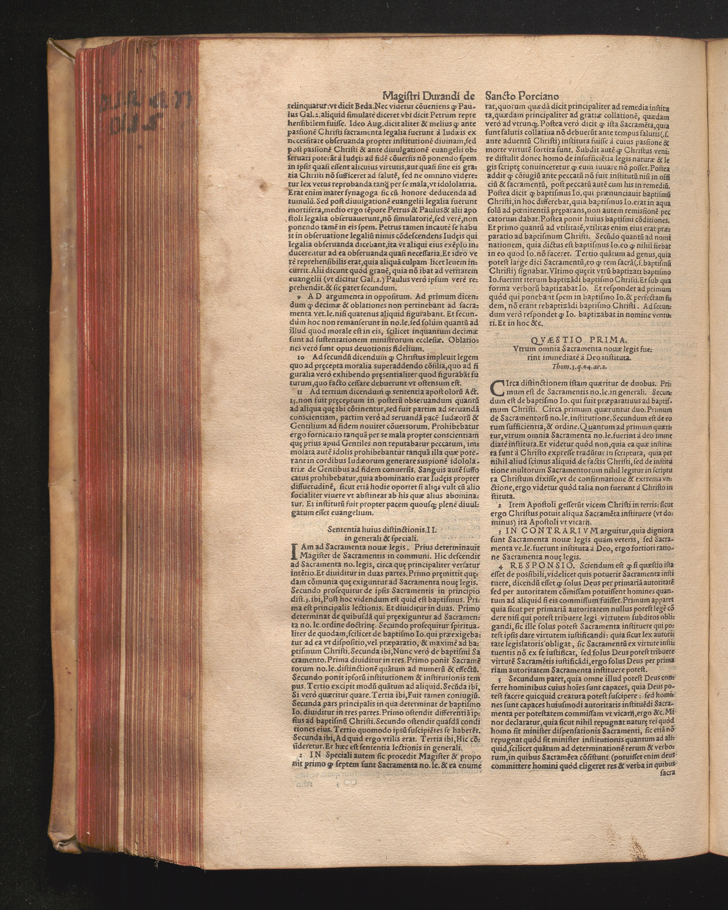 DN. DVRANDI|| à Sancto Portiano, in Senten=||tias Theologicas Petri Lombardi|| Commentariorum libri|| quatuor.|| / Primùm quidem per Nicolaum à Martimbos, eximium Nauarrensis|| Collegij Theologum, nunc verò denuo per alios quosdam|| non inferioris notæ Doctores quanta fieri po-||tuit cura diligentiáque emendati.|| Vná cum Auctoris Vita, & copiosissimo|| decisionum omnium|| Indice.||