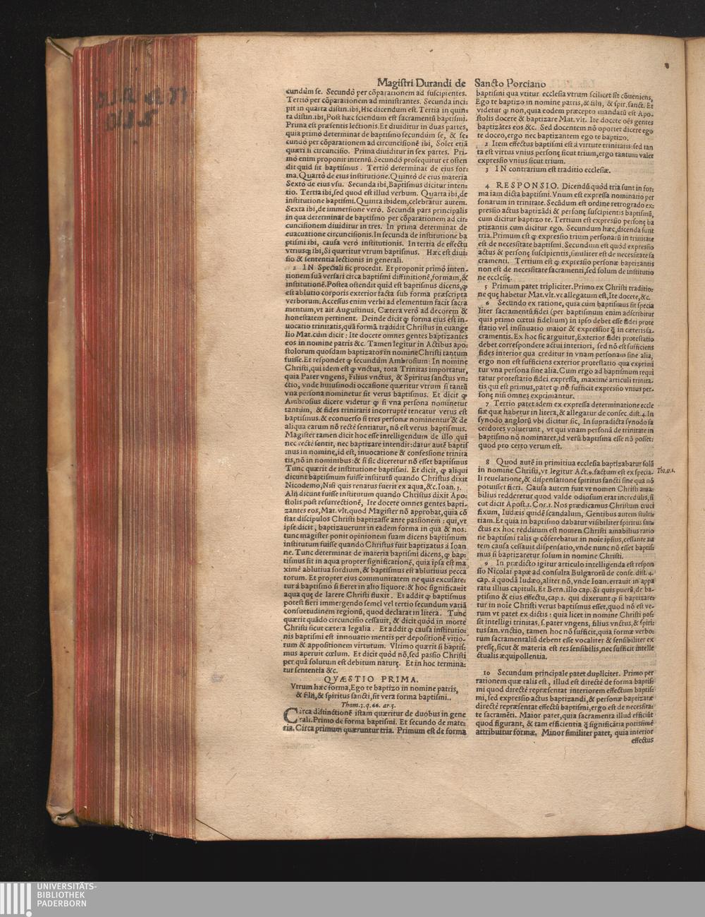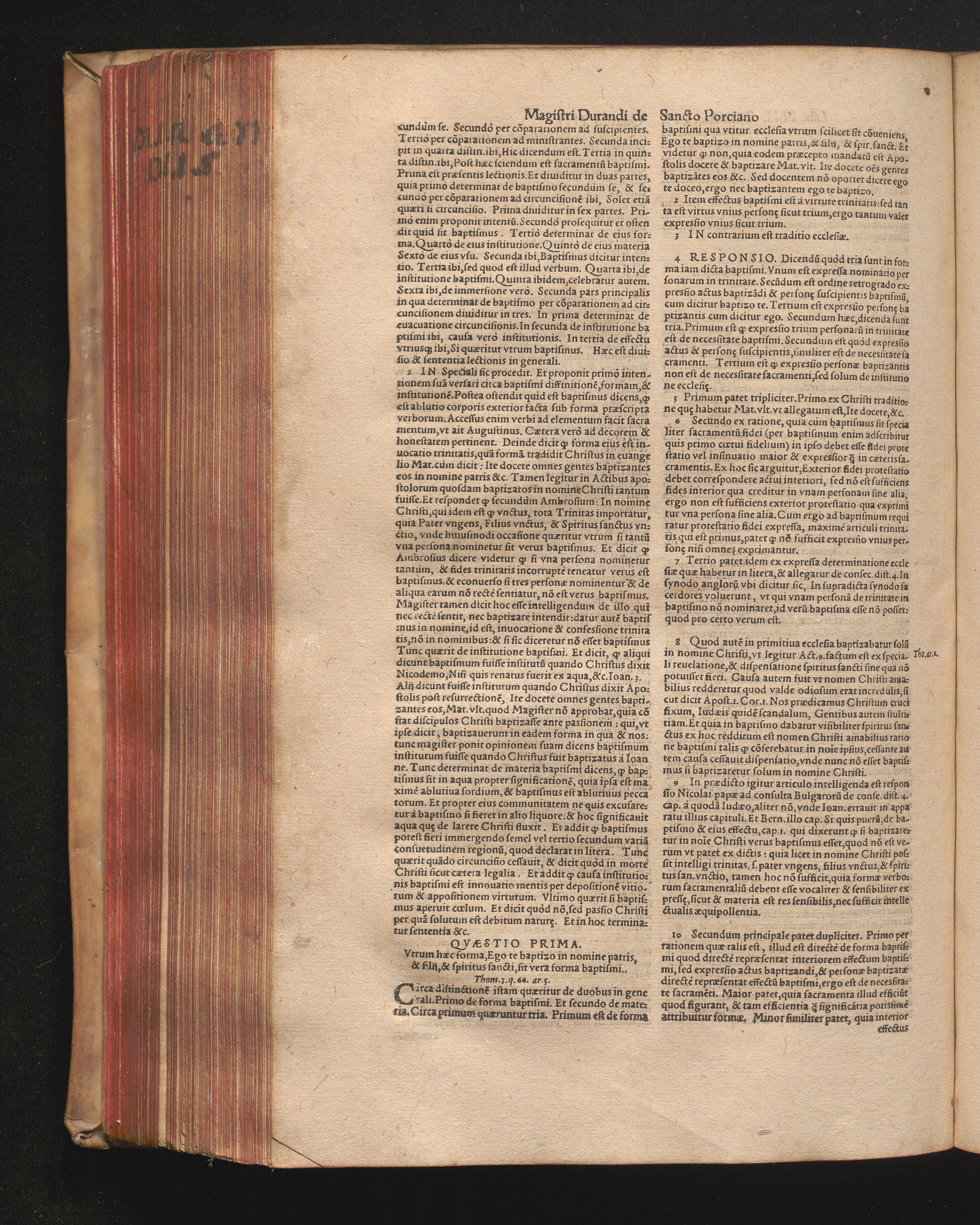 DN. DVRANDI|| à Sancto Portiano, in Senten=||tias Theologicas Petri Lombardi|| Commentariorum libri|| quatuor.|| / Primùm quidem per Nicolaum à Martimbos, eximium Nauarrensis|| Collegij Theologum, nunc verò denuo per alios quosdam|| non inferioris notæ Doctores quanta fieri po-||tuit cura diligentiáque emendati.|| Vná cum Auctoris Vita, & copiosissimo|| decisionum omnium|| Indice.||