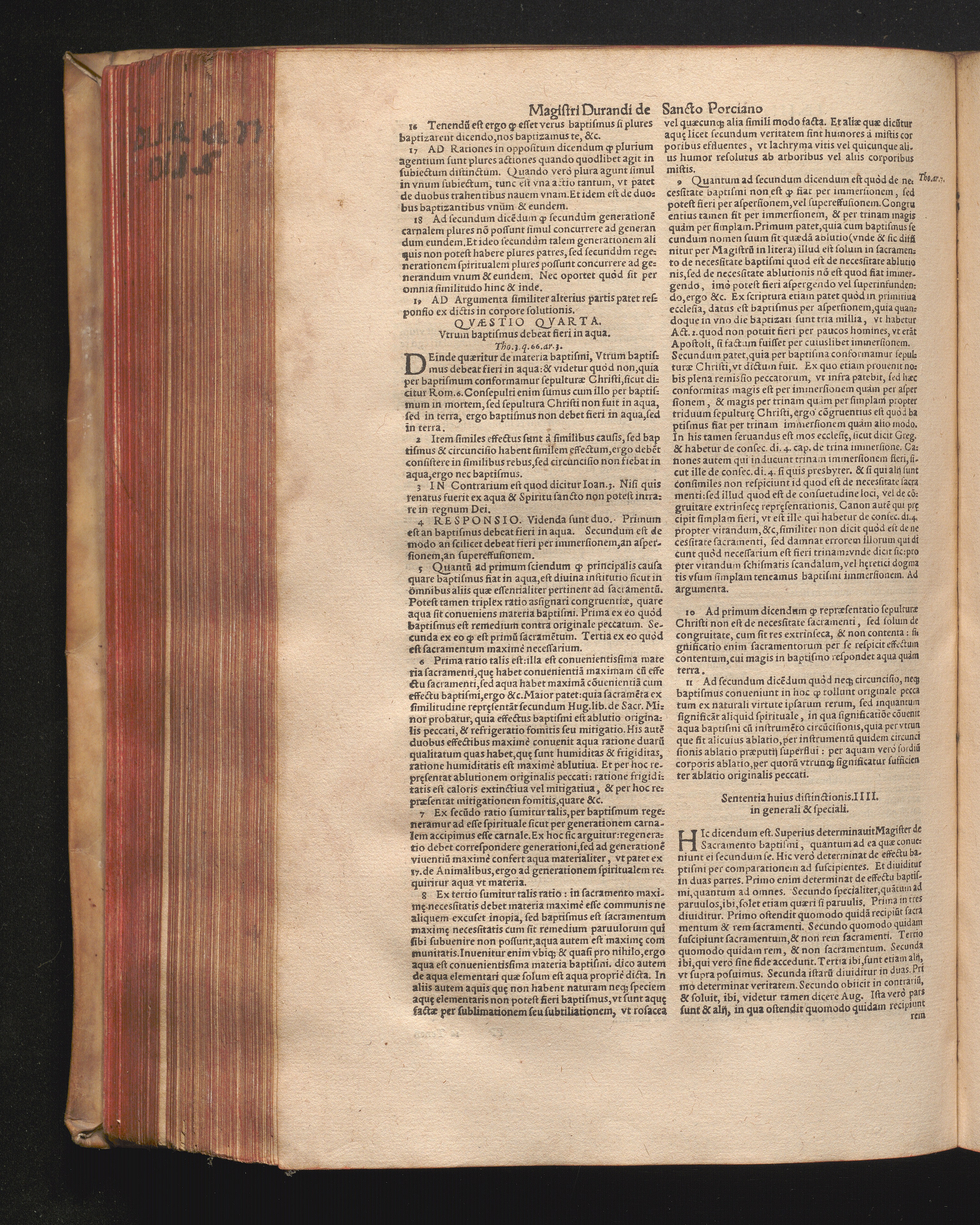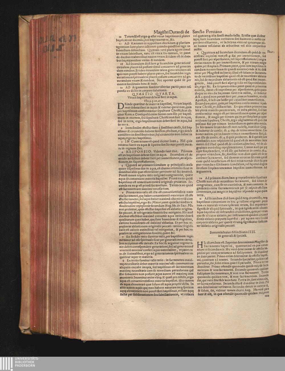 DN. DVRANDI|| à Sancto Portiano, in Senten=||tias Theologicas Petri Lombardi|| Commentariorum libri|| quatuor.|| / Primùm quidem per Nicolaum à Martimbos, eximium Nauarrensis|| Collegij Theologum, nunc verò denuo per alios quosdam|| non inferioris notæ Doctores quanta fieri po-||tuit cura diligentiáque emendati.|| Vná cum Auctoris Vita, & copiosissimo|| decisionum omnium|| Indice.||