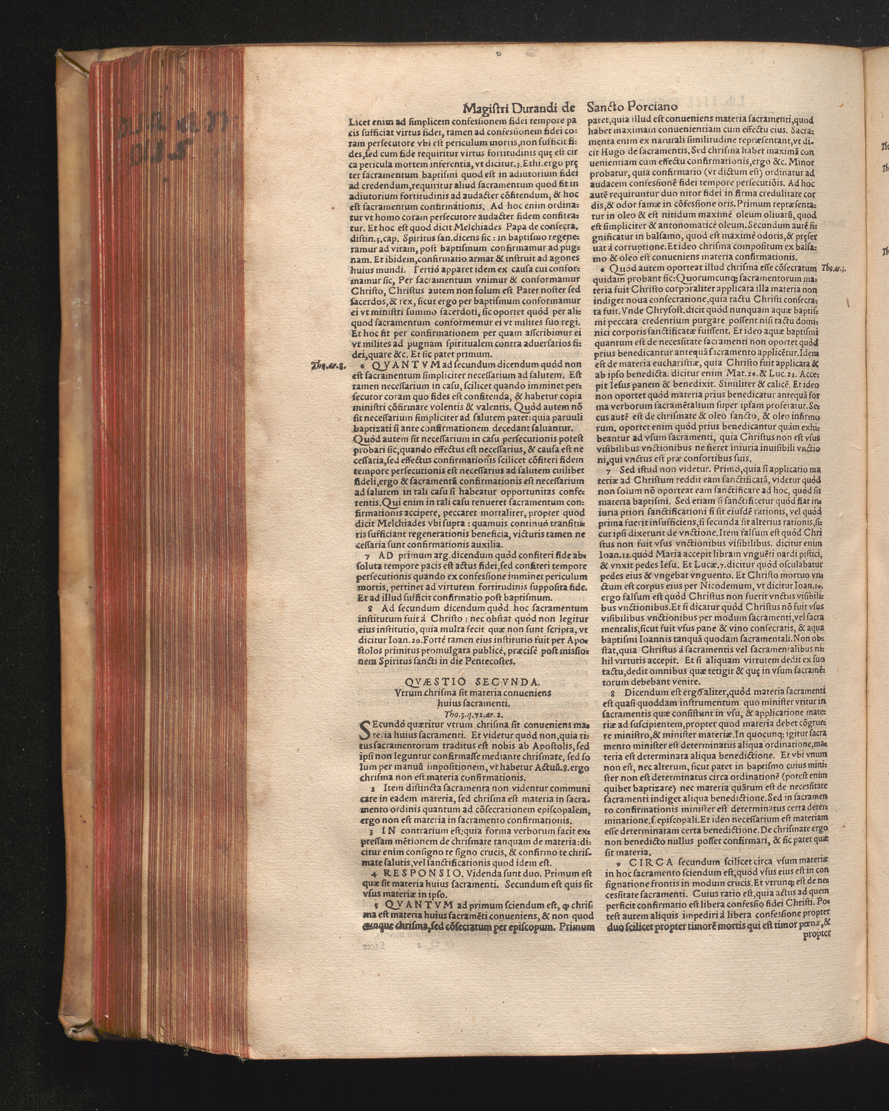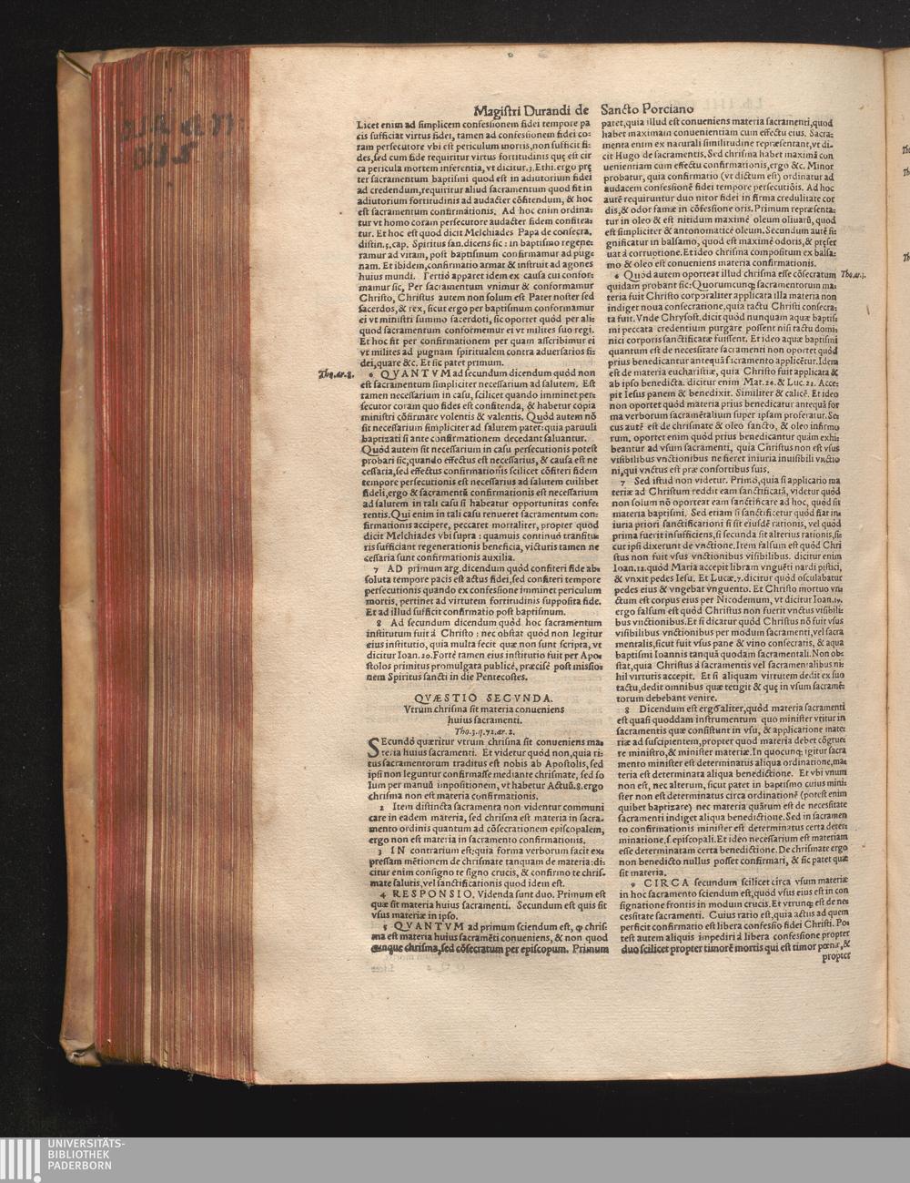 DN. DVRANDI|| à Sancto Portiano, in Senten=||tias Theologicas Petri Lombardi|| Commentariorum libri|| quatuor.|| / Primùm quidem per Nicolaum à Martimbos, eximium Nauarrensis|| Collegij Theologum, nunc verò denuo per alios quosdam|| non inferioris notæ Doctores quanta fieri po-||tuit cura diligentiáque emendati.|| Vná cum Auctoris Vita, & copiosissimo|| decisionum omnium|| Indice.||