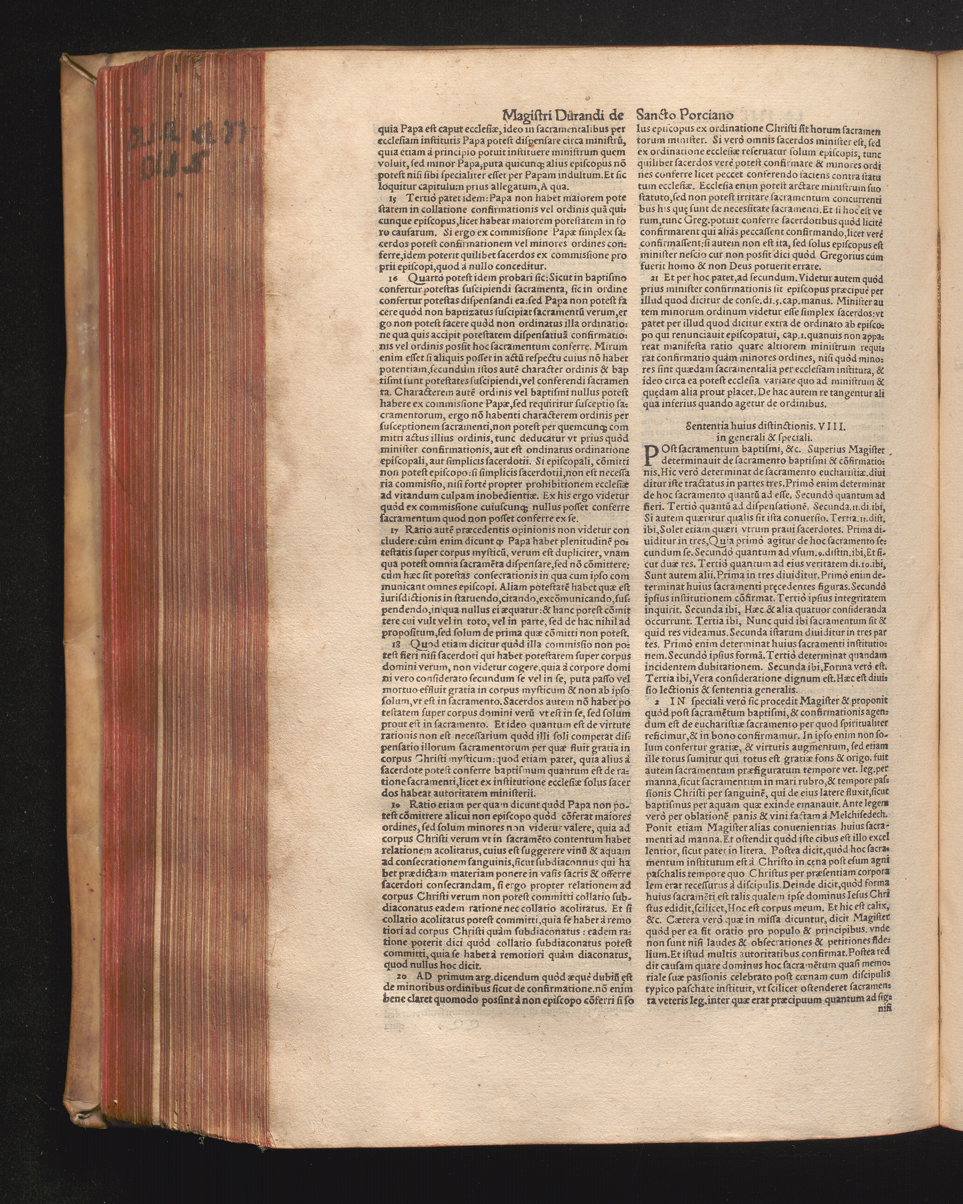 DN. DVRANDI|| à Sancto Portiano, in Senten=||tias Theologicas Petri Lombardi|| Commentariorum libri|| quatuor.|| / Primùm quidem per Nicolaum à Martimbos, eximium Nauarrensis|| Collegij Theologum, nunc verò denuo per alios quosdam|| non inferioris notæ Doctores quanta fieri po-||tuit cura diligentiáque emendati.|| Vná cum Auctoris Vita, & copiosissimo|| decisionum omnium|| Indice.||