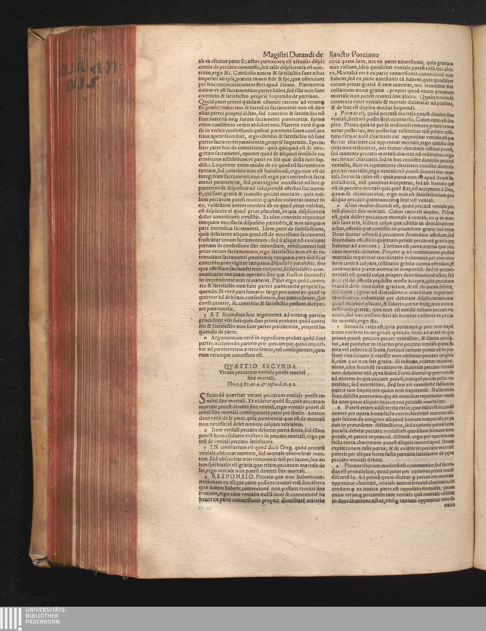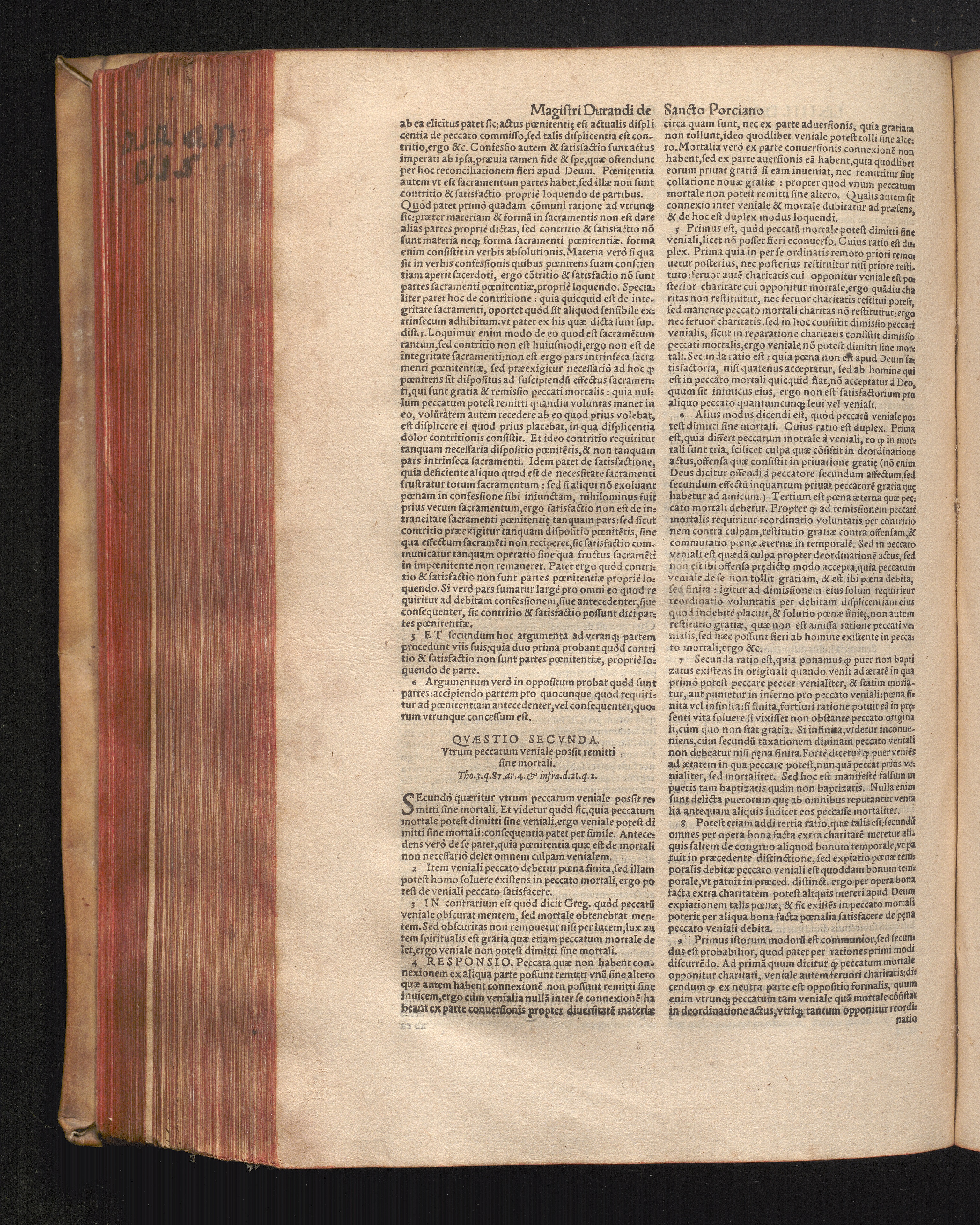 DN. DVRANDI|| à Sancto Portiano, in Senten=||tias Theologicas Petri Lombardi|| Commentariorum libri|| quatuor.|| / Primùm quidem per Nicolaum à Martimbos, eximium Nauarrensis|| Collegij Theologum, nunc verò denuo per alios quosdam|| non inferioris notæ Doctores quanta fieri po-||tuit cura diligentiáque emendati.|| Vná cum Auctoris Vita, & copiosissimo|| decisionum omnium|| Indice.||