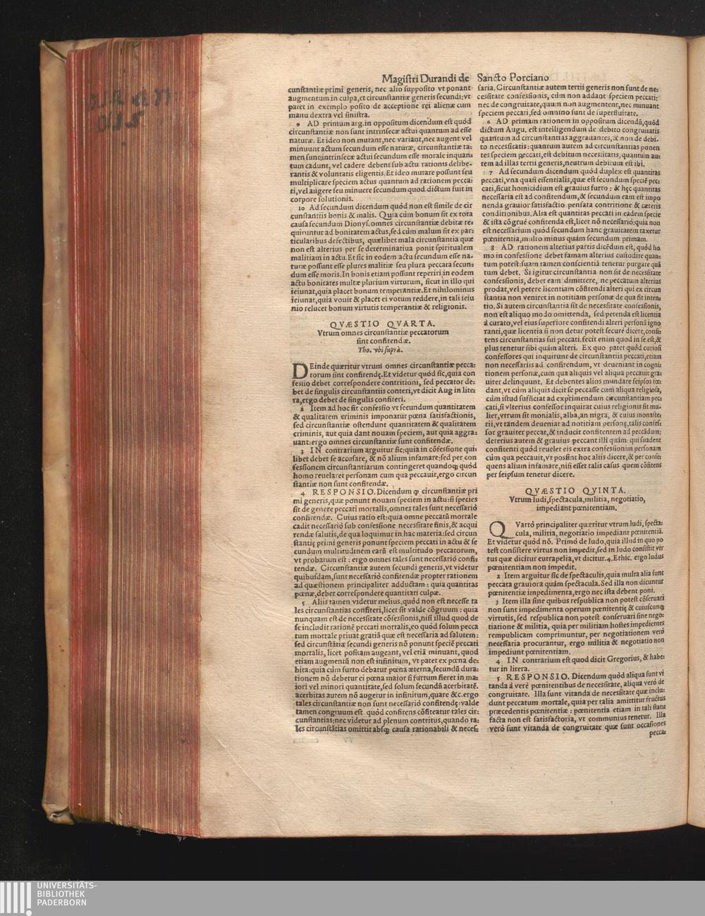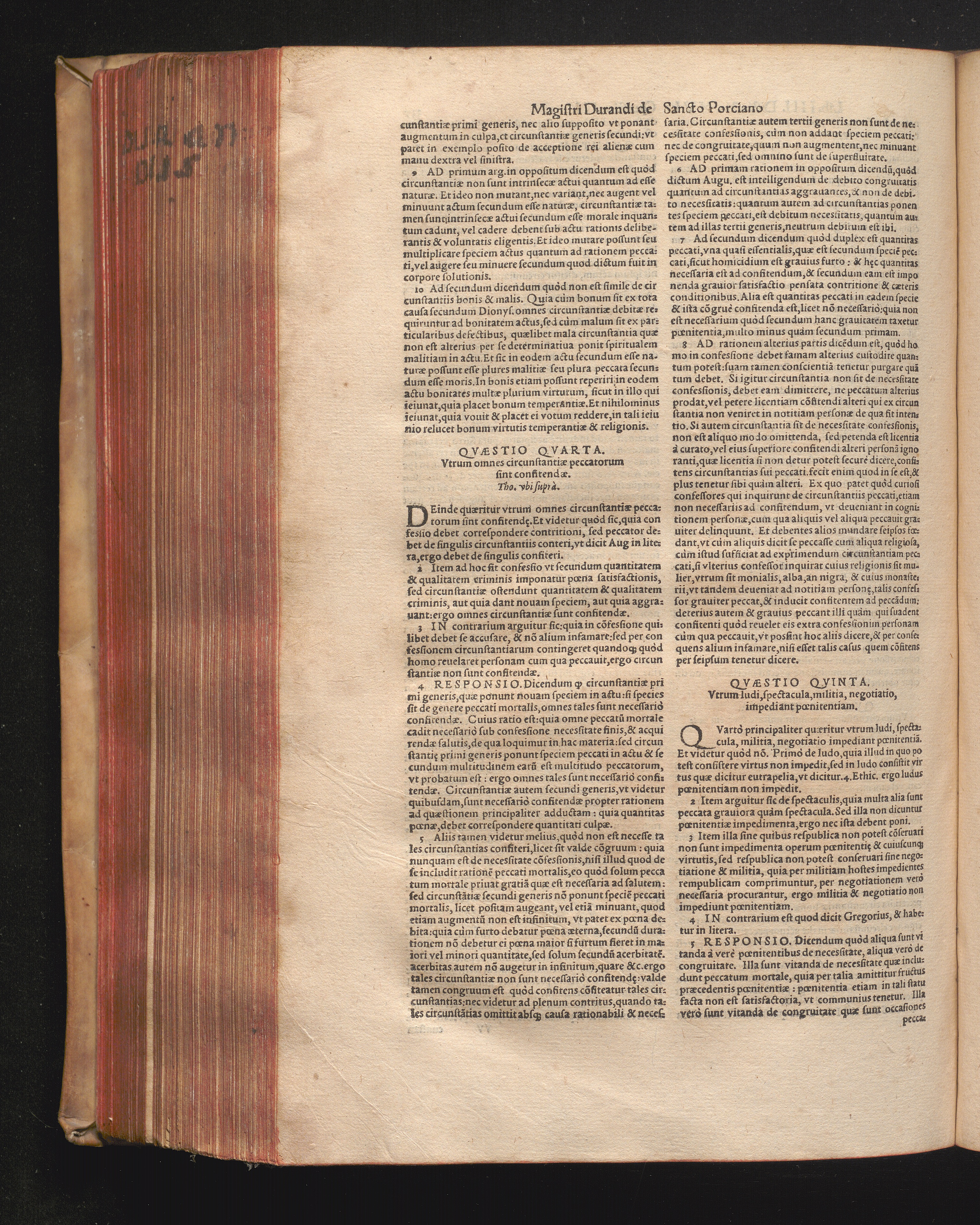 DN. DVRANDI|| à Sancto Portiano, in Senten=||tias Theologicas Petri Lombardi|| Commentariorum libri|| quatuor.|| / Primùm quidem per Nicolaum à Martimbos, eximium Nauarrensis|| Collegij Theologum, nunc verò denuo per alios quosdam|| non inferioris notæ Doctores quanta fieri po-||tuit cura diligentiáque emendati.|| Vná cum Auctoris Vita, & copiosissimo|| decisionum omnium|| Indice.||
