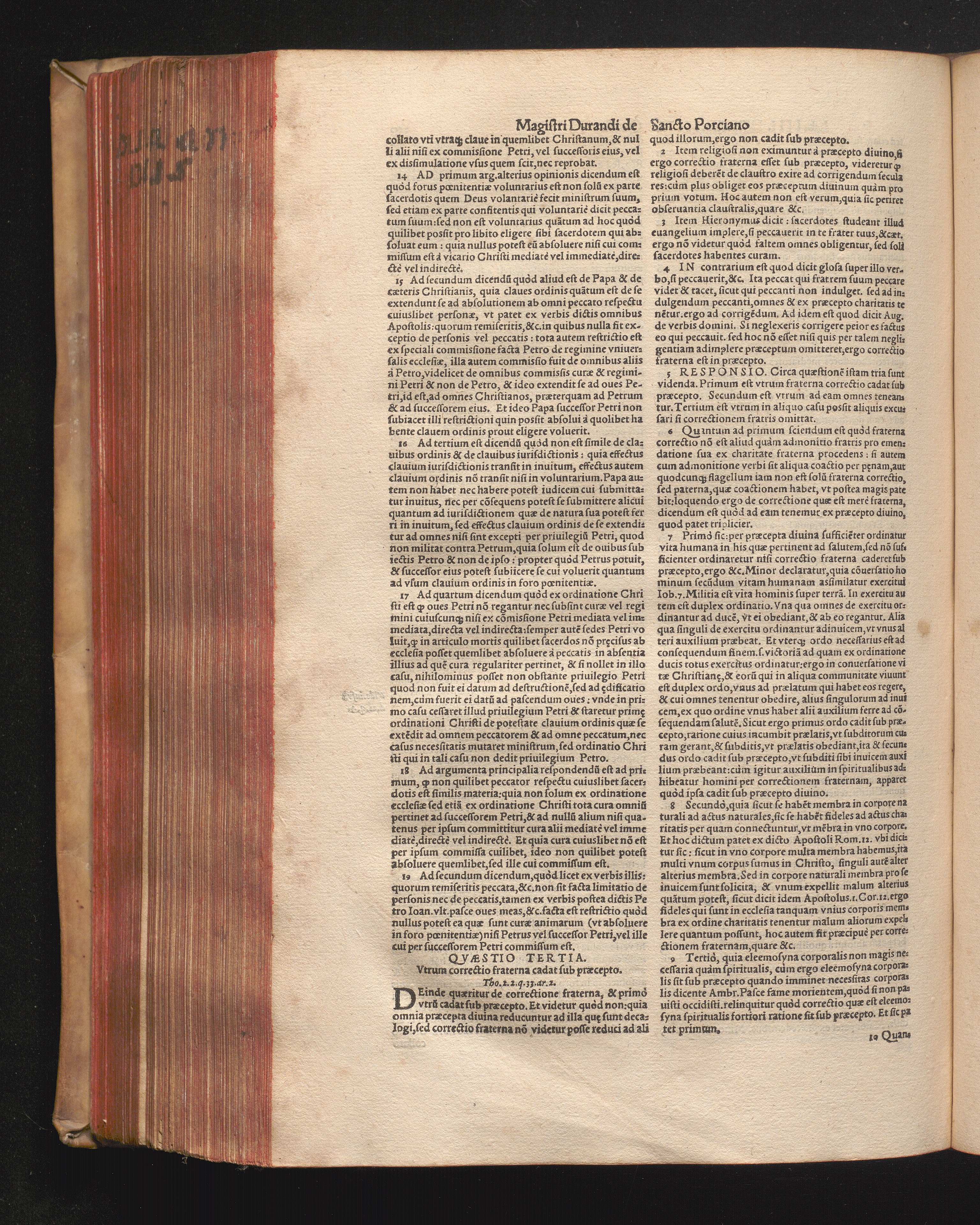 DN. DVRANDI|| à Sancto Portiano, in Senten=||tias Theologicas Petri Lombardi|| Commentariorum libri|| quatuor.|| / Primùm quidem per Nicolaum à Martimbos, eximium Nauarrensis|| Collegij Theologum, nunc verò denuo per alios quosdam|| non inferioris notæ Doctores quanta fieri po-||tuit cura diligentiáque emendati.|| Vná cum Auctoris Vita, & copiosissimo|| decisionum omnium|| Indice.||