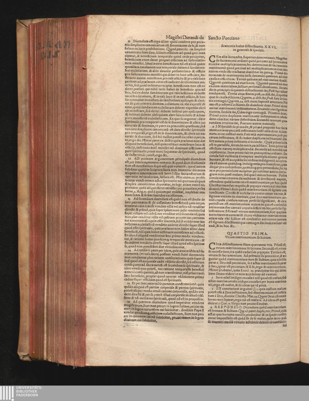 DN. DVRANDI|| à Sancto Portiano, in Senten=||tias Theologicas Petri Lombardi|| Commentariorum libri|| quatuor.|| / Primùm quidem per Nicolaum à Martimbos, eximium Nauarrensis|| Collegij Theologum, nunc verò denuo per alios quosdam|| non inferioris notæ Doctores quanta fieri po-||tuit cura diligentiáque emendati.|| Vná cum Auctoris Vita, & copiosissimo|| decisionum omnium|| Indice.||