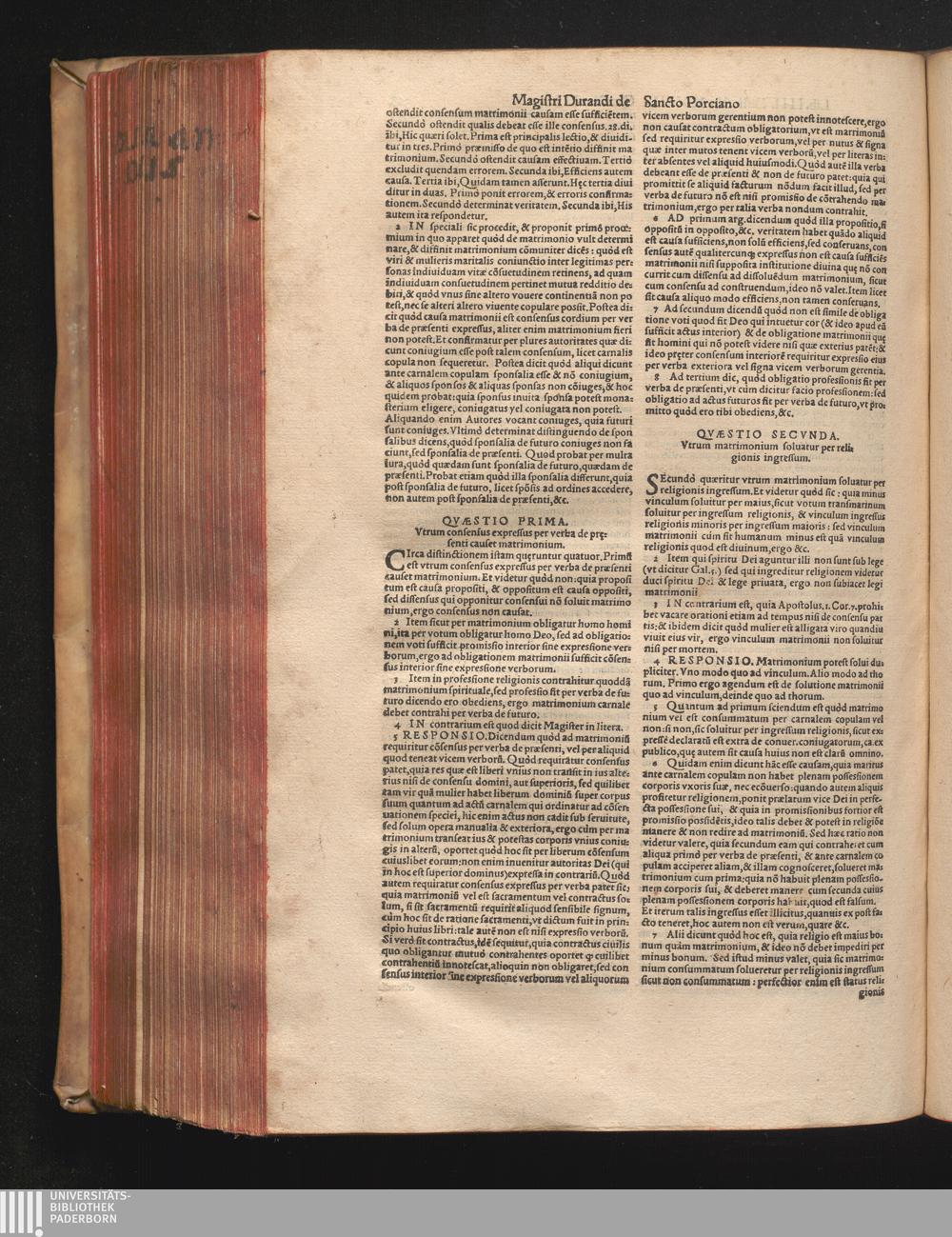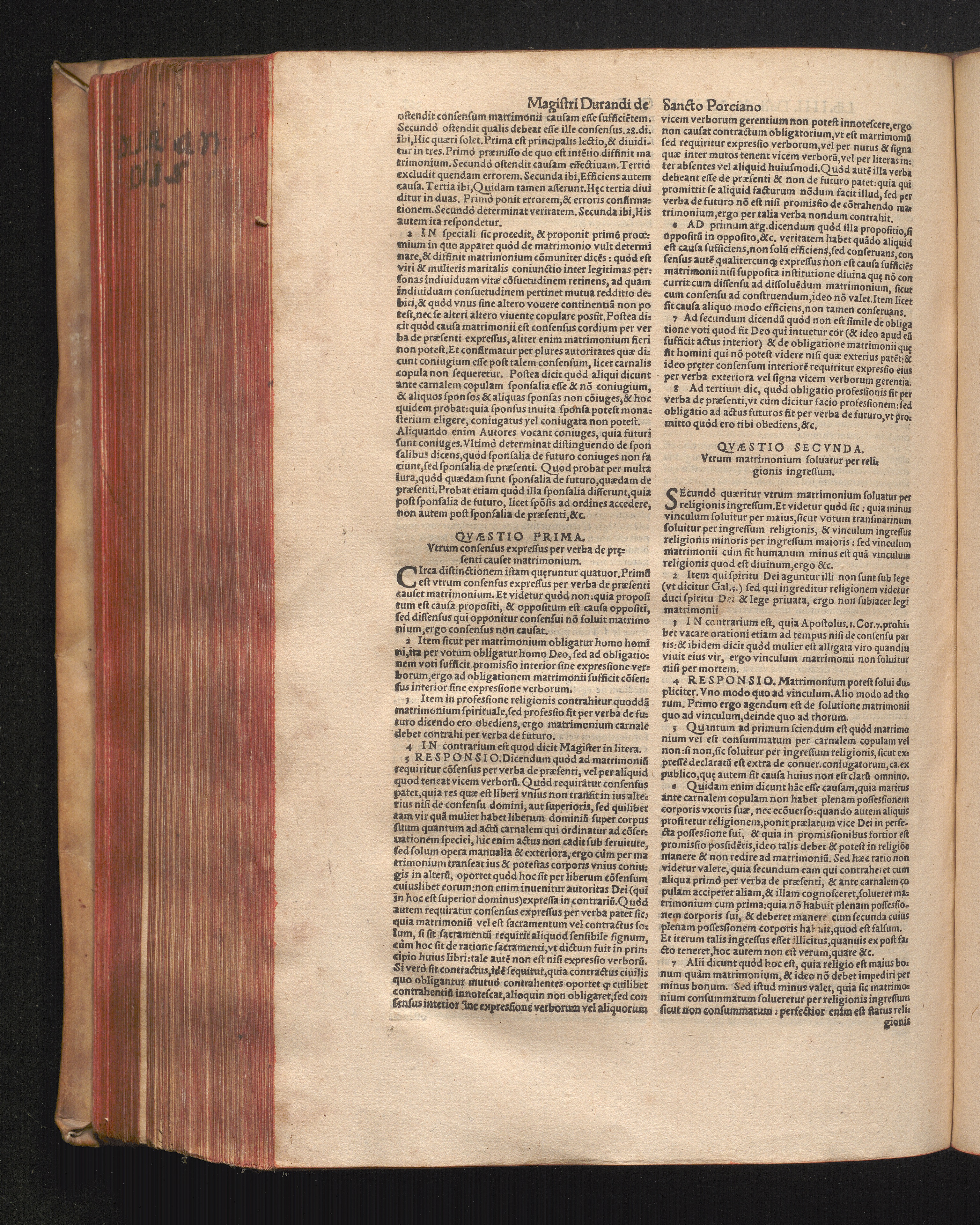 DN. DVRANDI|| à Sancto Portiano, in Senten=||tias Theologicas Petri Lombardi|| Commentariorum libri|| quatuor.|| / Primùm quidem per Nicolaum à Martimbos, eximium Nauarrensis|| Collegij Theologum, nunc verò denuo per alios quosdam|| non inferioris notæ Doctores quanta fieri po-||tuit cura diligentiáque emendati.|| Vná cum Auctoris Vita, & copiosissimo|| decisionum omnium|| Indice.||