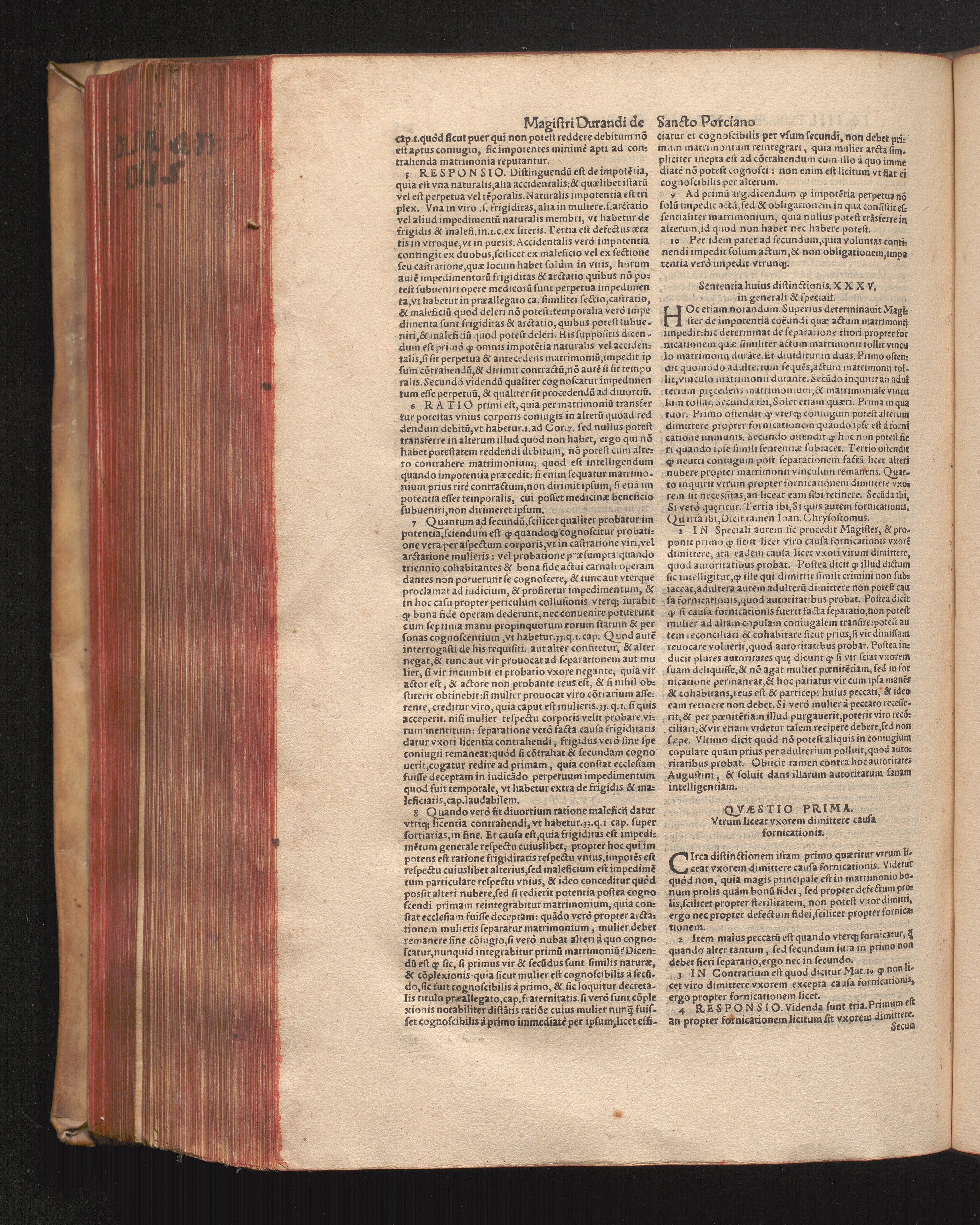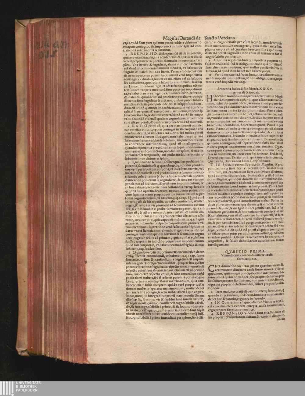 DN. DVRANDI|| à Sancto Portiano, in Senten=||tias Theologicas Petri Lombardi|| Commentariorum libri|| quatuor.|| / Primùm quidem per Nicolaum à Martimbos, eximium Nauarrensis|| Collegij Theologum, nunc verò denuo per alios quosdam|| non inferioris notæ Doctores quanta fieri po-||tuit cura diligentiáque emendati.|| Vná cum Auctoris Vita, & copiosissimo|| decisionum omnium|| Indice.||