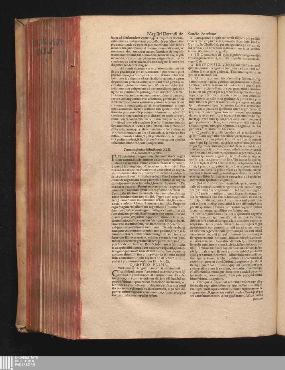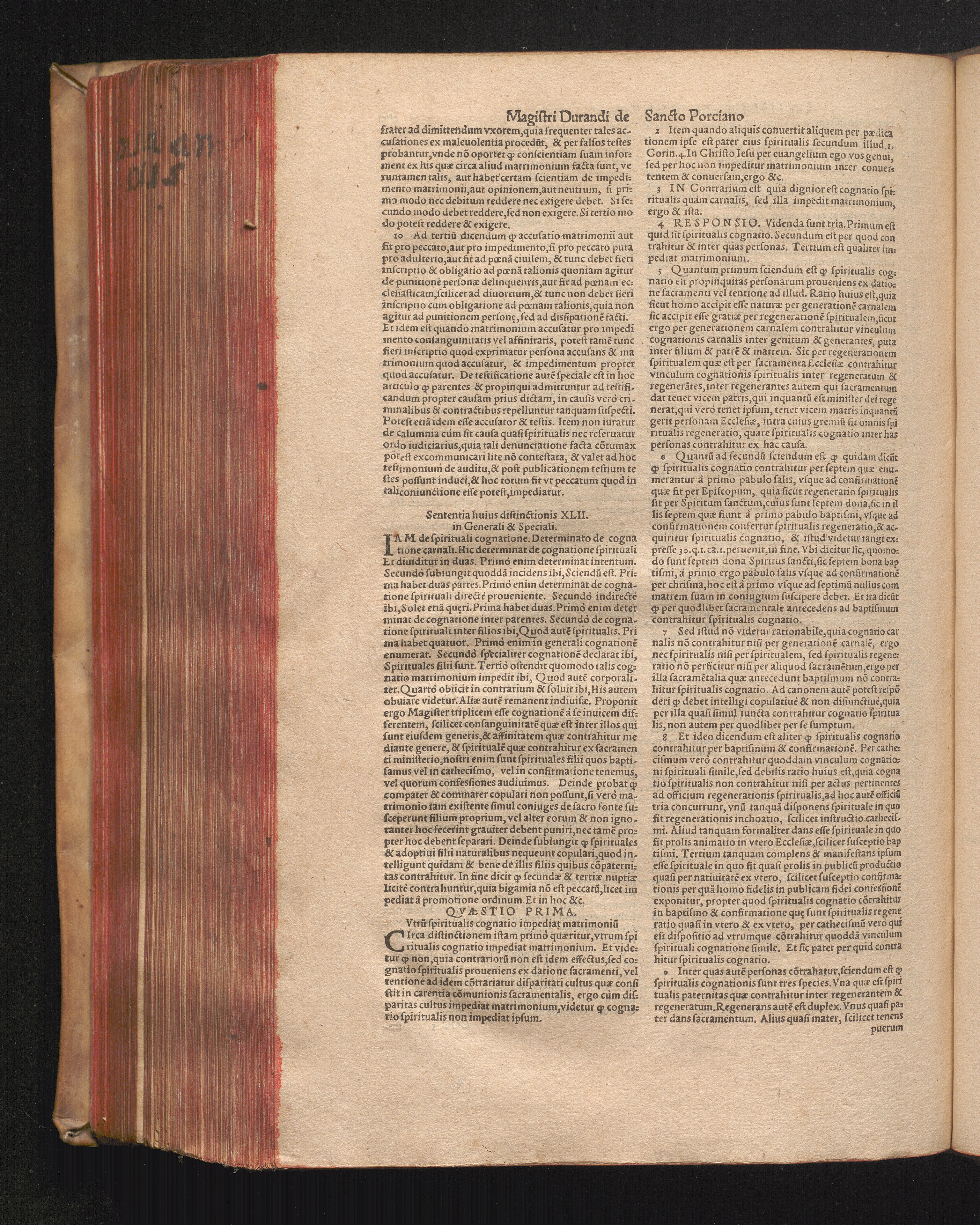 DN. DVRANDI|| à Sancto Portiano, in Senten=||tias Theologicas Petri Lombardi|| Commentariorum libri|| quatuor.|| / Primùm quidem per Nicolaum à Martimbos, eximium Nauarrensis|| Collegij Theologum, nunc verò denuo per alios quosdam|| non inferioris notæ Doctores quanta fieri po-||tuit cura diligentiáque emendati.|| Vná cum Auctoris Vita, & copiosissimo|| decisionum omnium|| Indice.||
