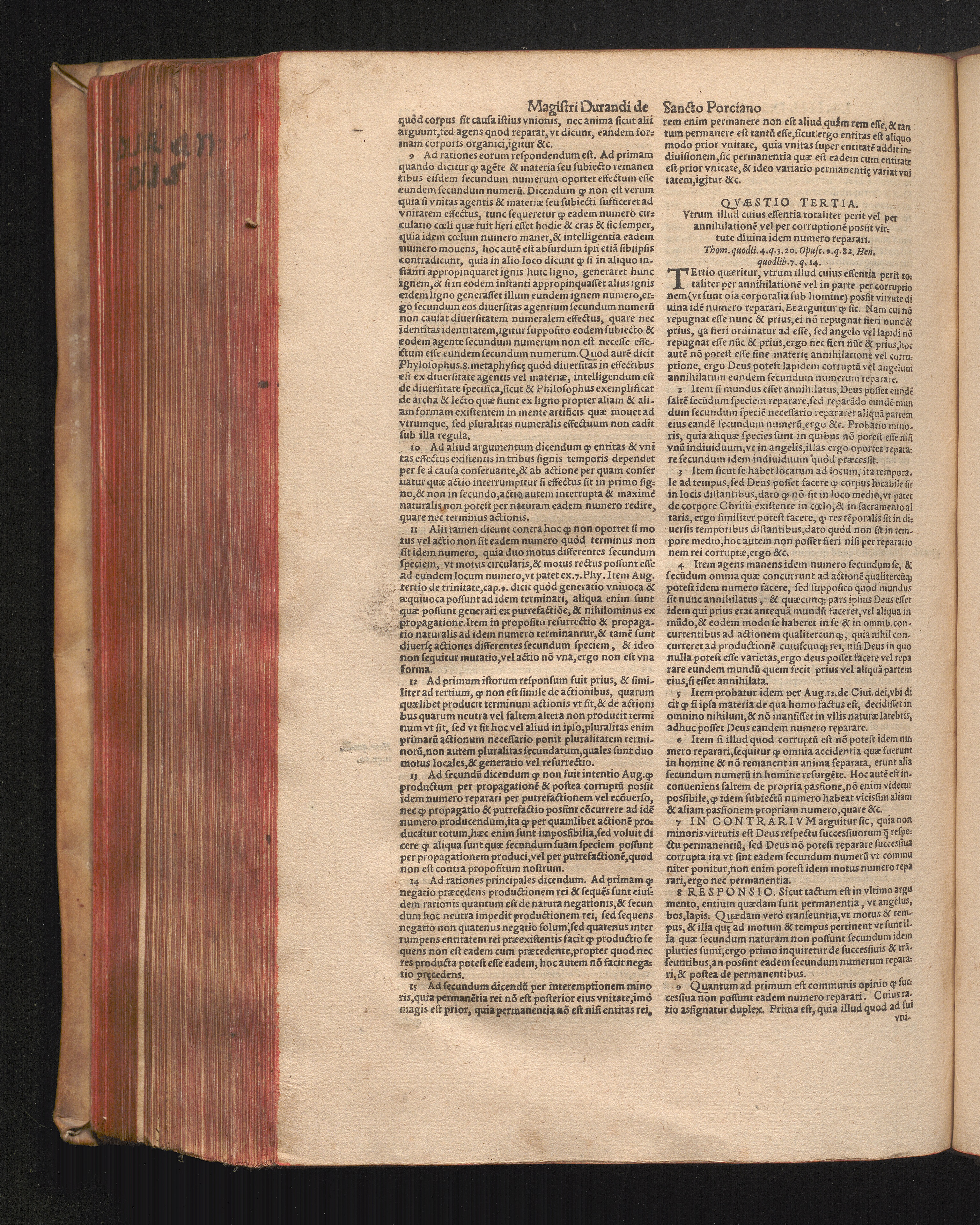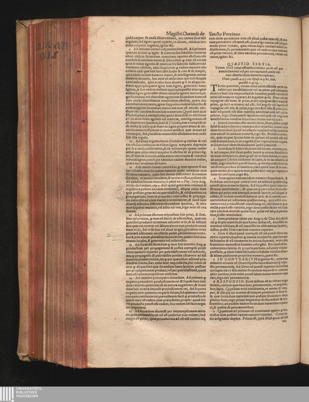 DN. DVRANDI|| à Sancto Portiano, in Senten=||tias Theologicas Petri Lombardi|| Commentariorum libri|| quatuor.|| / Primùm quidem per Nicolaum à Martimbos, eximium Nauarrensis|| Collegij Theologum, nunc verò denuo per alios quosdam|| non inferioris notæ Doctores quanta fieri po-||tuit cura diligentiáque emendati.|| Vná cum Auctoris Vita, & copiosissimo|| decisionum omnium|| Indice.||