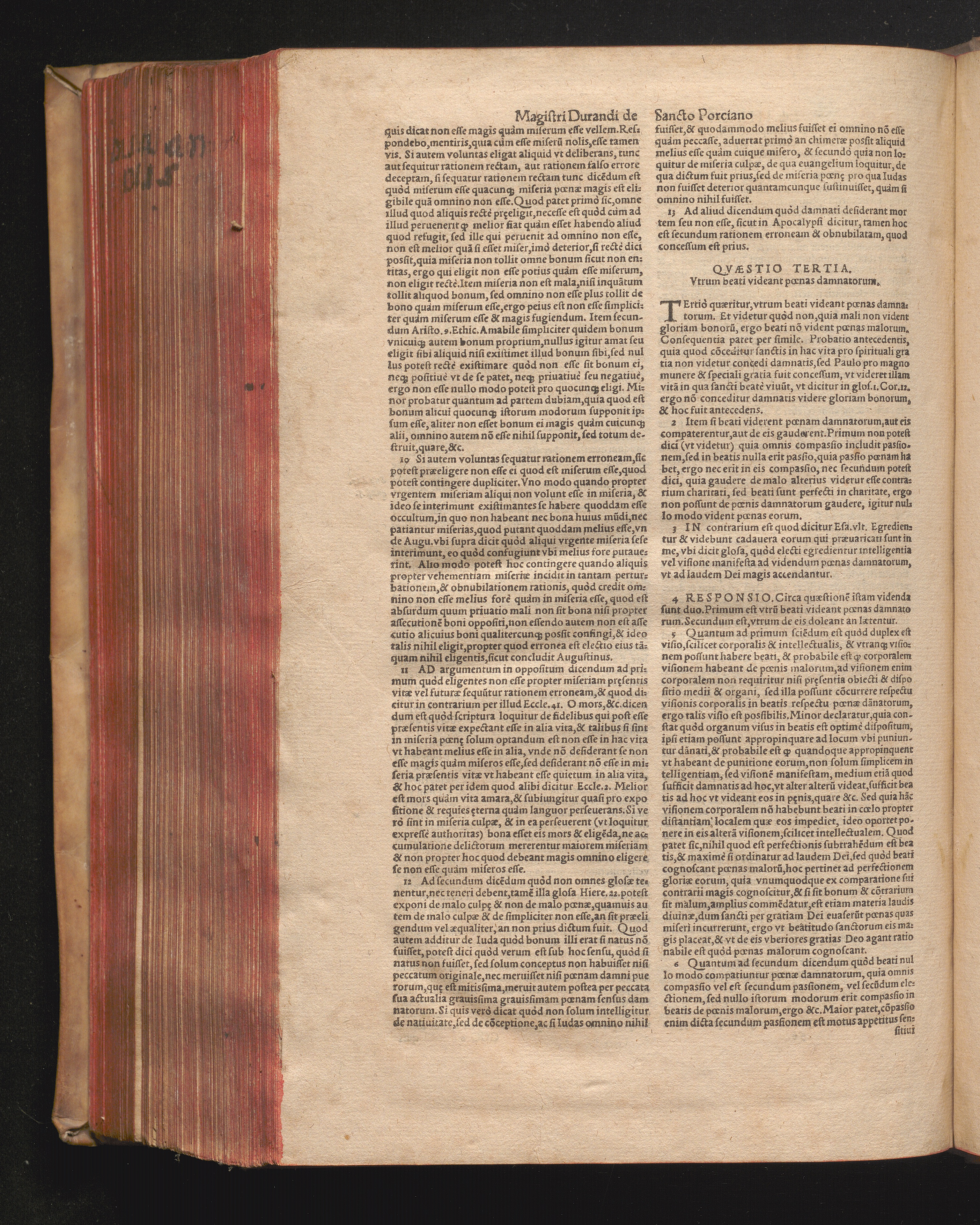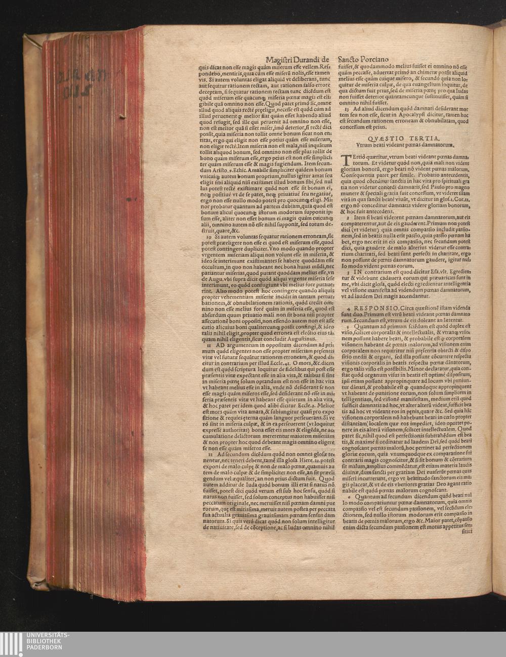DN. DVRANDI|| à Sancto Portiano, in Senten=||tias Theologicas Petri Lombardi|| Commentariorum libri|| quatuor.|| / Primùm quidem per Nicolaum à Martimbos, eximium Nauarrensis|| Collegij Theologum, nunc verò denuo per alios quosdam|| non inferioris notæ Doctores quanta fieri po-||tuit cura diligentiáque emendati.|| Vná cum Auctoris Vita, & copiosissimo|| decisionum omnium|| Indice.||