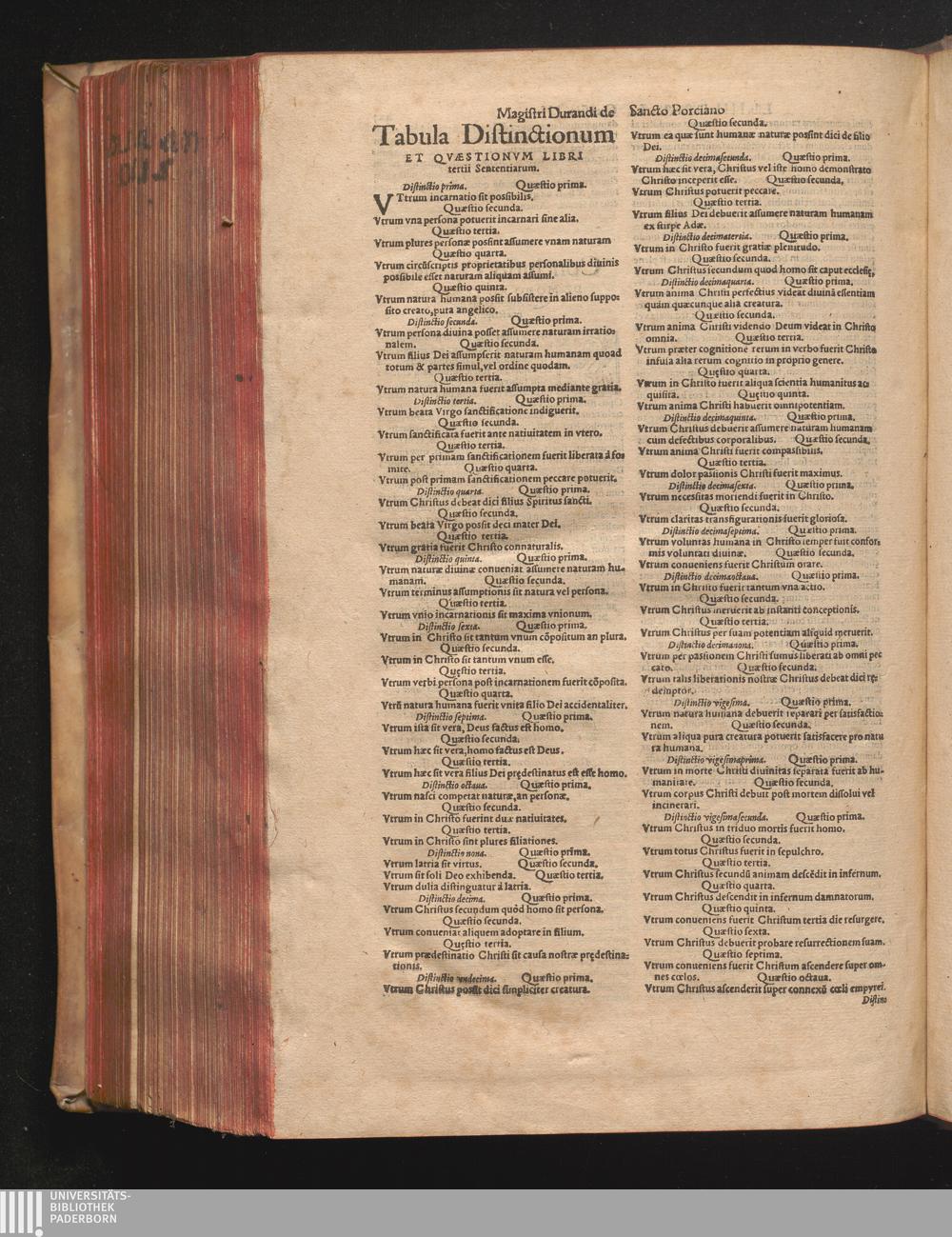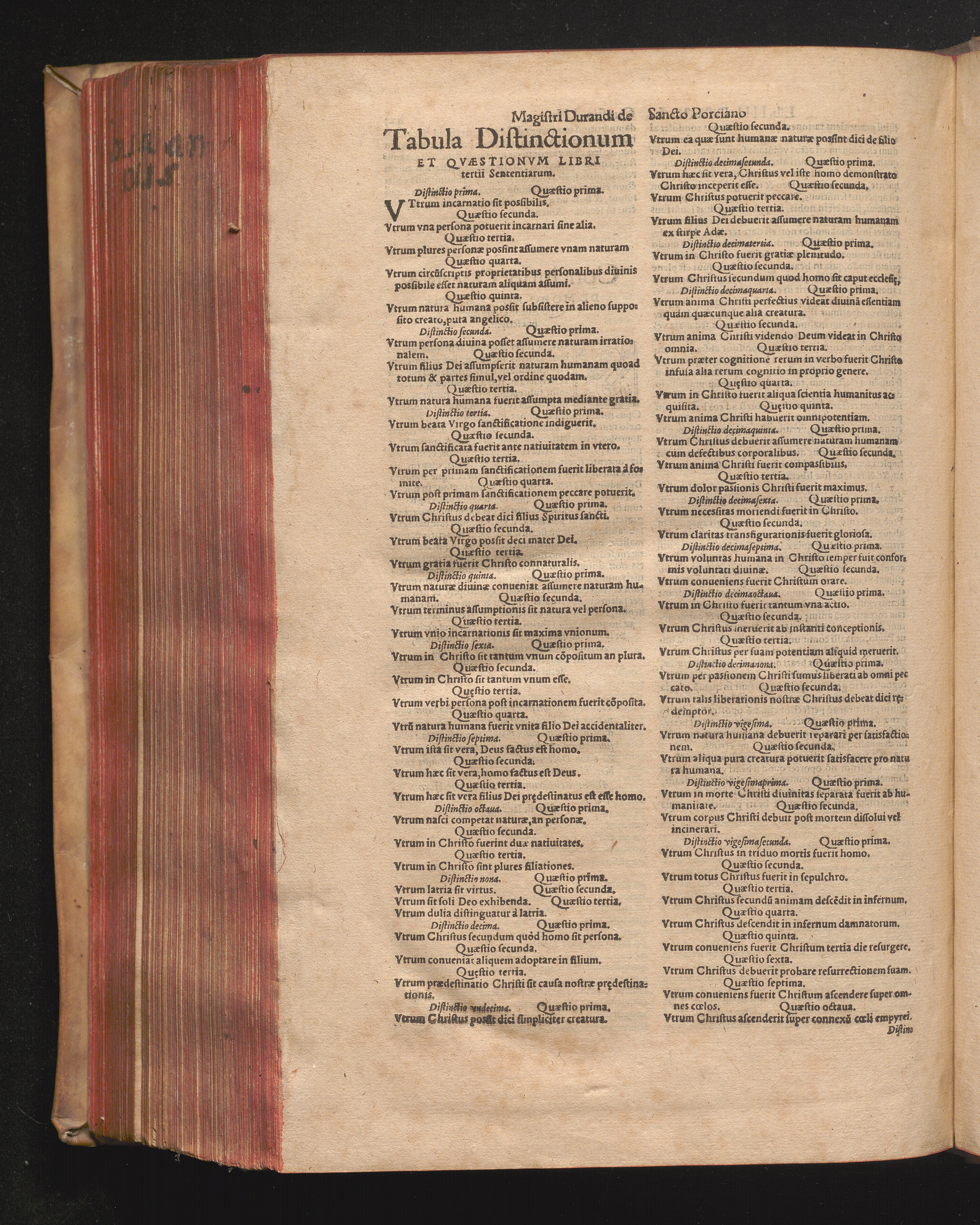 DN. DVRANDI|| à Sancto Portiano, in Senten=||tias Theologicas Petri Lombardi|| Commentariorum libri|| quatuor.|| / Primùm quidem per Nicolaum à Martimbos, eximium Nauarrensis|| Collegij Theologum, nunc verò denuo per alios quosdam|| non inferioris notæ Doctores quanta fieri po-||tuit cura diligentiáque emendati.|| Vná cum Auctoris Vita, & copiosissimo|| decisionum omnium|| Indice.||