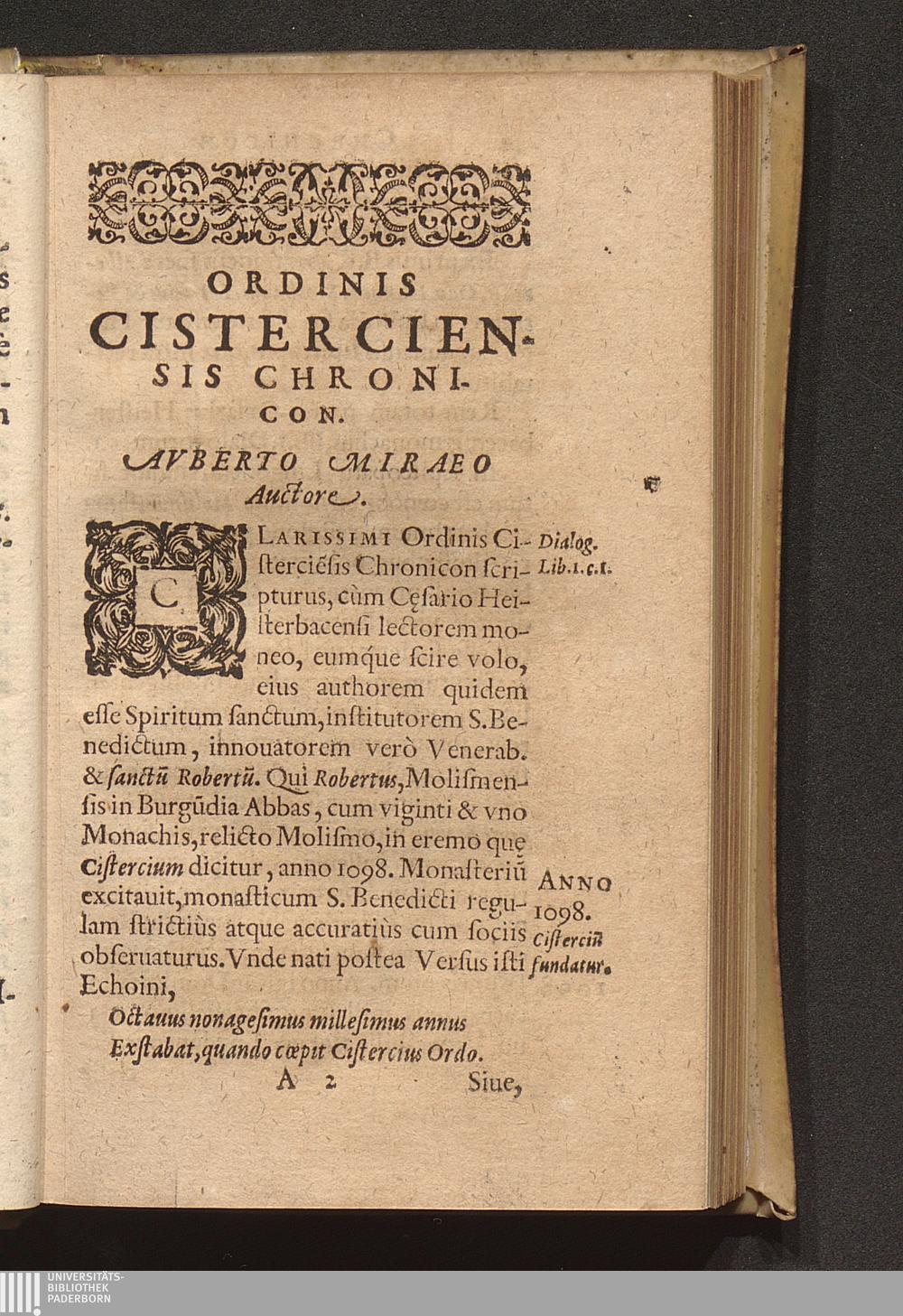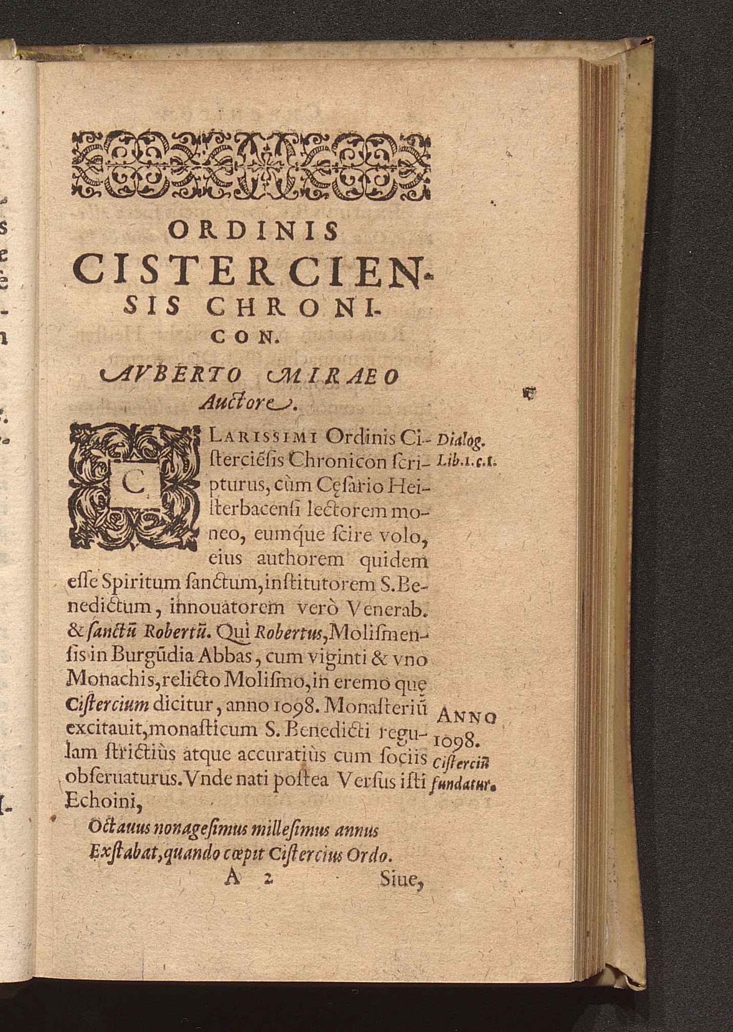 Chronicon || Cister-||ciensis || Ordinis : A S. Roberto Abbate Molismensi primùm inchoati, Postea A S. Bernardo Abbate Clareuallensi mirificè aucti, ac propagati / Avbertvs Miraevs Brvxellensis, S. Theol. Licent. Canonicus & Sigillifer Antvverpiensis publicabat
