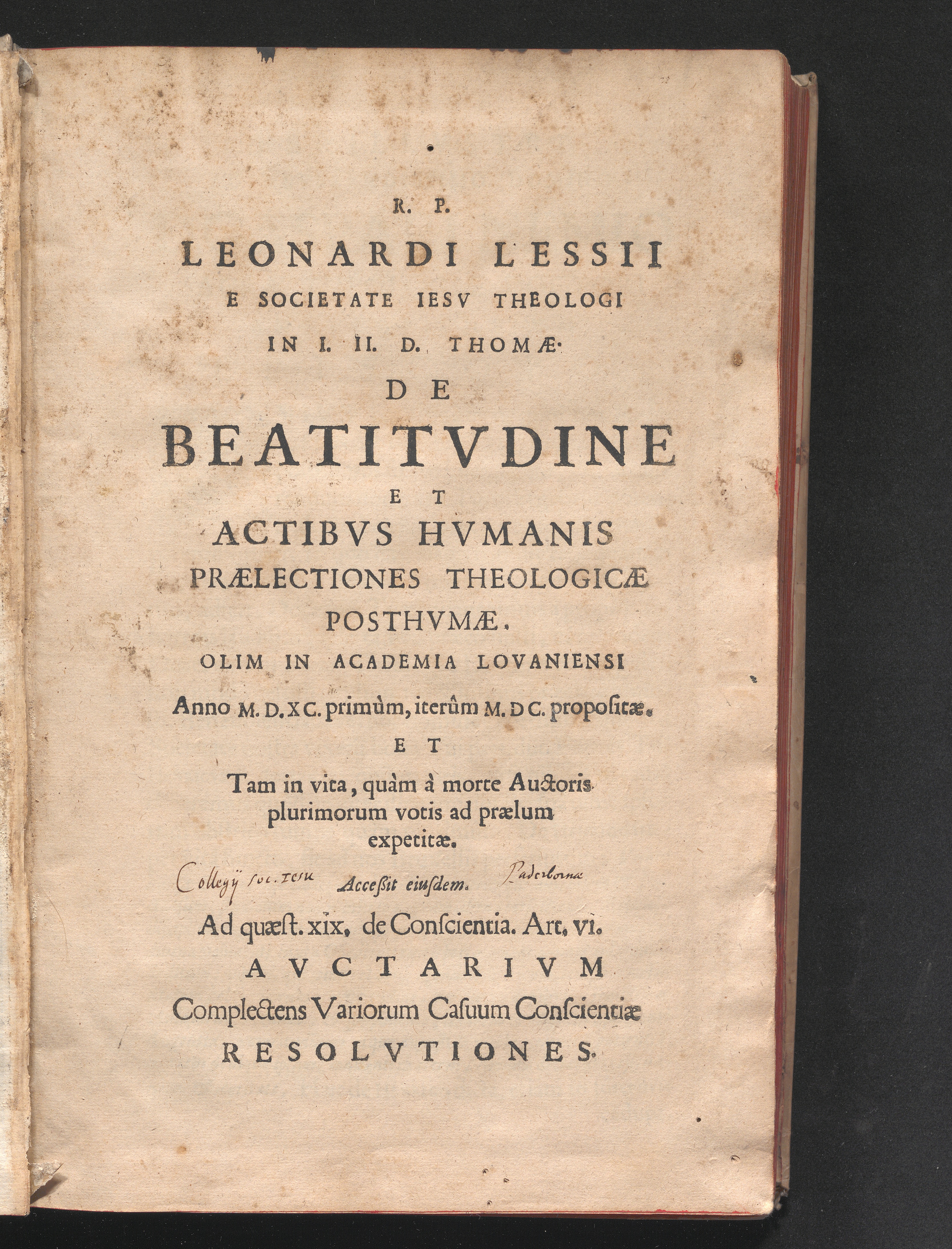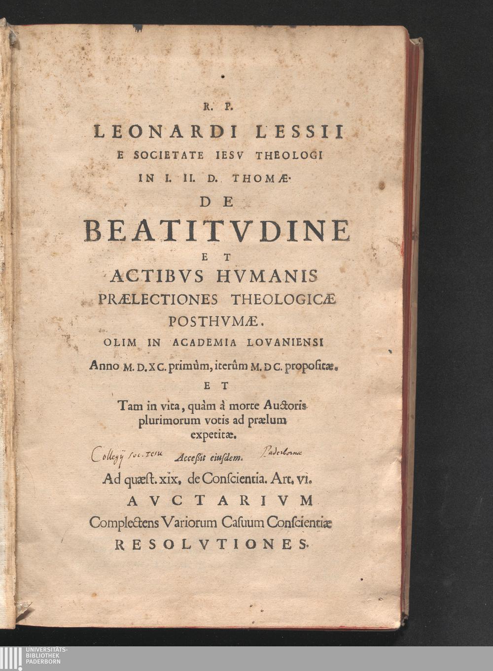 R.P. Leonardi Lessii E Societate Iesv Theologi. In D. Thomam De Beatitvdine. De Actibvs Hvmanis. De Incarnatione Verbi. De Sacramentis Et Censvris. Prælectiones Theologicæ Posthvmæ : Olim In Academia Lovaniensi Ab Anno M. D. LXXXV. iteratò propositæ. Et tam in vita, quàm à morte Auctoris plurimorum votis ad prælum expetitæ