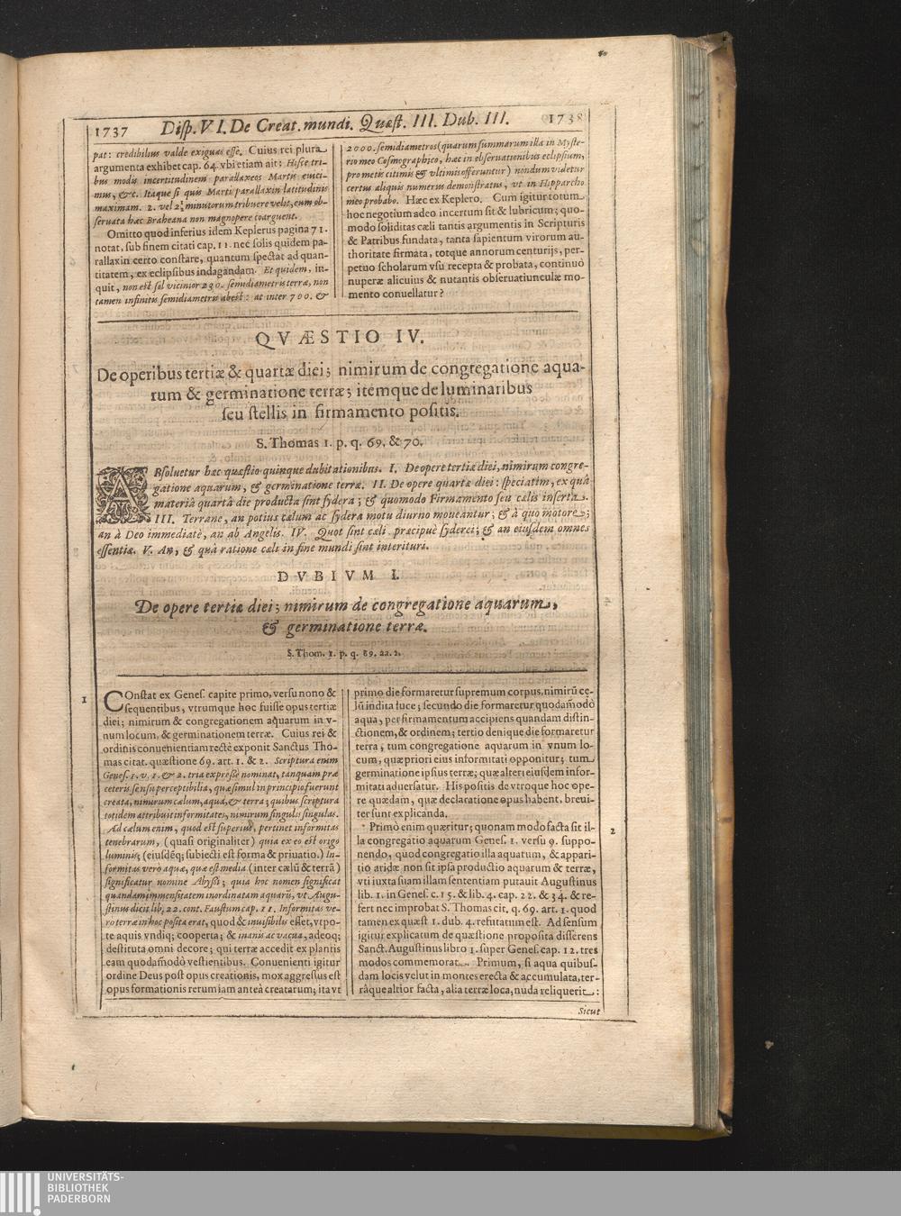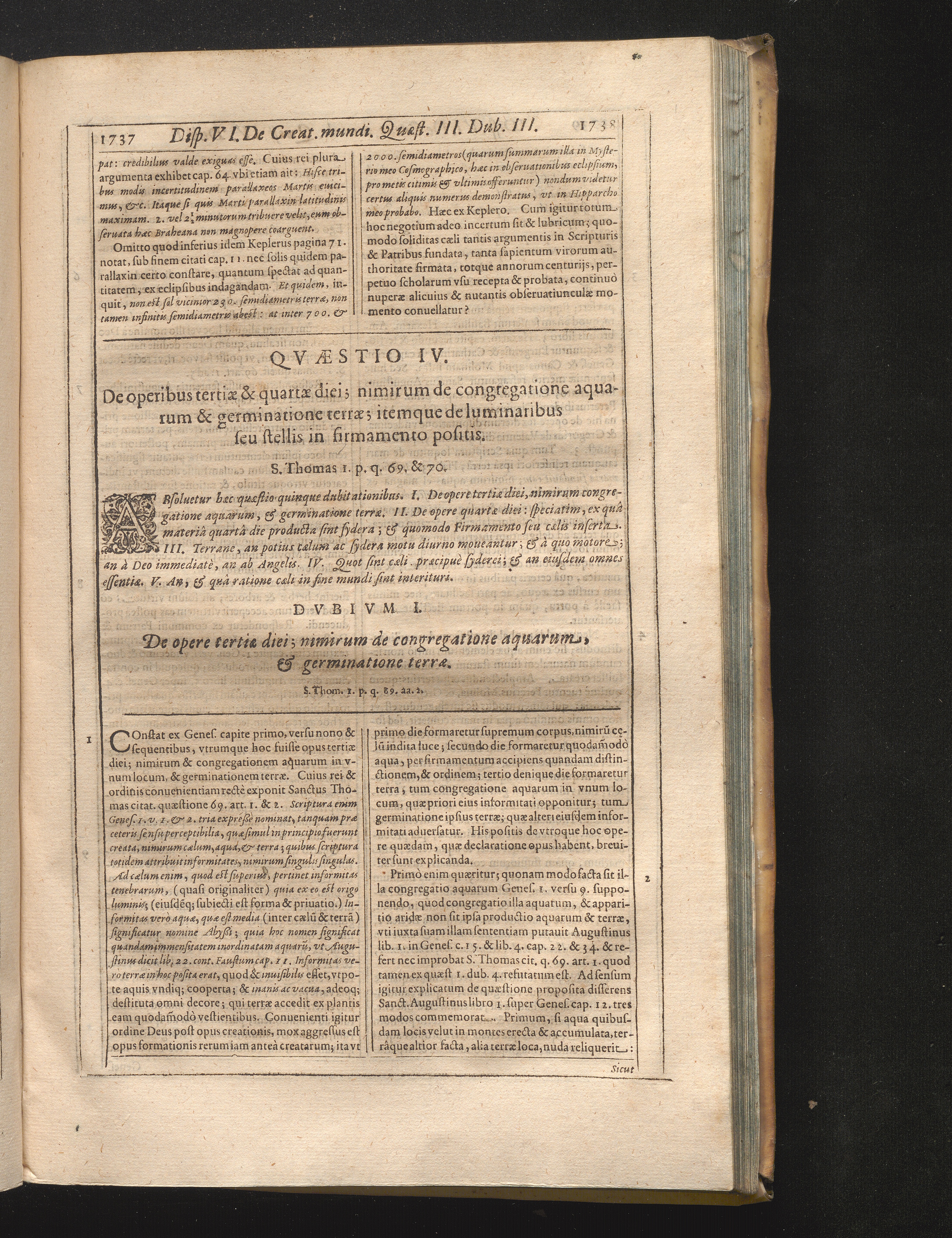 Quæstio IV. De operibus tertiæ ac quartæ diei, nimirum congregatione aquarum, & germinatione[...]