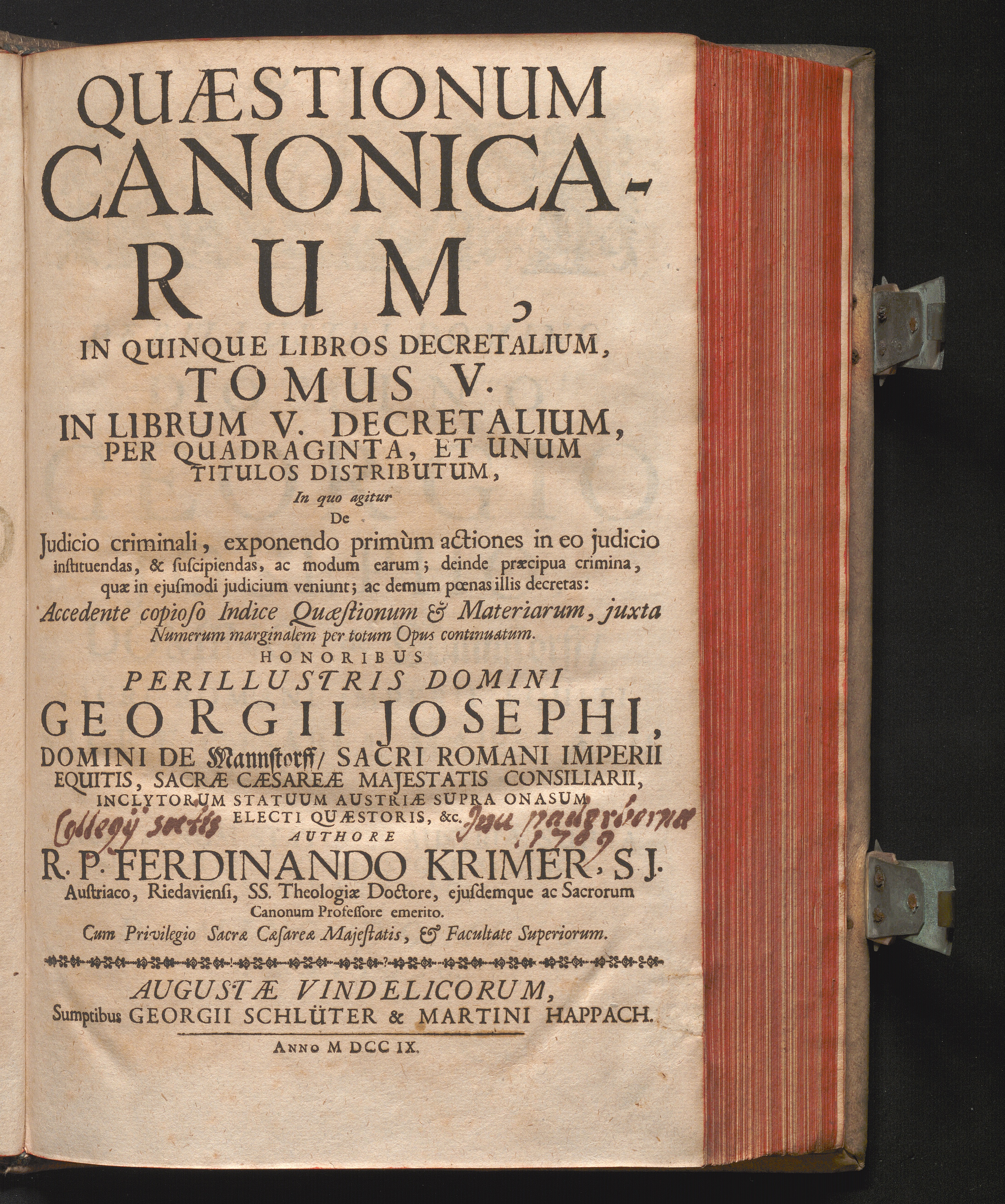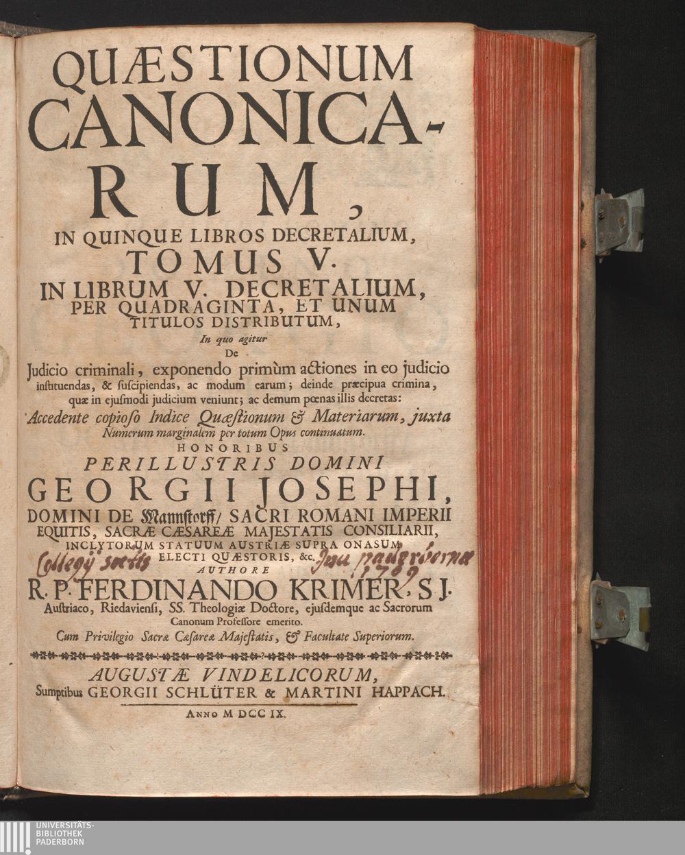 Tomus V (1709) In Librum V. Decretalium, Per Quadraginta, Et Unum Titulos Distributum, In quo agitur De Judicio criminali, exponendo primùm actiones in eo judicio instituendas, & suscipiendas, ...