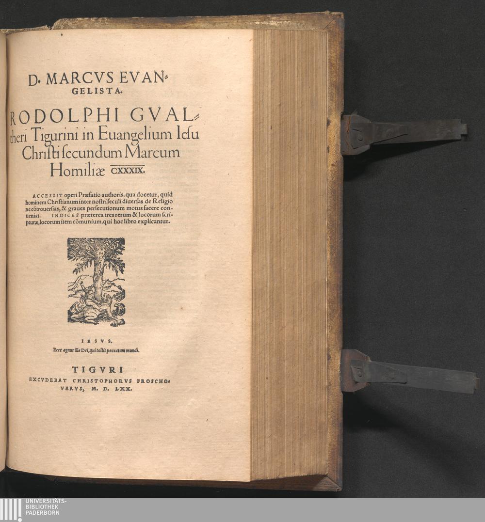 D. Marcvs Evangelista. Rodolphi Gvaltheri Tigurini in Euangelium Iesu Christi secundum Marcum Homiliæ CXXXIX. : Accessit operi Præfatio authoris, qua docetur, quid hominem Christianum inter nostri seculi diuersas de Religione co[n]trouersias, & graues persecutionum motus facere conueniat. Indices præterea tres rerum & locorum scripturæ, locorum item com[m]unium, qui hoc libro explicantur