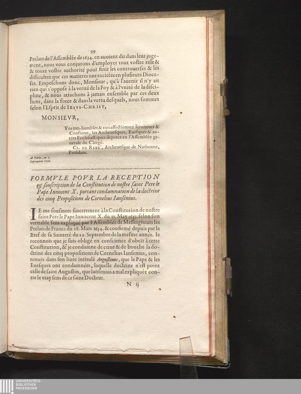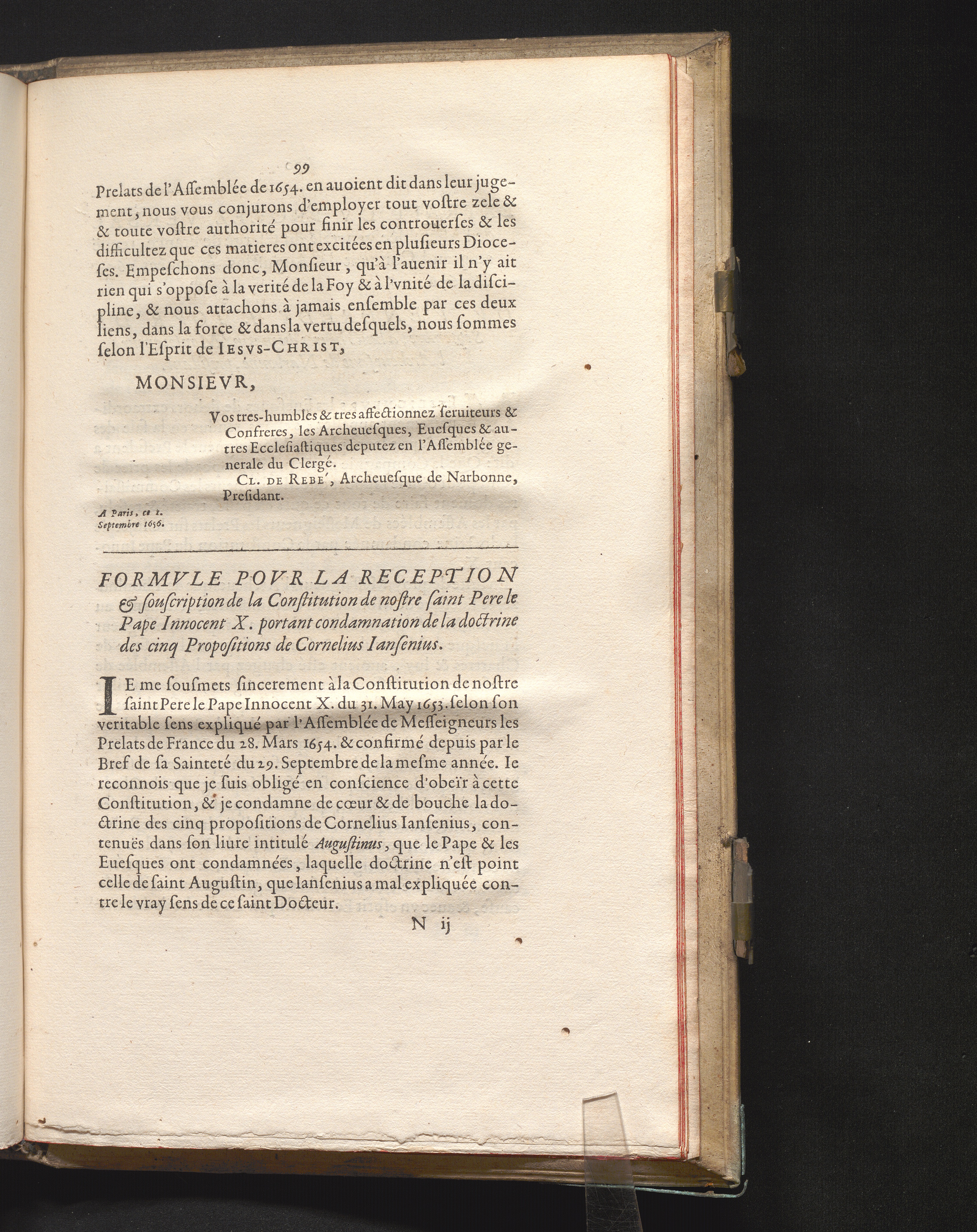 Relation Des Deliberations Dv Clergé De France, Svr La Constitvtion, Et Svr le Bref de N.S.P. le Pape Innocent X. Par Laqvelle Sont Declarées & definies cinq Propositions en matiere de Foy : Auec le Brefs de sa Sainteté, au Roy, & aux Archeuesques & Euesques de ce Royaume