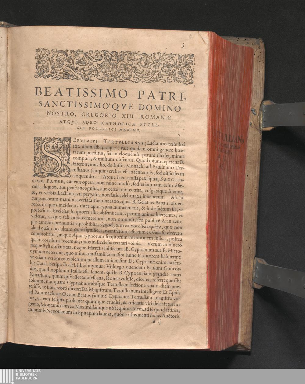 Q. SEPTIMII|| FLORENTIS|| TERTVLLIANI|| CARTHAGINIENSIS|| PRESBYTERI, OPERA|| QVÆ HACTENVS REPERIRI|| POTVERVNT OMNIA:|| : IAM POSTREMVM, AD EXEMPLARIA|| manuscripta collatione facta, quam accuratissimè recognita, aliquot etiam|| libris auctiora; nunc primùm in capita, & certo ordine, habita quantum|| fieri potuit temporum ratione, in QVINQVE TOMOS distincta.|| ...|| Catalogum totius Operis inueniet Lector post Epistolas Dedicatorias; & in|| singulis Tomis Præfatiunculas de librorum ordine.|| / CVM IACOBI PAMELII BRVGENSIS, THEOLOGI,|| Archidiaconi Audomaropolitani, Argumentis & Adnotationibus toti Operi|| interiectis; quibus tum loci obscuriores explicantur, tum quidquid|| ad Antiquitatem Ecclesiasticam spectat, illustratur.||