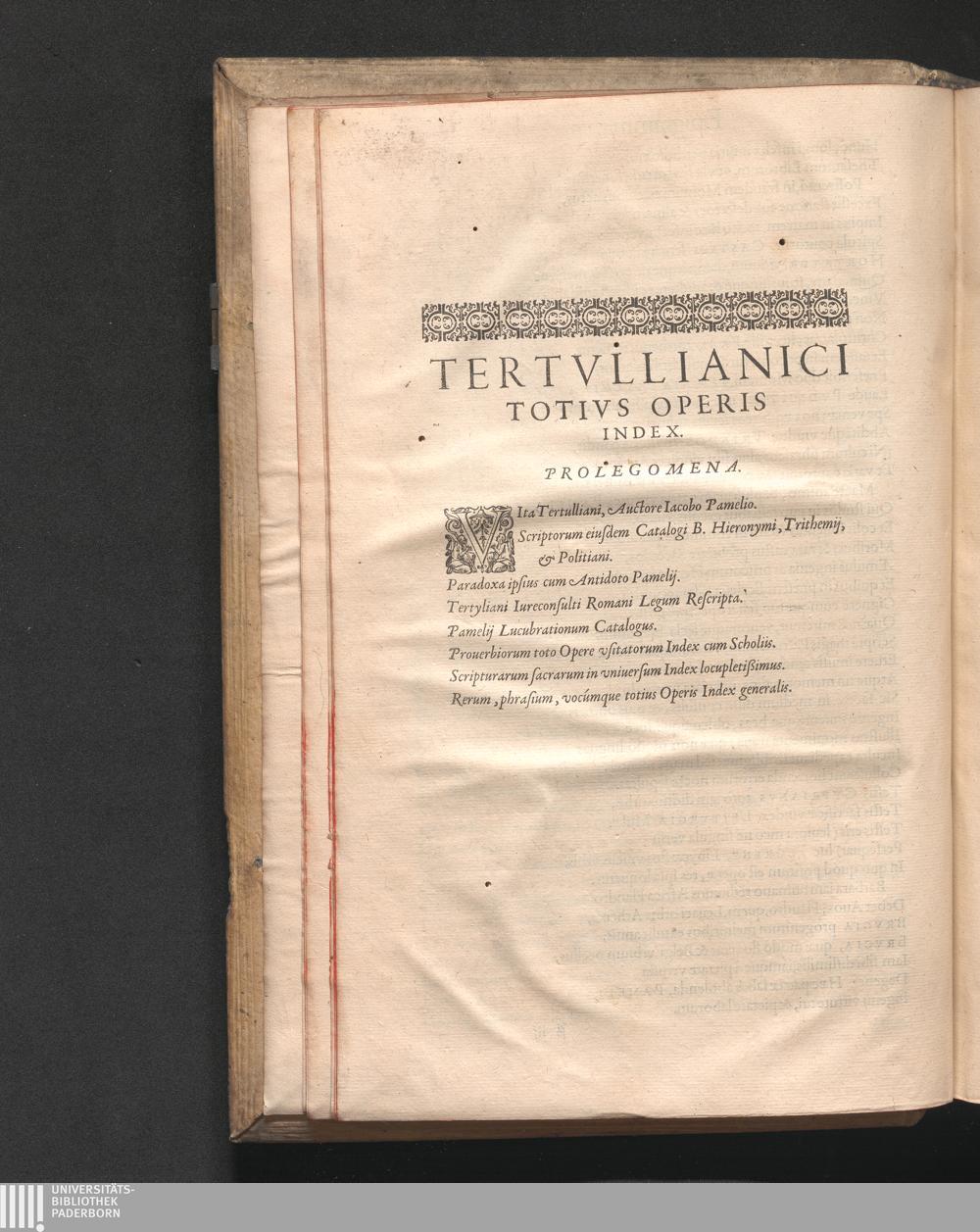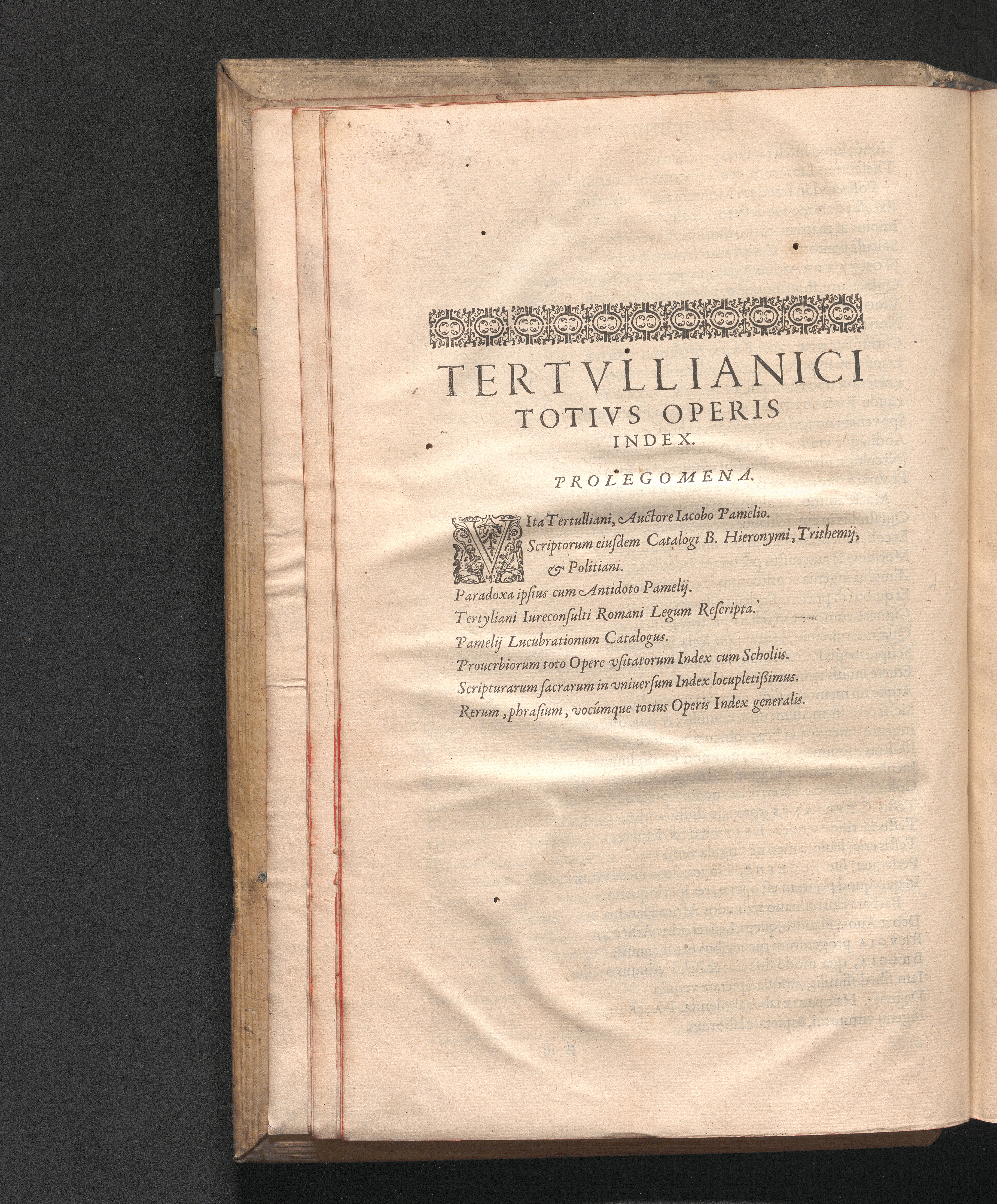 Q. SEPTIMII|| FLORENTIS|| TERTVLLIANI|| CARTHAGINIENSIS|| PRESBYTERI, OPERA|| QVÆ HACTENVS REPERIRI|| POTVERVNT OMNIA:|| : IAM POSTREMVM, AD EXEMPLARIA|| manuscripta collatione facta, quam accuratissimè recognita, aliquot etiam|| libris auctiora; nunc primùm in capita, & certo ordine, habita quantum|| fieri potuit temporum ratione, in QVINQVE TOMOS distincta.|| ...|| Catalogum totius Operis inueniet Lector post Epistolas Dedicatorias; & in|| singulis Tomis Præfatiunculas de librorum ordine.|| / CVM IACOBI PAMELII BRVGENSIS, THEOLOGI,|| Archidiaconi Audomaropolitani, Argumentis & Adnotationibus toti Operi|| interiectis; quibus tum loci obscuriores explicantur, tum quidquid|| ad Antiquitatem Ecclesiasticam spectat, illustratur.||