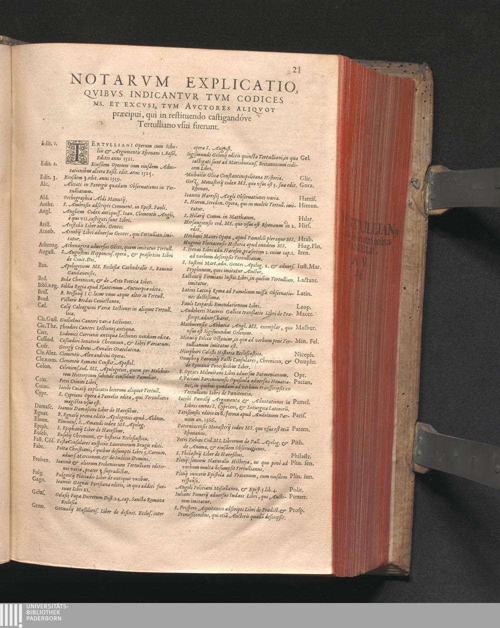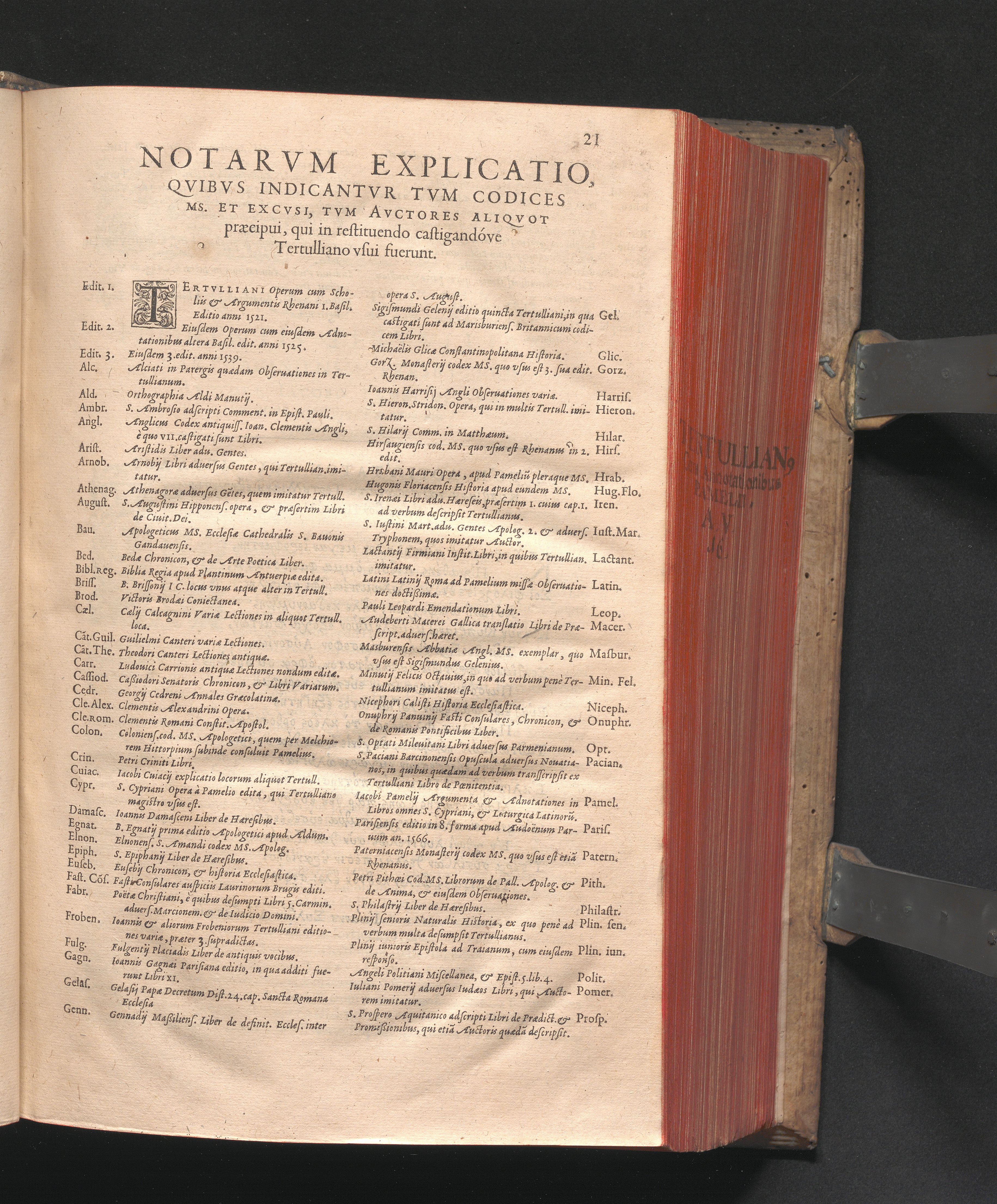 Q. SEPTIMII|| FLORENTIS|| TERTVLLIANI|| CARTHAGINIENSIS|| PRESBYTERI, OPERA|| QVÆ HACTENVS REPERIRI|| POTVERVNT OMNIA:|| : IAM POSTREMVM, AD EXEMPLARIA|| manuscripta collatione facta, quam accuratissimè recognita, aliquot etiam|| libris auctiora; nunc primùm in capita, & certo ordine, habita quantum|| fieri potuit temporum ratione, in QVINQVE TOMOS distincta.|| ...|| Catalogum totius Operis inueniet Lector post Epistolas Dedicatorias; & in|| singulis Tomis Præfatiunculas de librorum ordine.|| / CVM IACOBI PAMELII BRVGENSIS, THEOLOGI,|| Archidiaconi Audomaropolitani, Argumentis & Adnotationibus toti Operi|| interiectis; quibus tum loci obscuriores explicantur, tum quidquid|| ad Antiquitatem Ecclesiasticam spectat, illustratur.||