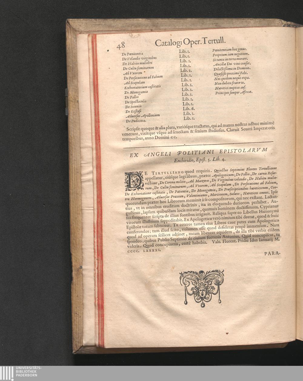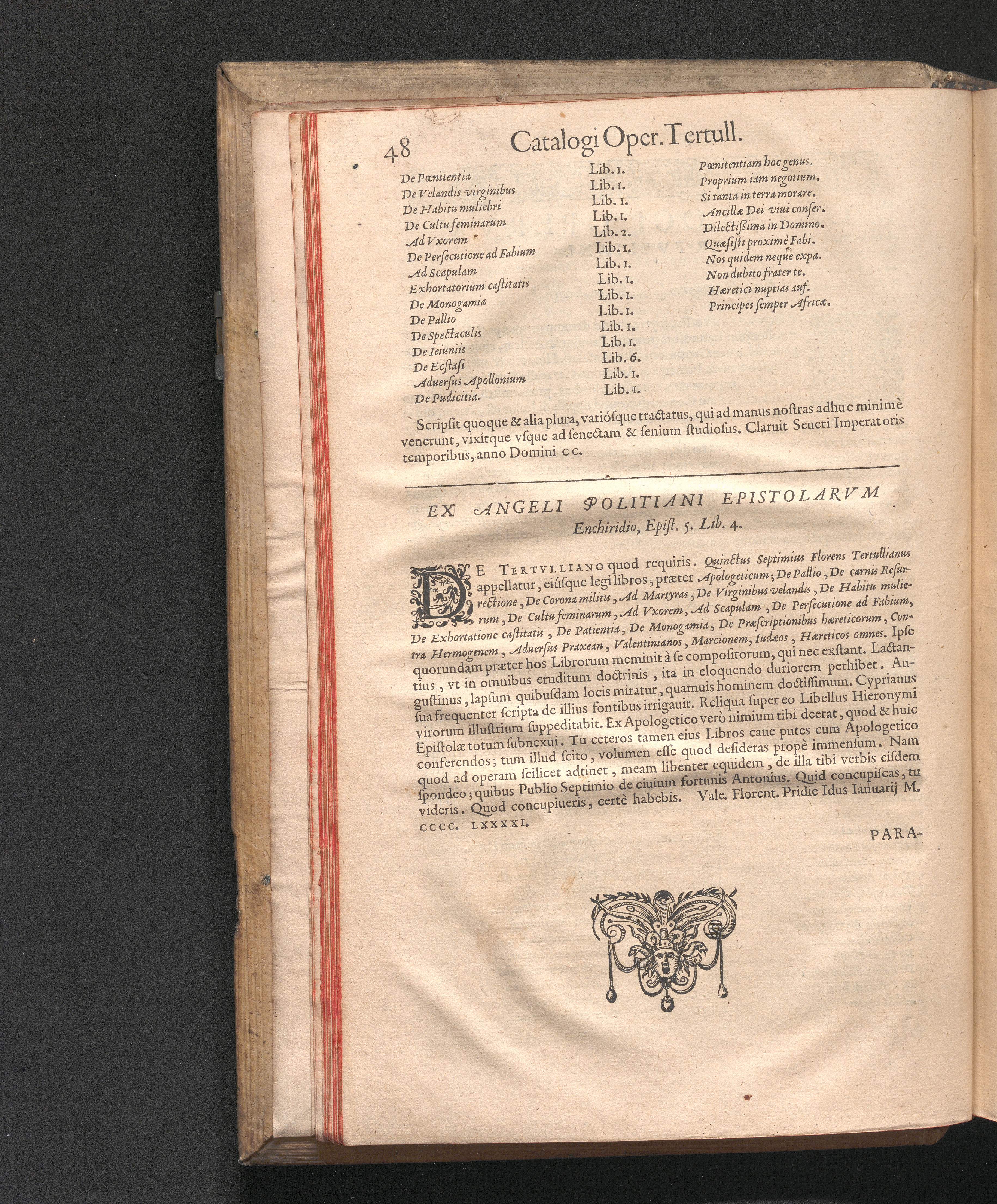 Q. SEPTIMII|| FLORENTIS|| TERTVLLIANI|| CARTHAGINIENSIS|| PRESBYTERI, OPERA|| QVÆ HACTENVS REPERIRI|| POTVERVNT OMNIA:|| : IAM POSTREMVM, AD EXEMPLARIA|| manuscripta collatione facta, quam accuratissimè recognita, aliquot etiam|| libris auctiora; nunc primùm in capita, & certo ordine, habita quantum|| fieri potuit temporum ratione, in QVINQVE TOMOS distincta.|| ...|| Catalogum totius Operis inueniet Lector post Epistolas Dedicatorias; & in|| singulis Tomis Præfatiunculas de librorum ordine.|| / CVM IACOBI PAMELII BRVGENSIS, THEOLOGI,|| Archidiaconi Audomaropolitani, Argumentis & Adnotationibus toti Operi|| interiectis; quibus tum loci obscuriores explicantur, tum quidquid|| ad Antiquitatem Ecclesiasticam spectat, illustratur.||
