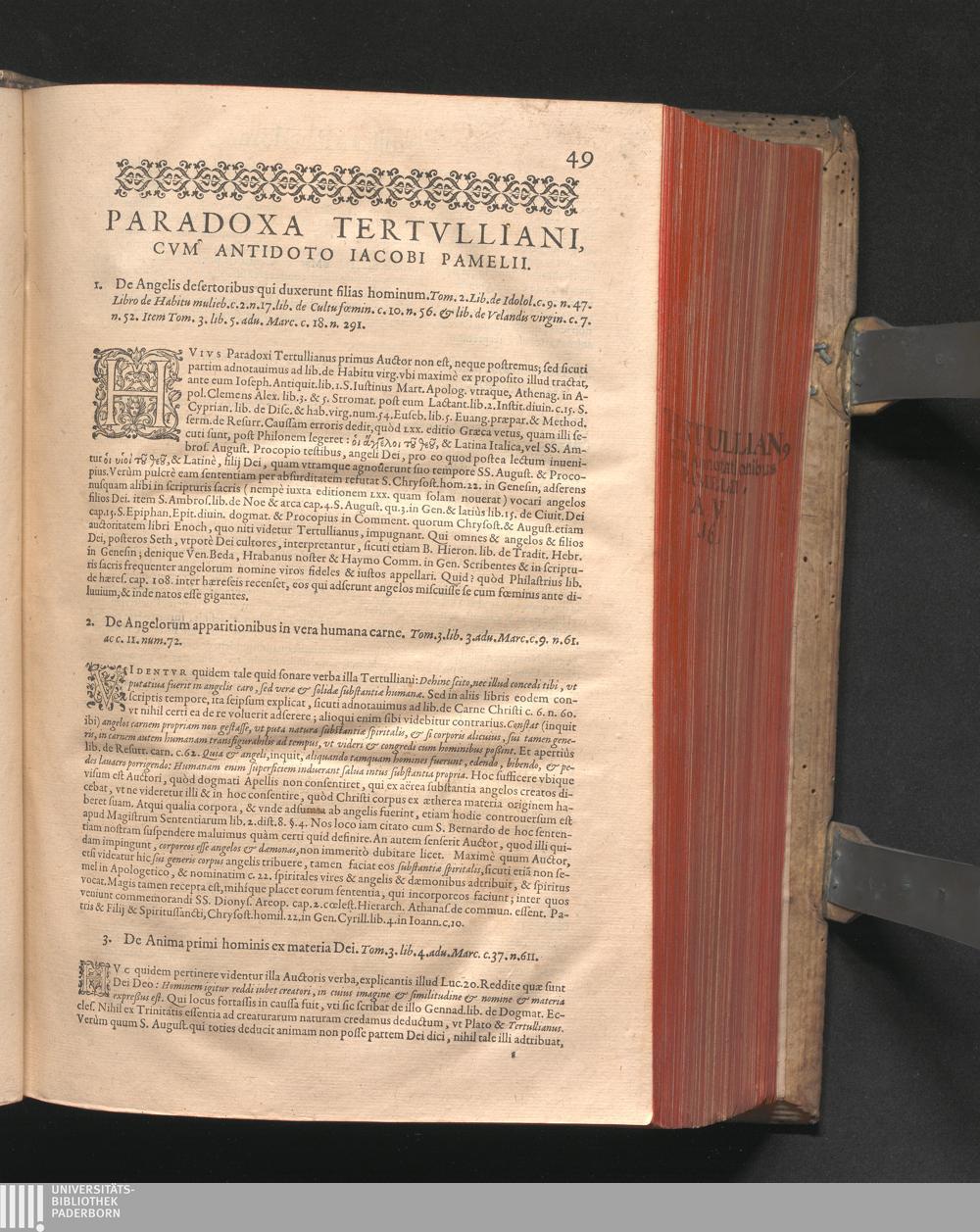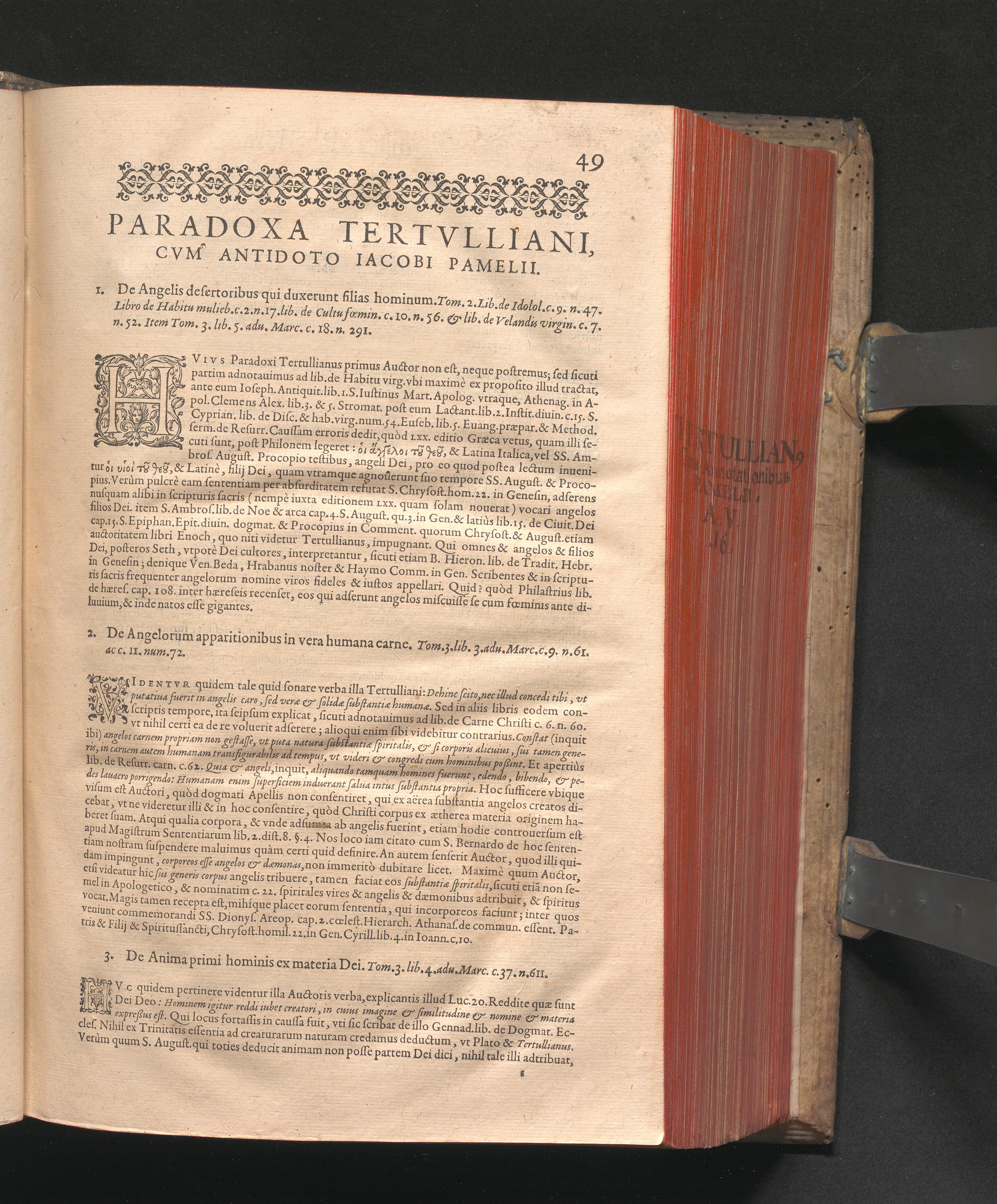 Q. SEPTIMII|| FLORENTIS|| TERTVLLIANI|| CARTHAGINIENSIS|| PRESBYTERI, OPERA|| QVÆ HACTENVS REPERIRI|| POTVERVNT OMNIA:|| : IAM POSTREMVM, AD EXEMPLARIA|| manuscripta collatione facta, quam accuratissimè recognita, aliquot etiam|| libris auctiora; nunc primùm in capita, & certo ordine, habita quantum|| fieri potuit temporum ratione, in QVINQVE TOMOS distincta.|| ...|| Catalogum totius Operis inueniet Lector post Epistolas Dedicatorias; & in|| singulis Tomis Præfatiunculas de librorum ordine.|| / CVM IACOBI PAMELII BRVGENSIS, THEOLOGI,|| Archidiaconi Audomaropolitani, Argumentis & Adnotationibus toti Operi|| interiectis; quibus tum loci obscuriores explicantur, tum quidquid|| ad Antiquitatem Ecclesiasticam spectat, illustratur.||
