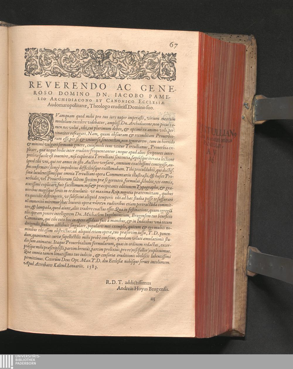 Q. SEPTIMII|| FLORENTIS|| TERTVLLIANI|| CARTHAGINIENSIS|| PRESBYTERI, OPERA|| QVÆ HACTENVS REPERIRI|| POTVERVNT OMNIA:|| : IAM POSTREMVM, AD EXEMPLARIA|| manuscripta collatione facta, quam accuratissimè recognita, aliquot etiam|| libris auctiora; nunc primùm in capita, & certo ordine, habita quantum|| fieri potuit temporum ratione, in QVINQVE TOMOS distincta.|| ...|| Catalogum totius Operis inueniet Lector post Epistolas Dedicatorias; & in|| singulis Tomis Præfatiunculas de librorum ordine.|| / CVM IACOBI PAMELII BRVGENSIS, THEOLOGI,|| Archidiaconi Audomaropolitani, Argumentis & Adnotationibus toti Operi|| interiectis; quibus tum loci obscuriores explicantur, tum quidquid|| ad Antiquitatem Ecclesiasticam spectat, illustratur.||