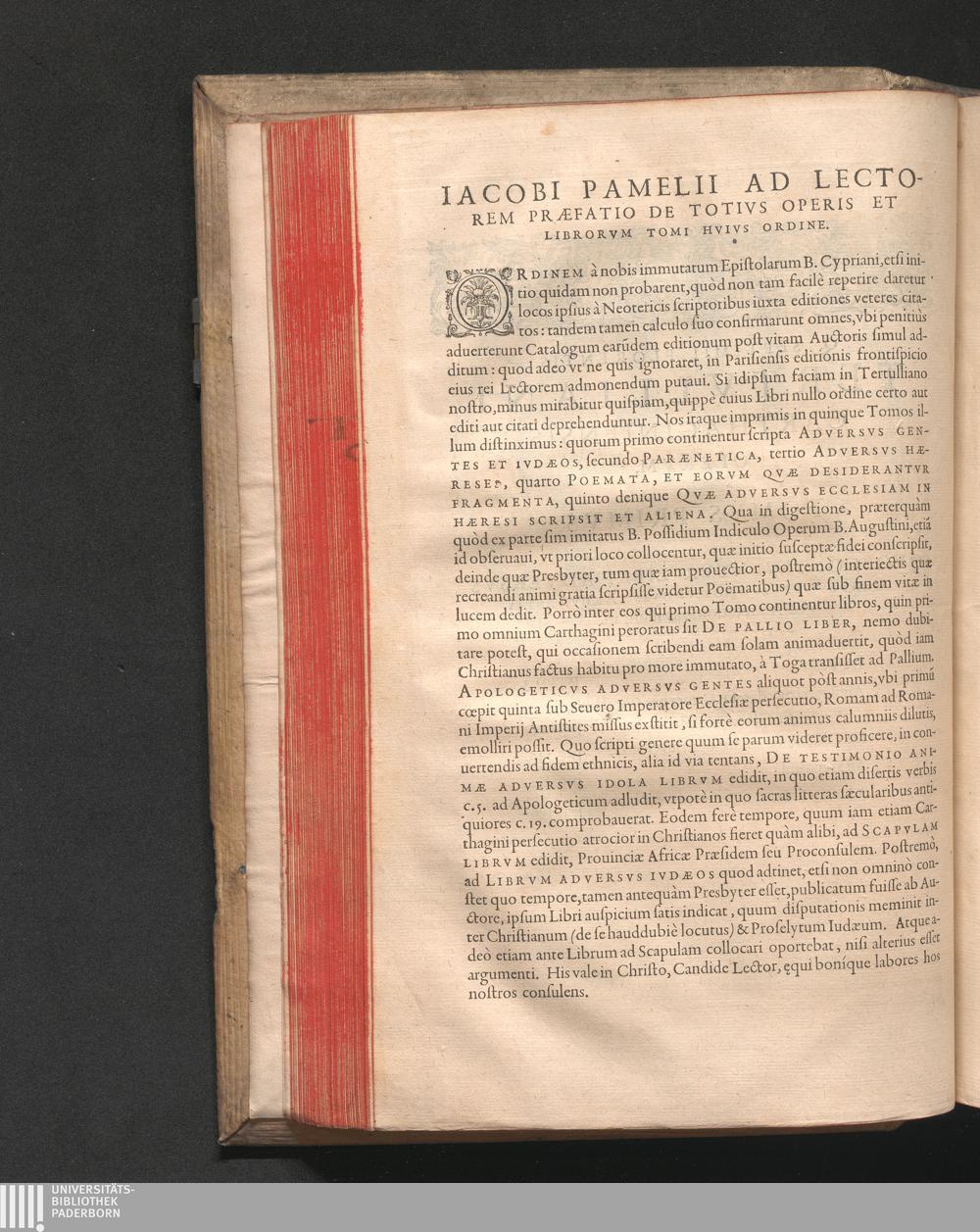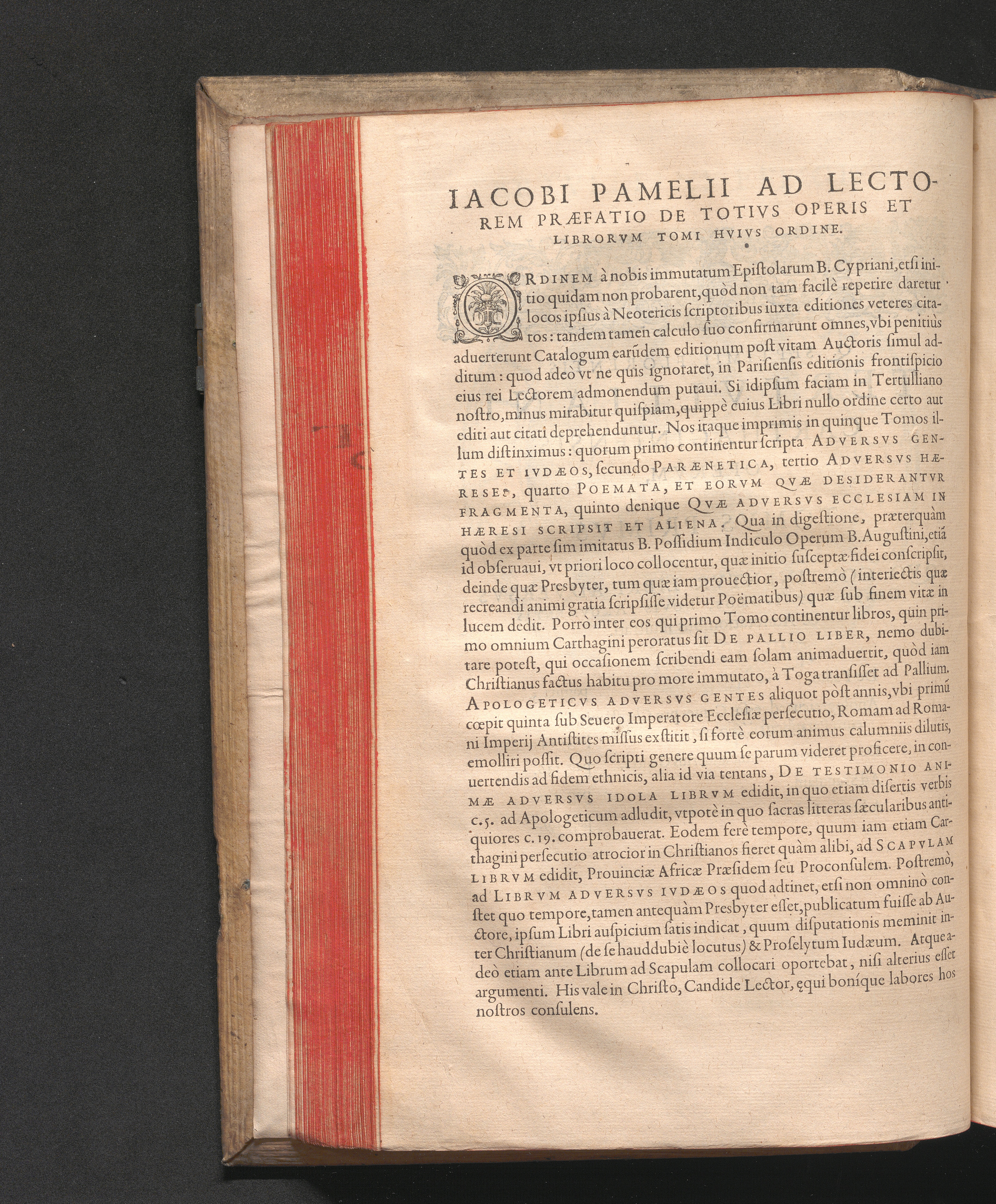 Q. SEPTIMII|| FLORENTIS|| TERTVLLIANI|| CARTHAGINIENSIS|| PRESBYTERI, OPERA|| QVÆ HACTENVS REPERIRI|| POTVERVNT OMNIA:|| : IAM POSTREMVM, AD EXEMPLARIA|| manuscripta collatione facta, quam accuratissimè recognita, aliquot etiam|| libris auctiora; nunc primùm in capita, & certo ordine, habita quantum|| fieri potuit temporum ratione, in QVINQVE TOMOS distincta.|| ...|| Catalogum totius Operis inueniet Lector post Epistolas Dedicatorias; & in|| singulis Tomis Præfatiunculas de librorum ordine.|| / CVM IACOBI PAMELII BRVGENSIS, THEOLOGI,|| Archidiaconi Audomaropolitani, Argumentis & Adnotationibus toti Operi|| interiectis; quibus tum loci obscuriores explicantur, tum quidquid|| ad Antiquitatem Ecclesiasticam spectat, illustratur.||