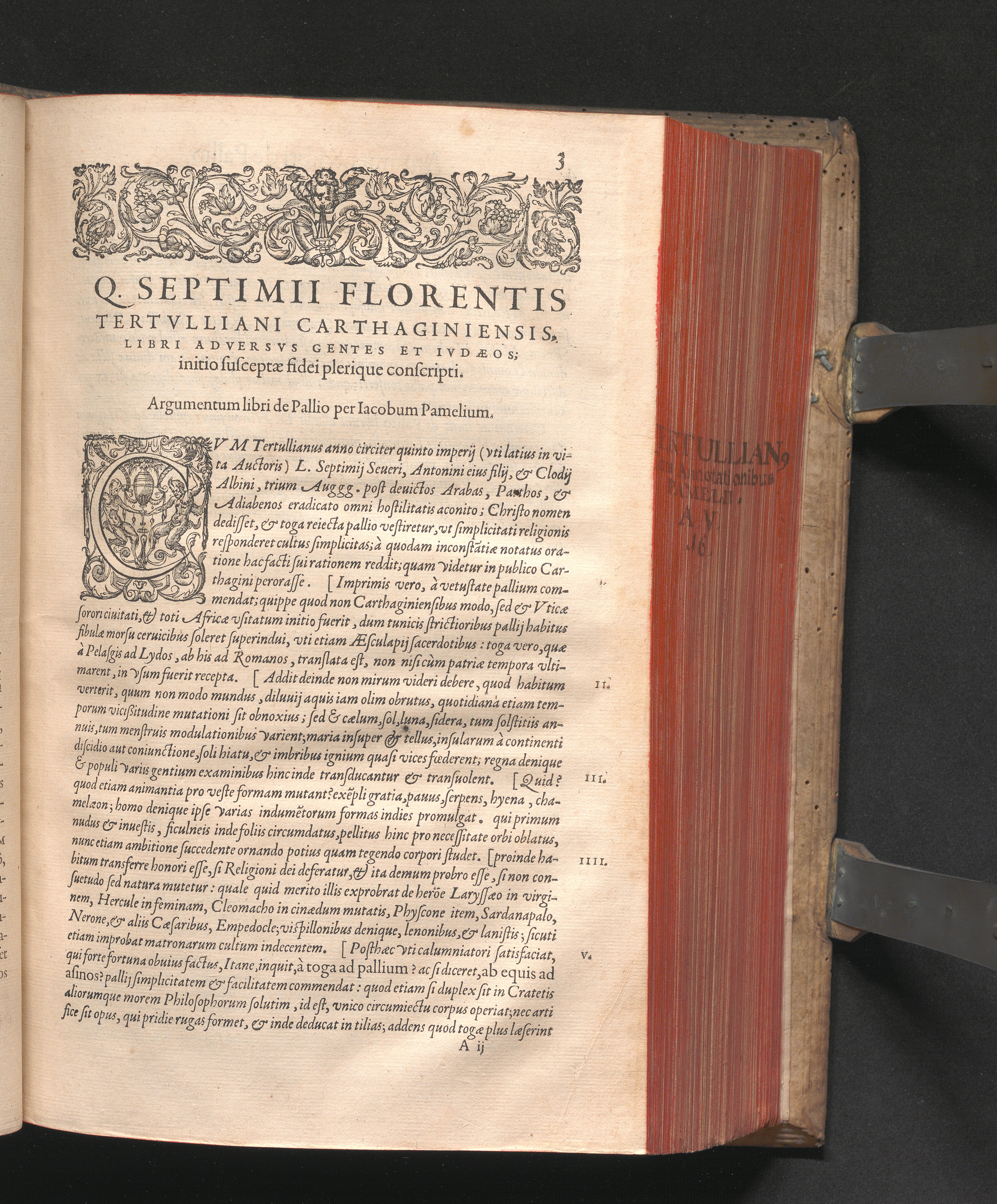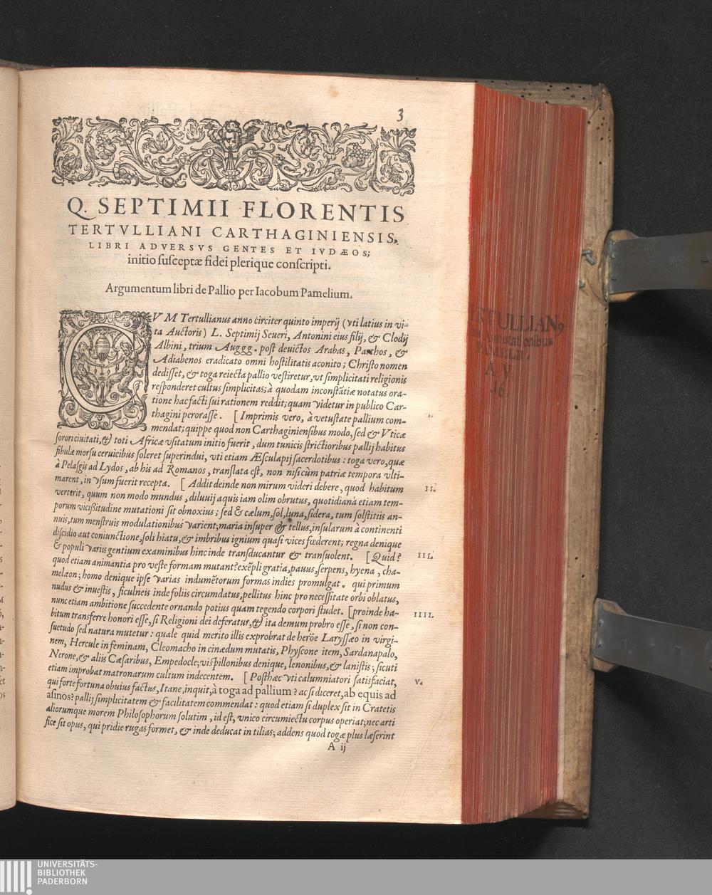 Q. SEPTIMII|| FLORENTIS|| TERTVLLIANI|| CARTHAGINIENSIS|| PRESBYTERI, OPERA|| QVÆ HACTENVS REPERIRI|| POTVERVNT OMNIA:|| : IAM POSTREMVM, AD EXEMPLARIA|| manuscripta collatione facta, quam accuratissimè recognita, aliquot etiam|| libris auctiora; nunc primùm in capita, & certo ordine, habita quantum|| fieri potuit temporum ratione, in QVINQVE TOMOS distincta.|| ...|| Catalogum totius Operis inueniet Lector post Epistolas Dedicatorias; & in|| singulis Tomis Præfatiunculas de librorum ordine.|| / CVM IACOBI PAMELII BRVGENSIS, THEOLOGI,|| Archidiaconi Audomaropolitani, Argumentis & Adnotationibus toti Operi|| interiectis; quibus tum loci obscuriores explicantur, tum quidquid|| ad Antiquitatem Ecclesiasticam spectat, illustratur.||