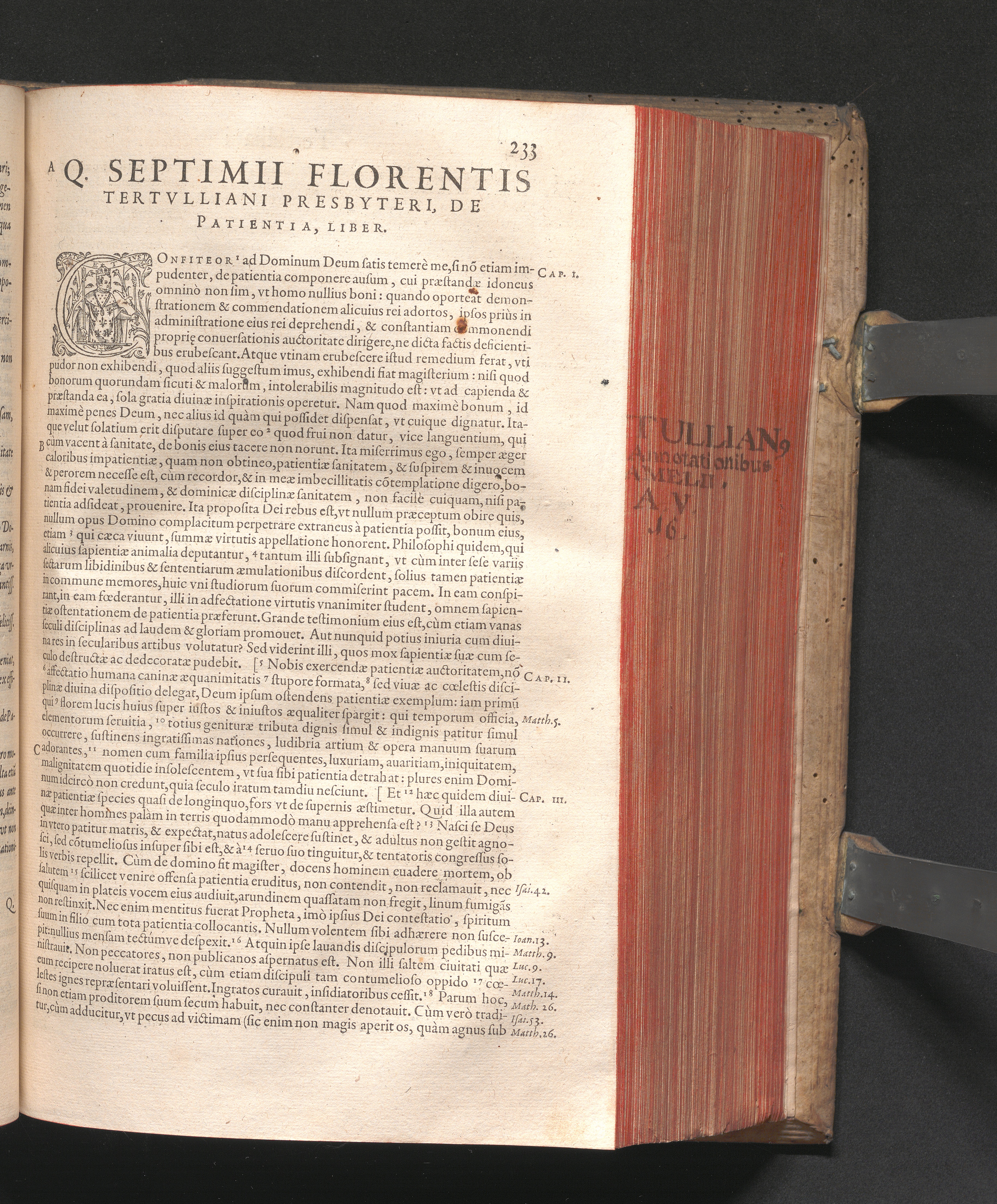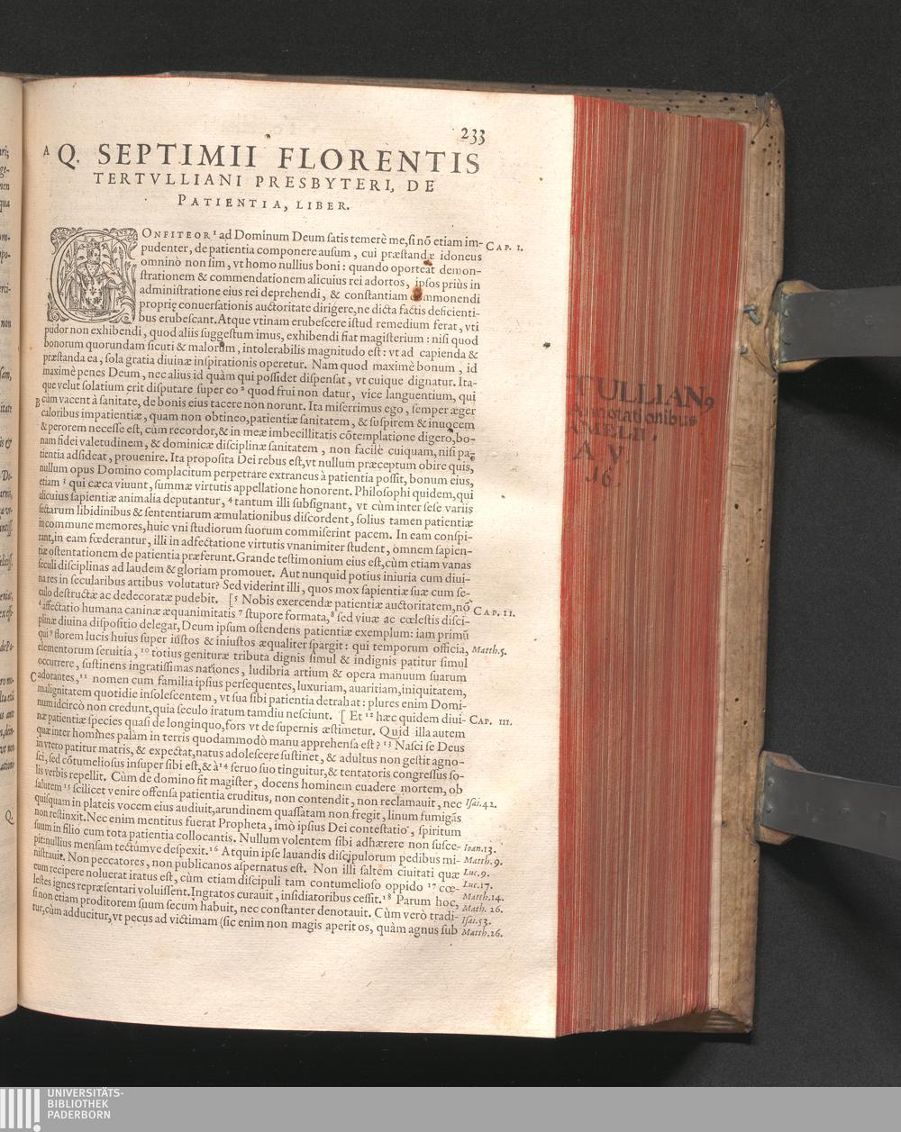 Q. SEPTIMII|| FLORENTIS|| TERTVLLIANI|| CARTHAGINIENSIS|| PRESBYTERI, OPERA|| QVÆ HACTENVS REPERIRI|| POTVERVNT OMNIA:|| : IAM POSTREMVM, AD EXEMPLARIA|| manuscripta collatione facta, quam accuratissimè recognita, aliquot etiam|| libris auctiora; nunc primùm in capita, & certo ordine, habita quantum|| fieri potuit temporum ratione, in QVINQVE TOMOS distincta.|| ...|| Catalogum totius Operis inueniet Lector post Epistolas Dedicatorias; & in|| singulis Tomis Præfatiunculas de librorum ordine.|| / CVM IACOBI PAMELII BRVGENSIS, THEOLOGI,|| Archidiaconi Audomaropolitani, Argumentis & Adnotationibus toti Operi|| interiectis; quibus tum loci obscuriores explicantur, tum quidquid|| ad Antiquitatem Ecclesiasticam spectat, illustratur.||