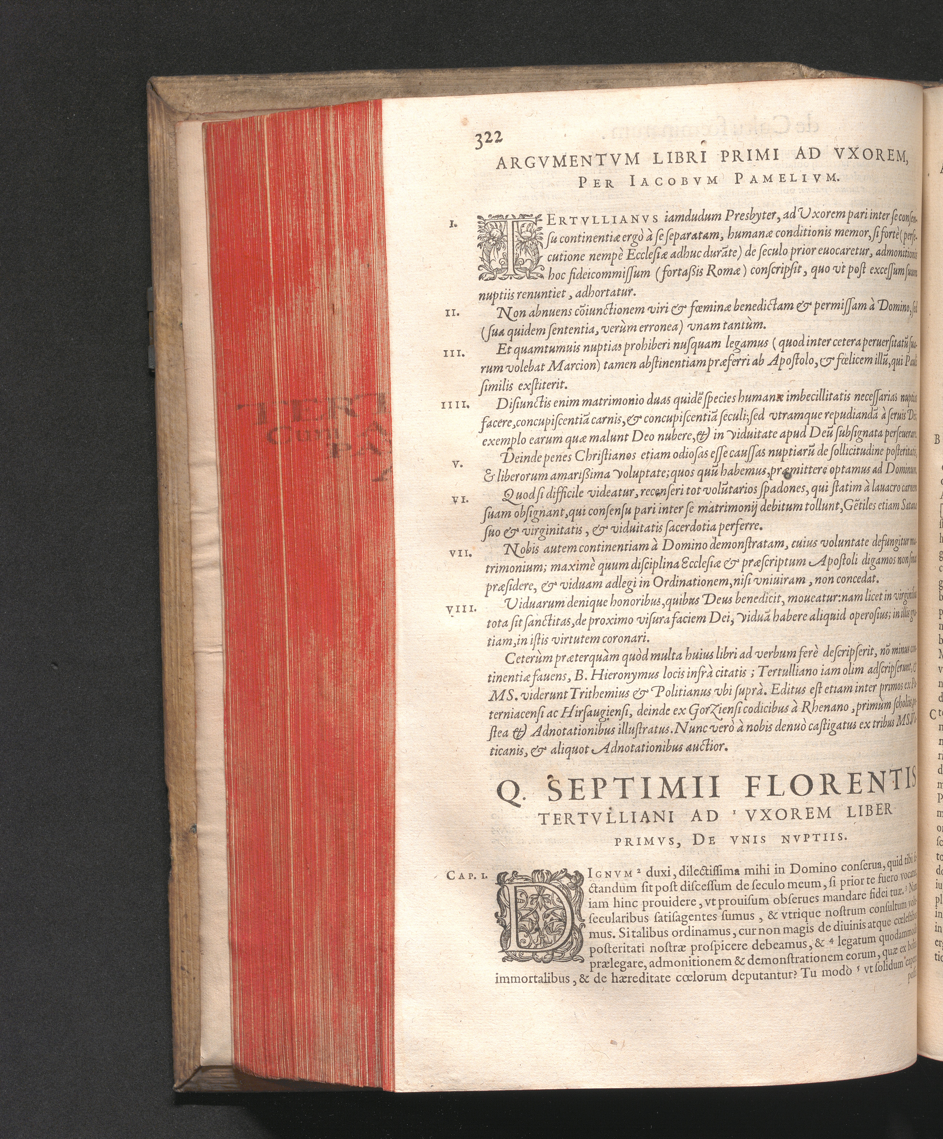 Q. SEPTIMII|| FLORENTIS|| TERTVLLIANI|| CARTHAGINIENSIS|| PRESBYTERI, OPERA|| QVÆ HACTENVS REPERIRI|| POTVERVNT OMNIA:|| : IAM POSTREMVM, AD EXEMPLARIA|| manuscripta collatione facta, quam accuratissimè recognita, aliquot etiam|| libris auctiora; nunc primùm in capita, & certo ordine, habita quantum|| fieri potuit temporum ratione, in QVINQVE TOMOS distincta.|| ...|| Catalogum totius Operis inueniet Lector post Epistolas Dedicatorias; & in|| singulis Tomis Præfatiunculas de librorum ordine.|| / CVM IACOBI PAMELII BRVGENSIS, THEOLOGI,|| Archidiaconi Audomaropolitani, Argumentis & Adnotationibus toti Operi|| interiectis; quibus tum loci obscuriores explicantur, tum quidquid|| ad Antiquitatem Ecclesiasticam spectat, illustratur.||