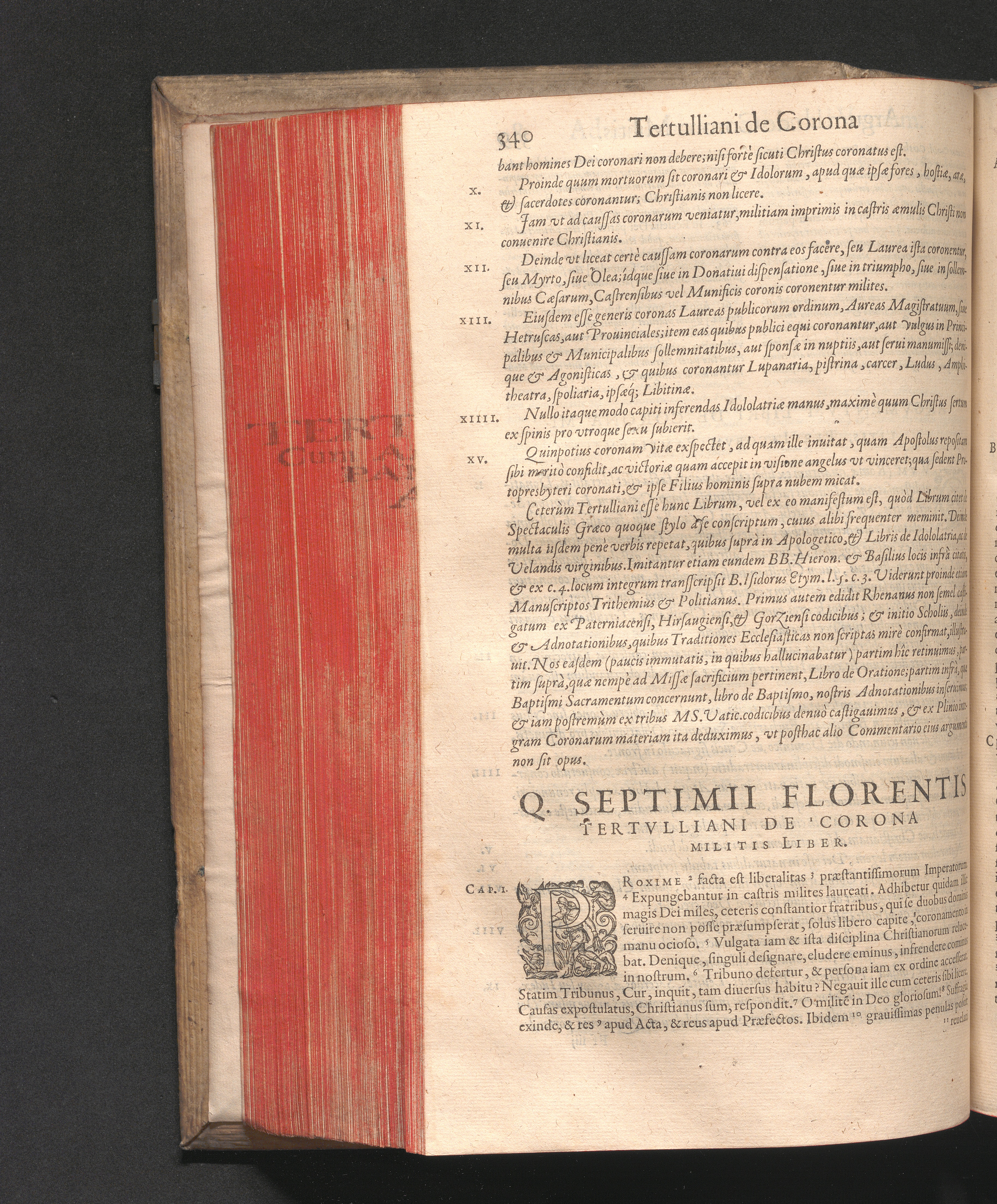 Q. SEPTIMII|| FLORENTIS|| TERTVLLIANI|| CARTHAGINIENSIS|| PRESBYTERI, OPERA|| QVÆ HACTENVS REPERIRI|| POTVERVNT OMNIA:|| : IAM POSTREMVM, AD EXEMPLARIA|| manuscripta collatione facta, quam accuratissimè recognita, aliquot etiam|| libris auctiora; nunc primùm in capita, & certo ordine, habita quantum|| fieri potuit temporum ratione, in QVINQVE TOMOS distincta.|| ...|| Catalogum totius Operis inueniet Lector post Epistolas Dedicatorias; & in|| singulis Tomis Præfatiunculas de librorum ordine.|| / CVM IACOBI PAMELII BRVGENSIS, THEOLOGI,|| Archidiaconi Audomaropolitani, Argumentis & Adnotationibus toti Operi|| interiectis; quibus tum loci obscuriores explicantur, tum quidquid|| ad Antiquitatem Ecclesiasticam spectat, illustratur.||