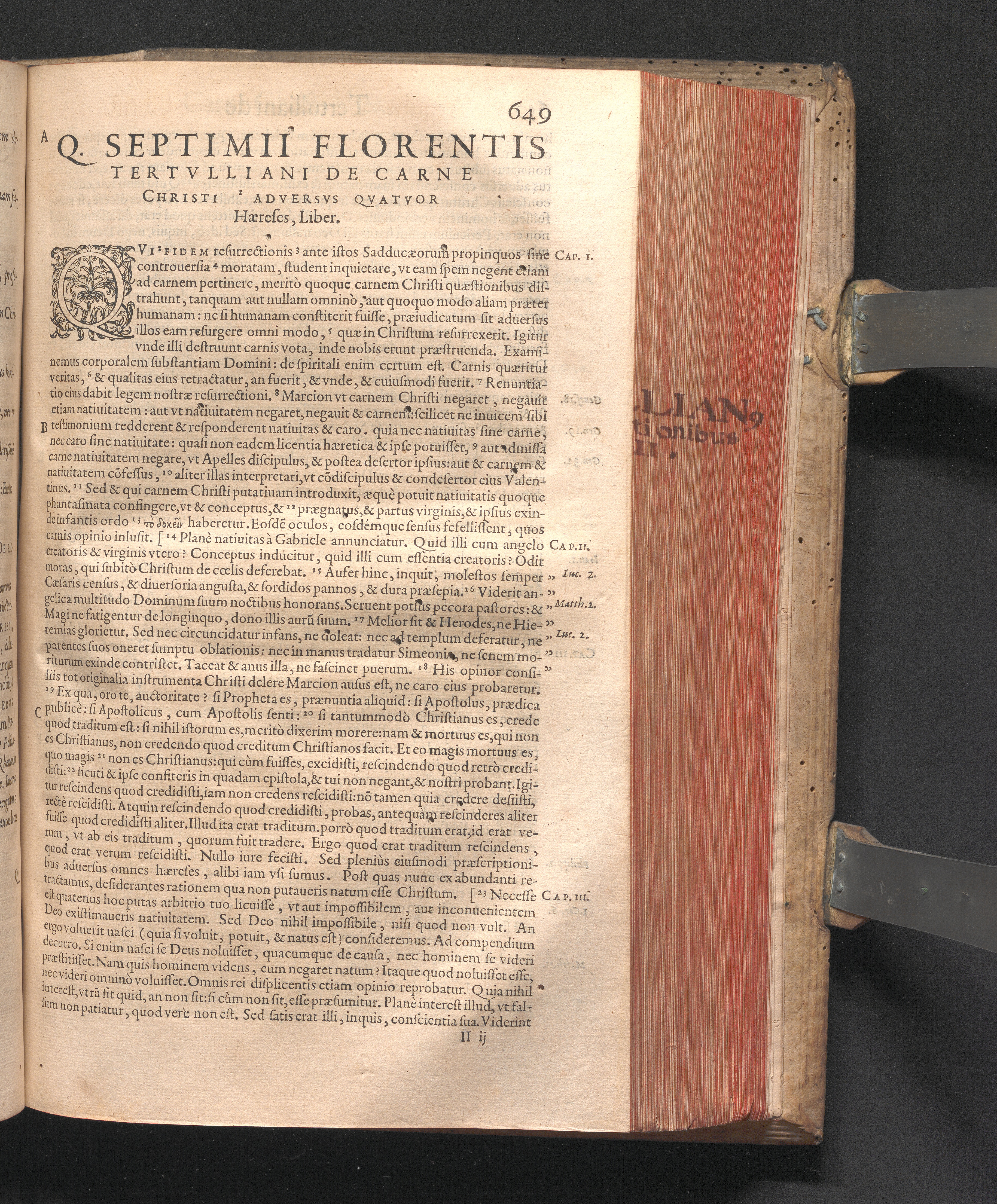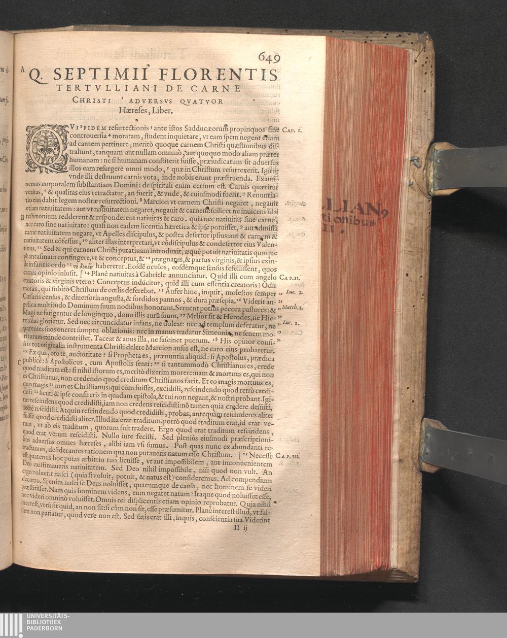 Q. SEPTIMII|| FLORENTIS|| TERTVLLIANI|| CARTHAGINIENSIS|| PRESBYTERI, OPERA|| QVÆ HACTENVS REPERIRI|| POTVERVNT OMNIA:|| : IAM POSTREMVM, AD EXEMPLARIA|| manuscripta collatione facta, quam accuratissimè recognita, aliquot etiam|| libris auctiora; nunc primùm in capita, & certo ordine, habita quantum|| fieri potuit temporum ratione, in QVINQVE TOMOS distincta.|| ...|| Catalogum totius Operis inueniet Lector post Epistolas Dedicatorias; & in|| singulis Tomis Præfatiunculas de librorum ordine.|| / CVM IACOBI PAMELII BRVGENSIS, THEOLOGI,|| Archidiaconi Audomaropolitani, Argumentis & Adnotationibus toti Operi|| interiectis; quibus tum loci obscuriores explicantur, tum quidquid|| ad Antiquitatem Ecclesiasticam spectat, illustratur.||