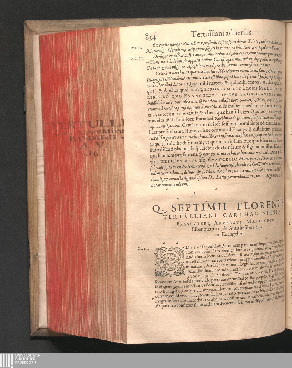 Q. SEPTIMII|| FLORENTIS|| TERTVLLIANI|| CARTHAGINIENSIS|| PRESBYTERI, OPERA|| QVÆ HACTENVS REPERIRI|| POTVERVNT OMNIA:|| : IAM POSTREMVM, AD EXEMPLARIA|| manuscripta collatione facta, quam accuratissimè recognita, aliquot etiam|| libris auctiora; nunc primùm in capita, & certo ordine, habita quantum|| fieri potuit temporum ratione, in QVINQVE TOMOS distincta.|| ...|| Catalogum totius Operis inueniet Lector post Epistolas Dedicatorias; & in|| singulis Tomis Præfatiunculas de librorum ordine.|| / CVM IACOBI PAMELII BRVGENSIS, THEOLOGI,|| Archidiaconi Audomaropolitani, Argumentis & Adnotationibus toti Operi|| interiectis; quibus tum loci obscuriores explicantur, tum quidquid|| ad Antiquitatem Ecclesiasticam spectat, illustratur.||