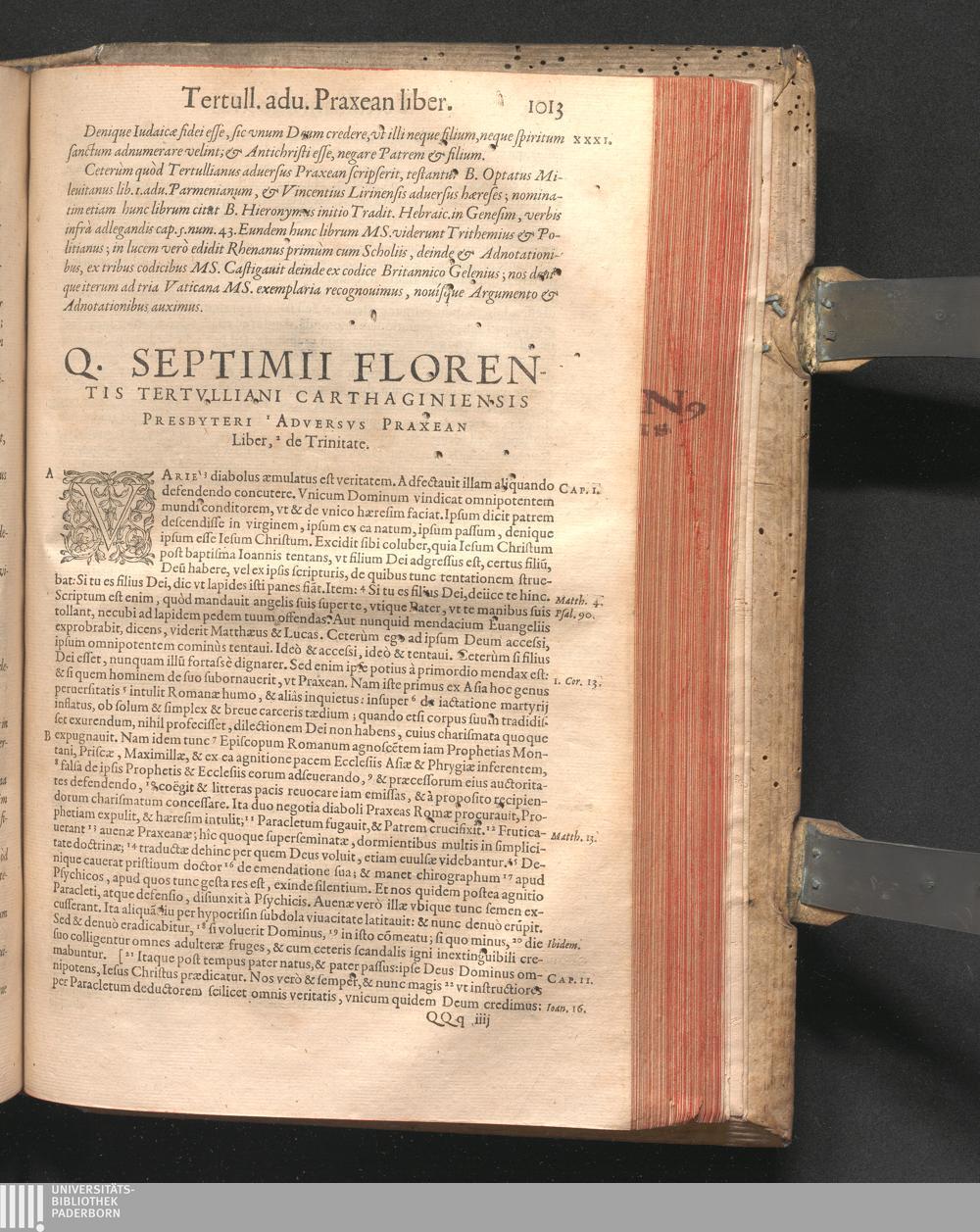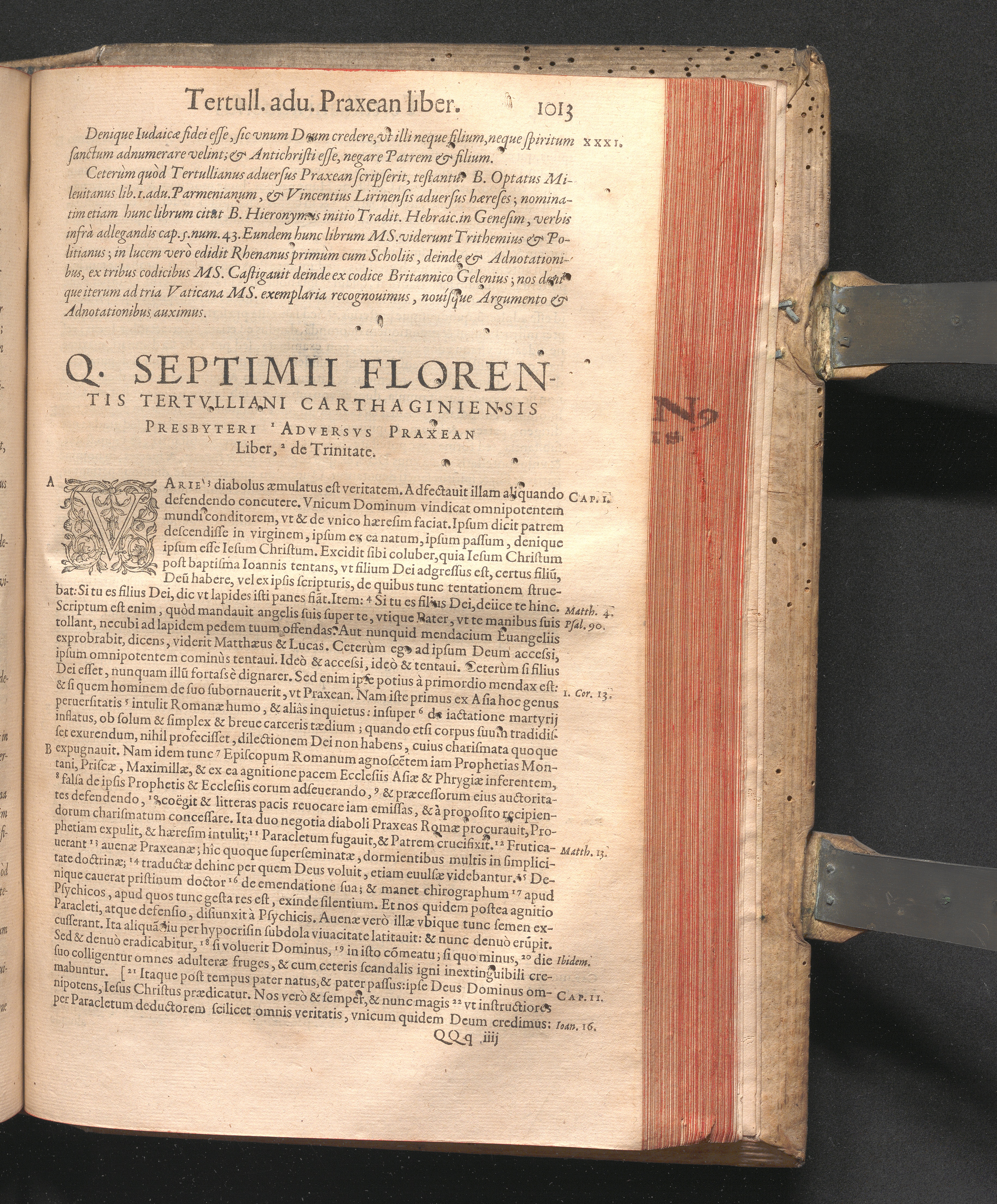 Q. SEPTIMII|| FLORENTIS|| TERTVLLIANI|| CARTHAGINIENSIS|| PRESBYTERI, OPERA|| QVÆ HACTENVS REPERIRI|| POTVERVNT OMNIA:|| : IAM POSTREMVM, AD EXEMPLARIA|| manuscripta collatione facta, quam accuratissimè recognita, aliquot etiam|| libris auctiora; nunc primùm in capita, & certo ordine, habita quantum|| fieri potuit temporum ratione, in QVINQVE TOMOS distincta.|| ...|| Catalogum totius Operis inueniet Lector post Epistolas Dedicatorias; & in|| singulis Tomis Præfatiunculas de librorum ordine.|| / CVM IACOBI PAMELII BRVGENSIS, THEOLOGI,|| Archidiaconi Audomaropolitani, Argumentis & Adnotationibus toti Operi|| interiectis; quibus tum loci obscuriores explicantur, tum quidquid|| ad Antiquitatem Ecclesiasticam spectat, illustratur.||