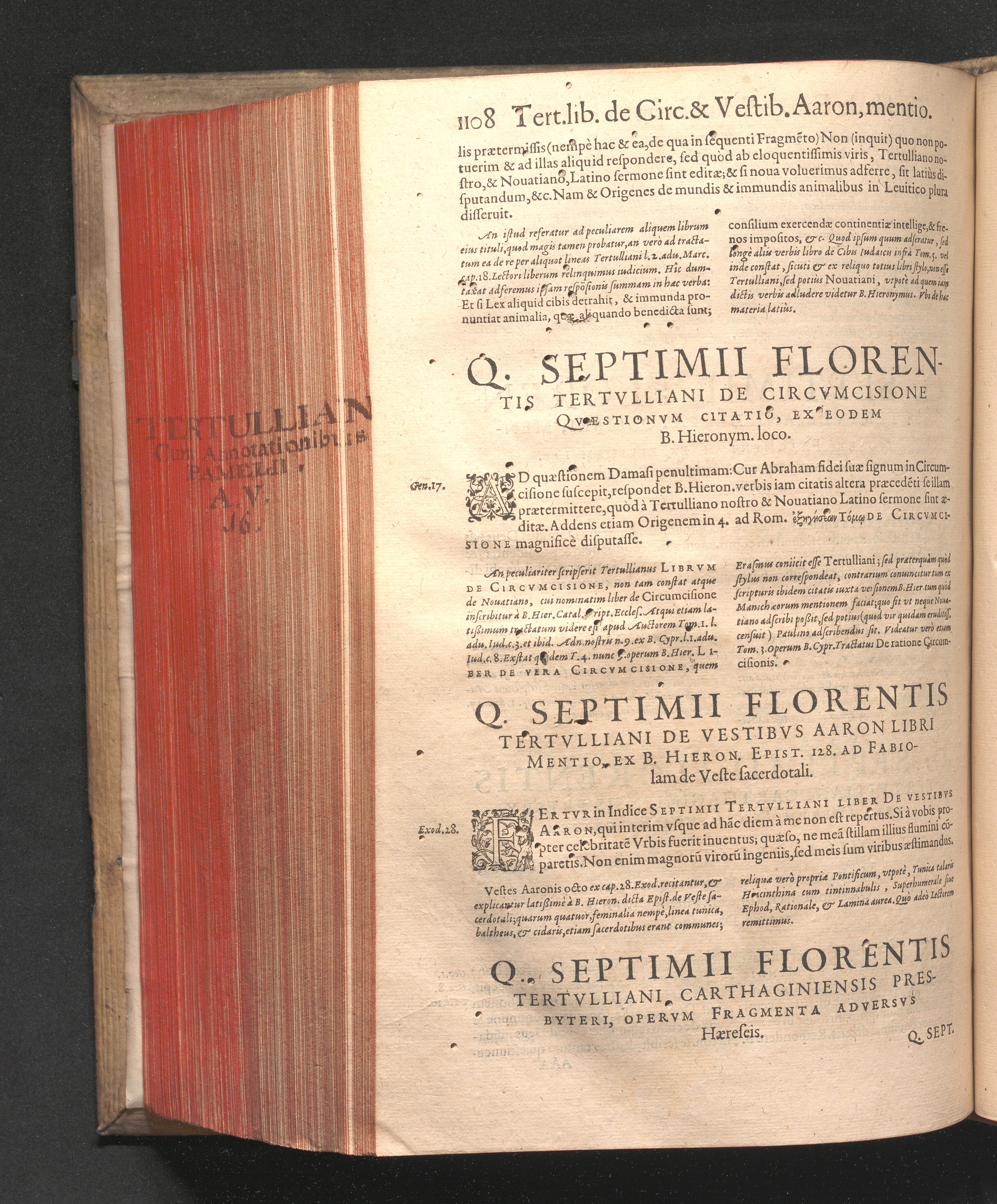 Q. SEPTIMII|| FLORENTIS|| TERTVLLIANI|| CARTHAGINIENSIS|| PRESBYTERI, OPERA|| QVÆ HACTENVS REPERIRI|| POTVERVNT OMNIA:|| : IAM POSTREMVM, AD EXEMPLARIA|| manuscripta collatione facta, quam accuratissimè recognita, aliquot etiam|| libris auctiora; nunc primùm in capita, & certo ordine, habita quantum|| fieri potuit temporum ratione, in QVINQVE TOMOS distincta.|| ...|| Catalogum totius Operis inueniet Lector post Epistolas Dedicatorias; & in|| singulis Tomis Præfatiunculas de librorum ordine.|| / CVM IACOBI PAMELII BRVGENSIS, THEOLOGI,|| Archidiaconi Audomaropolitani, Argumentis & Adnotationibus toti Operi|| interiectis; quibus tum loci obscuriores explicantur, tum quidquid|| ad Antiquitatem Ecclesiasticam spectat, illustratur.||