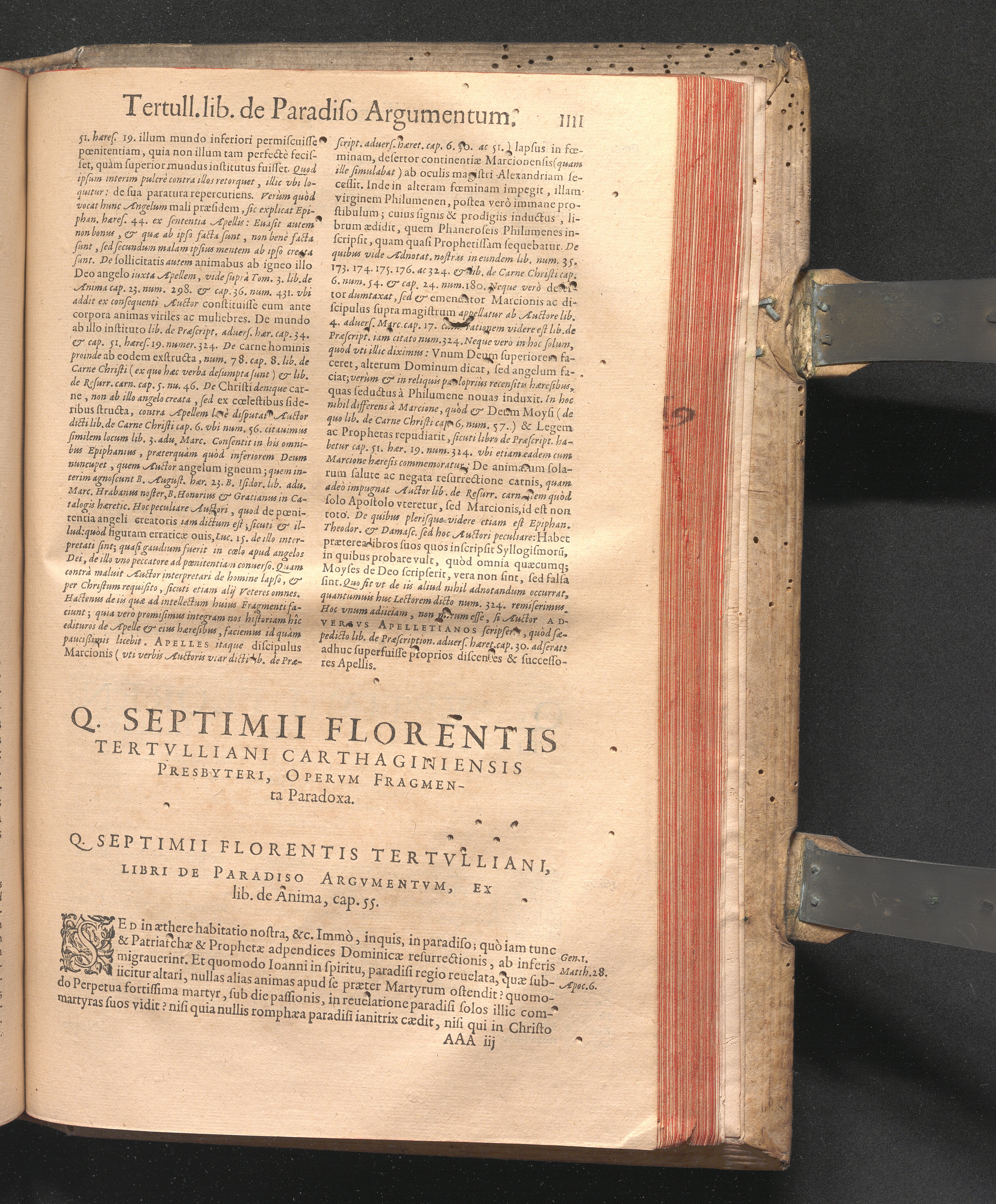Q. SEPTIMII|| FLORENTIS|| TERTVLLIANI|| CARTHAGINIENSIS|| PRESBYTERI, OPERA|| QVÆ HACTENVS REPERIRI|| POTVERVNT OMNIA:|| : IAM POSTREMVM, AD EXEMPLARIA|| manuscripta collatione facta, quam accuratissimè recognita, aliquot etiam|| libris auctiora; nunc primùm in capita, & certo ordine, habita quantum|| fieri potuit temporum ratione, in QVINQVE TOMOS distincta.|| ...|| Catalogum totius Operis inueniet Lector post Epistolas Dedicatorias; & in|| singulis Tomis Præfatiunculas de librorum ordine.|| / CVM IACOBI PAMELII BRVGENSIS, THEOLOGI,|| Archidiaconi Audomaropolitani, Argumentis & Adnotationibus toti Operi|| interiectis; quibus tum loci obscuriores explicantur, tum quidquid|| ad Antiquitatem Ecclesiasticam spectat, illustratur.||