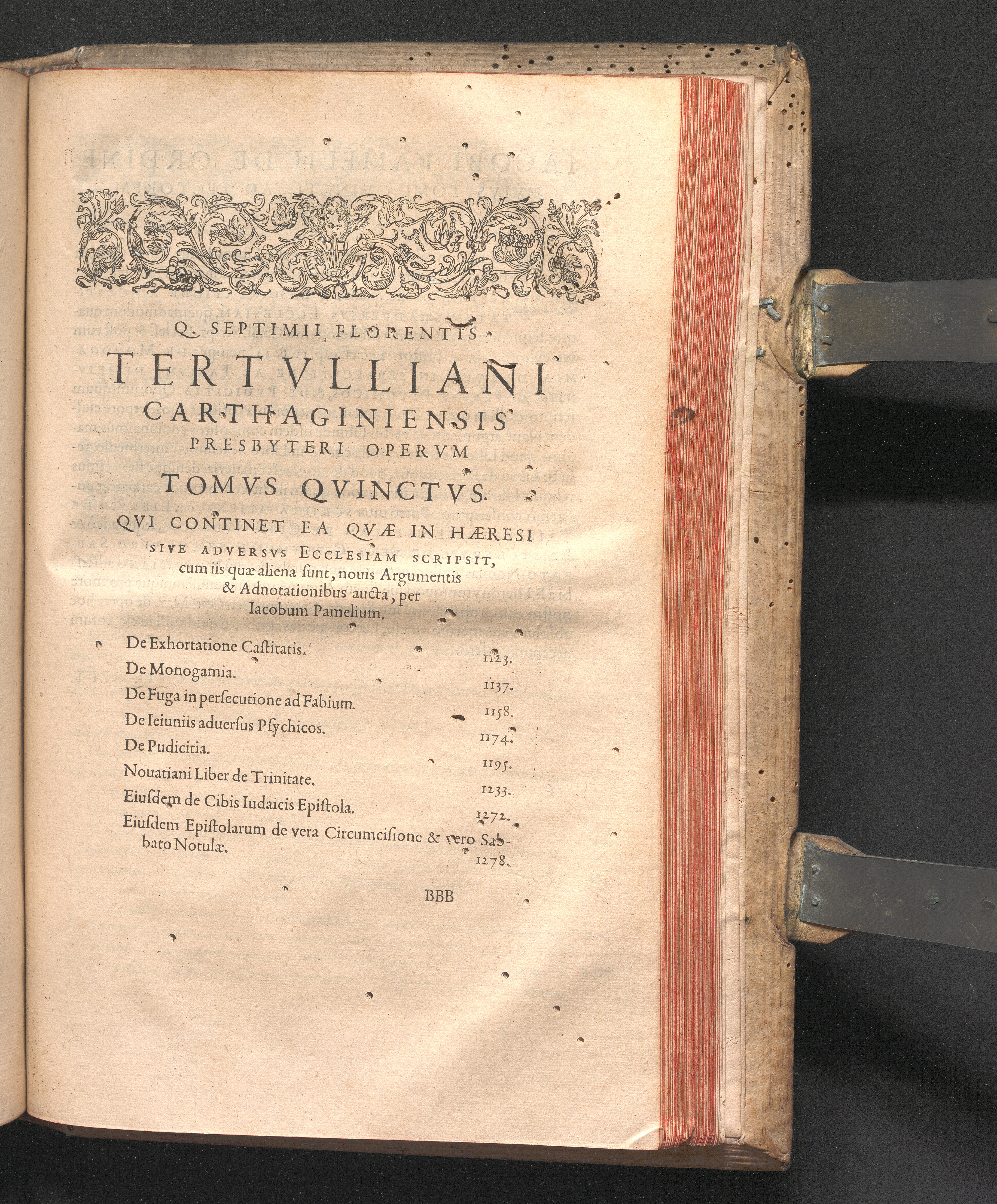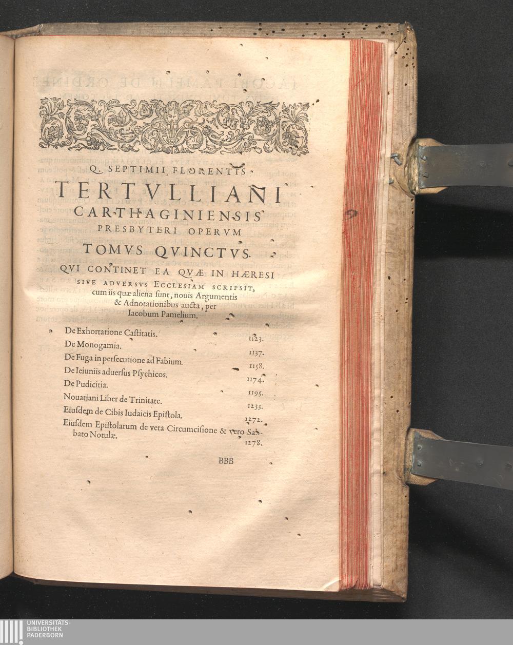 Q. SEPTIMII|| FLORENTIS|| TERTVLLIANI|| CARTHAGINIENSIS|| PRESBYTERI, OPERA|| QVÆ HACTENVS REPERIRI|| POTVERVNT OMNIA:|| : IAM POSTREMVM, AD EXEMPLARIA|| manuscripta collatione facta, quam accuratissimè recognita, aliquot etiam|| libris auctiora; nunc primùm in capita, & certo ordine, habita quantum|| fieri potuit temporum ratione, in QVINQVE TOMOS distincta.|| ...|| Catalogum totius Operis inueniet Lector post Epistolas Dedicatorias; & in|| singulis Tomis Præfatiunculas de librorum ordine.|| / CVM IACOBI PAMELII BRVGENSIS, THEOLOGI,|| Archidiaconi Audomaropolitani, Argumentis & Adnotationibus toti Operi|| interiectis; quibus tum loci obscuriores explicantur, tum quidquid|| ad Antiquitatem Ecclesiasticam spectat, illustratur.||