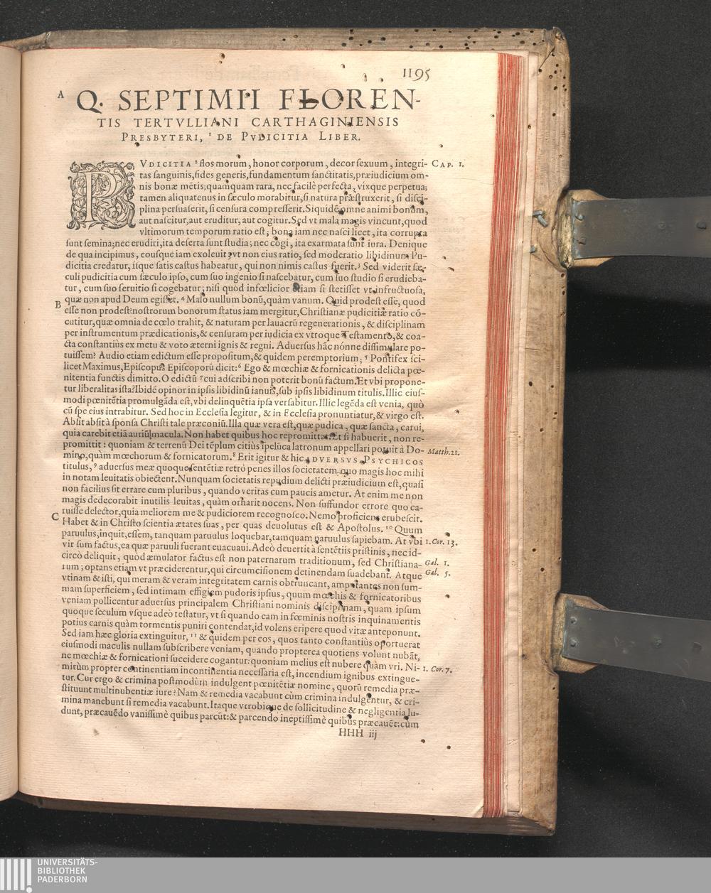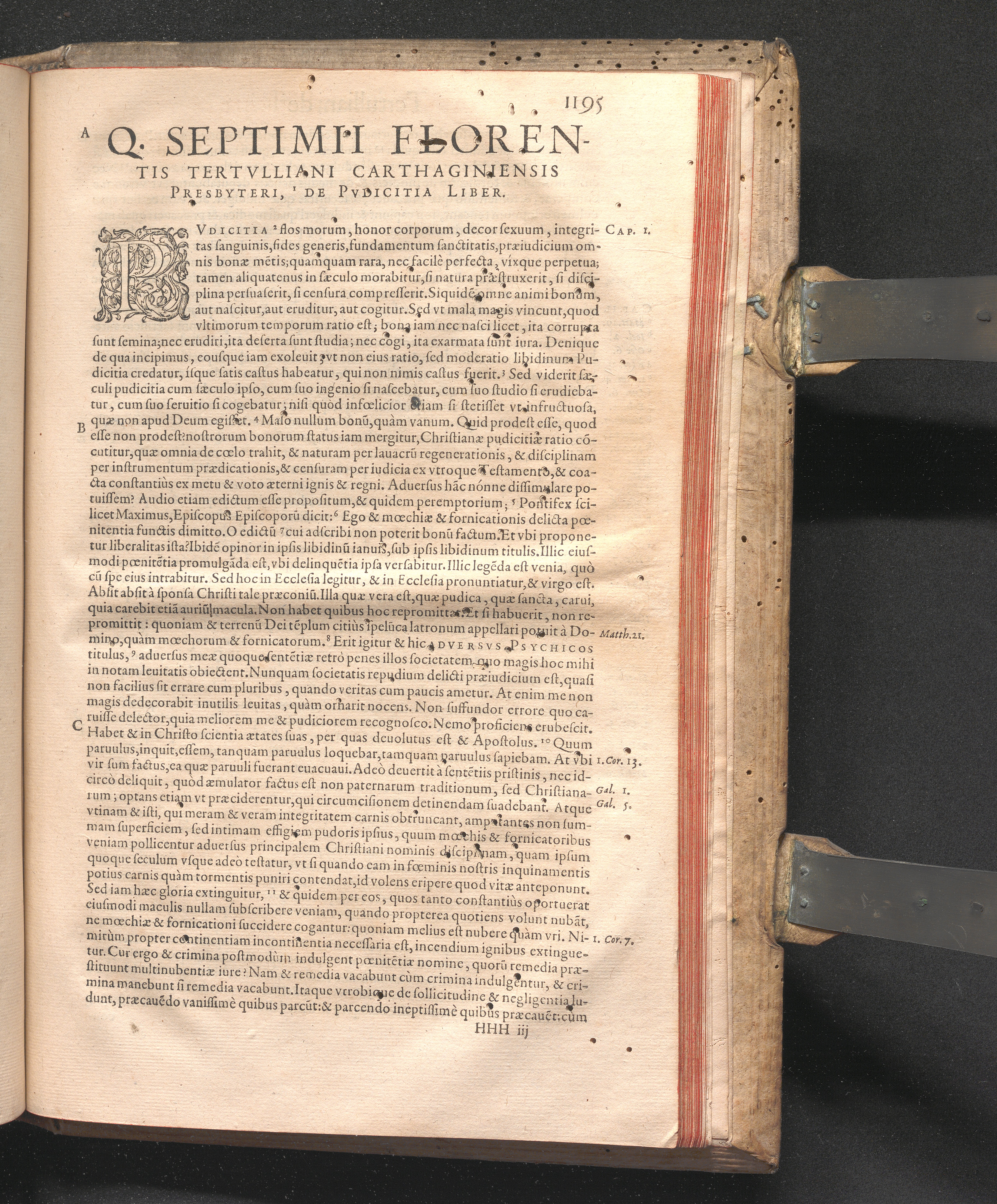 Q. SEPTIMII|| FLORENTIS|| TERTVLLIANI|| CARTHAGINIENSIS|| PRESBYTERI, OPERA|| QVÆ HACTENVS REPERIRI|| POTVERVNT OMNIA:|| : IAM POSTREMVM, AD EXEMPLARIA|| manuscripta collatione facta, quam accuratissimè recognita, aliquot etiam|| libris auctiora; nunc primùm in capita, & certo ordine, habita quantum|| fieri potuit temporum ratione, in QVINQVE TOMOS distincta.|| ...|| Catalogum totius Operis inueniet Lector post Epistolas Dedicatorias; & in|| singulis Tomis Præfatiunculas de librorum ordine.|| / CVM IACOBI PAMELII BRVGENSIS, THEOLOGI,|| Archidiaconi Audomaropolitani, Argumentis & Adnotationibus toti Operi|| interiectis; quibus tum loci obscuriores explicantur, tum quidquid|| ad Antiquitatem Ecclesiasticam spectat, illustratur.||