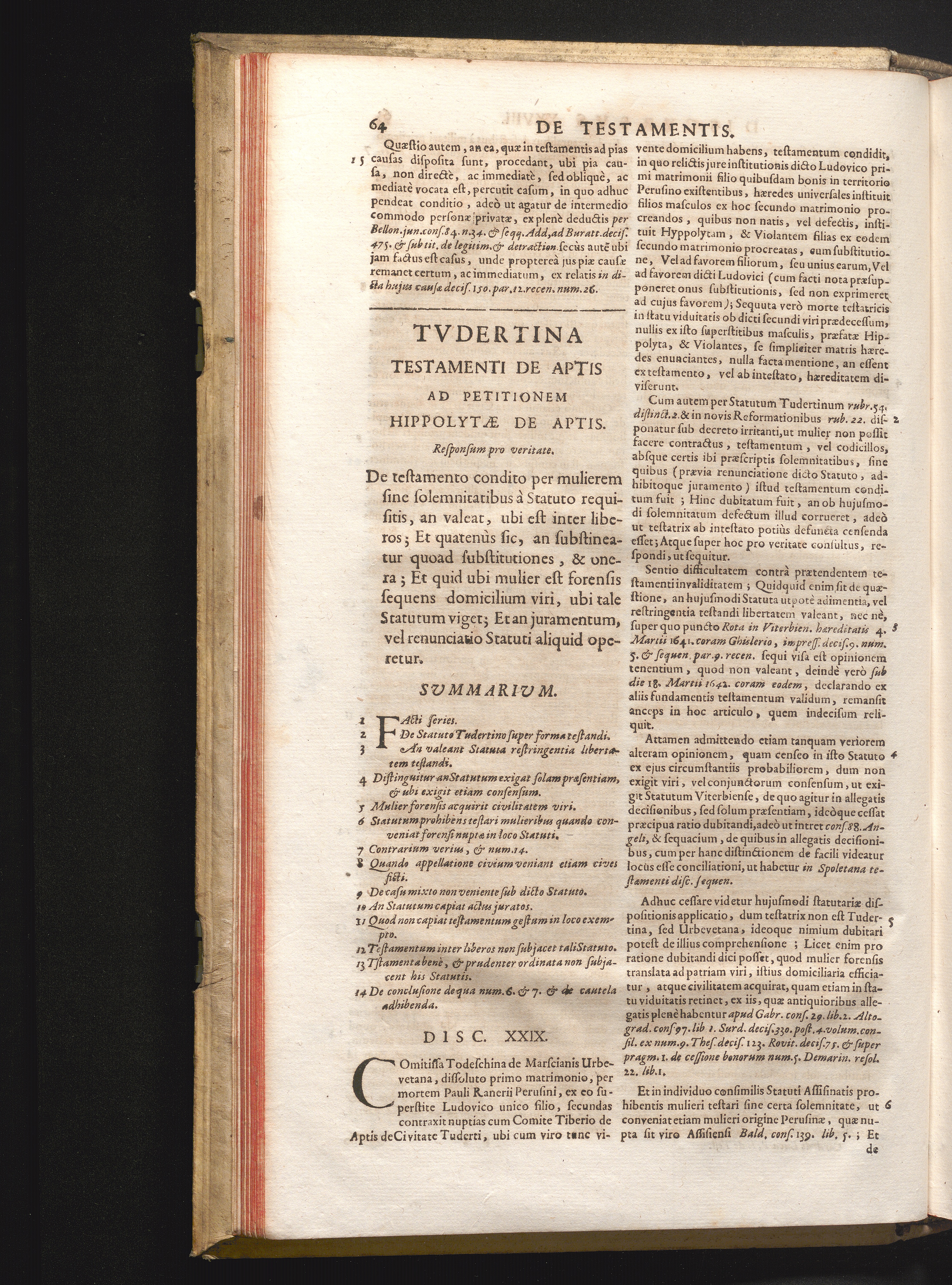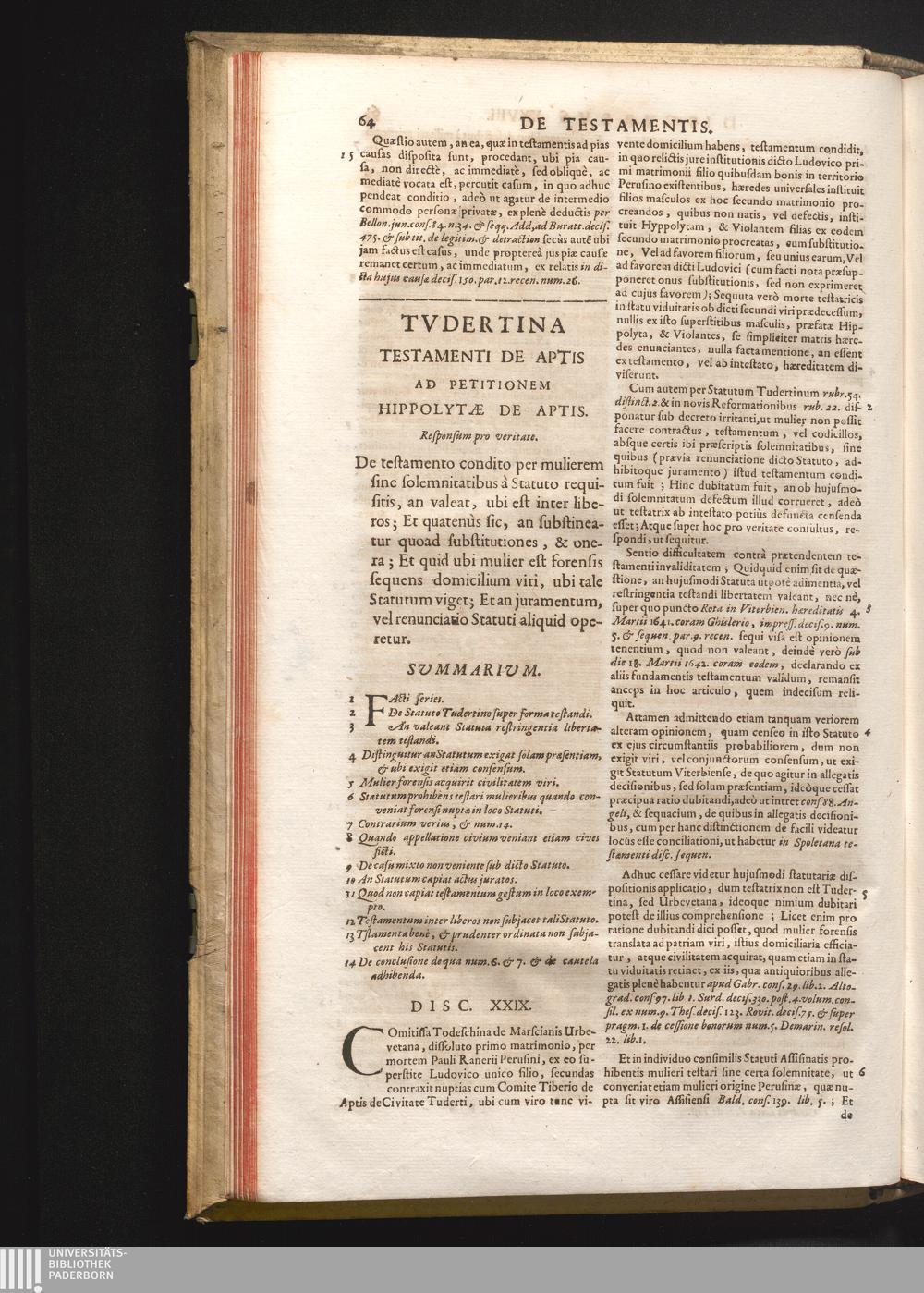 Disc. XXIX. Tudertina testamenti de Aptis. De testamento condito per mulierem sine[...]