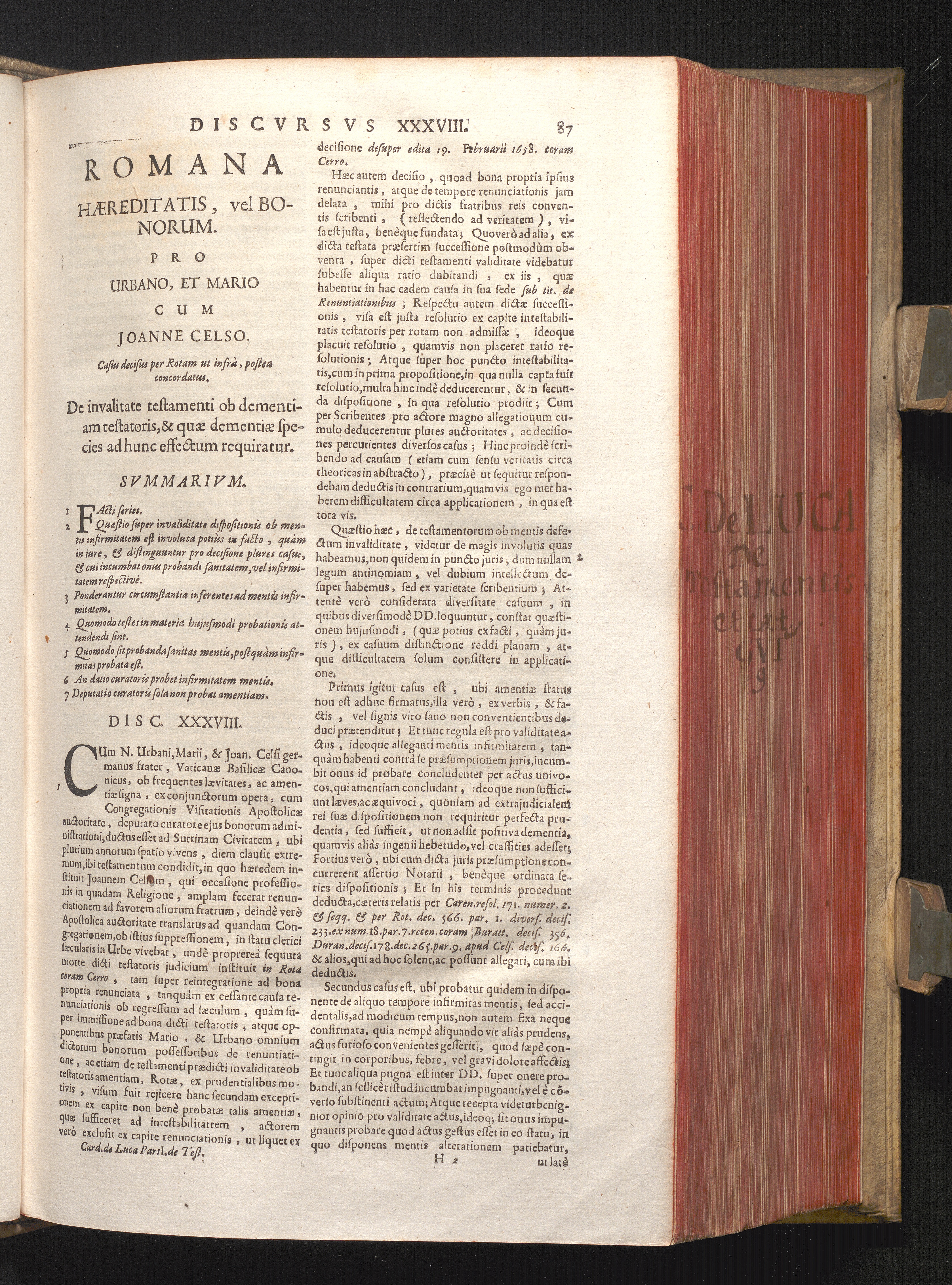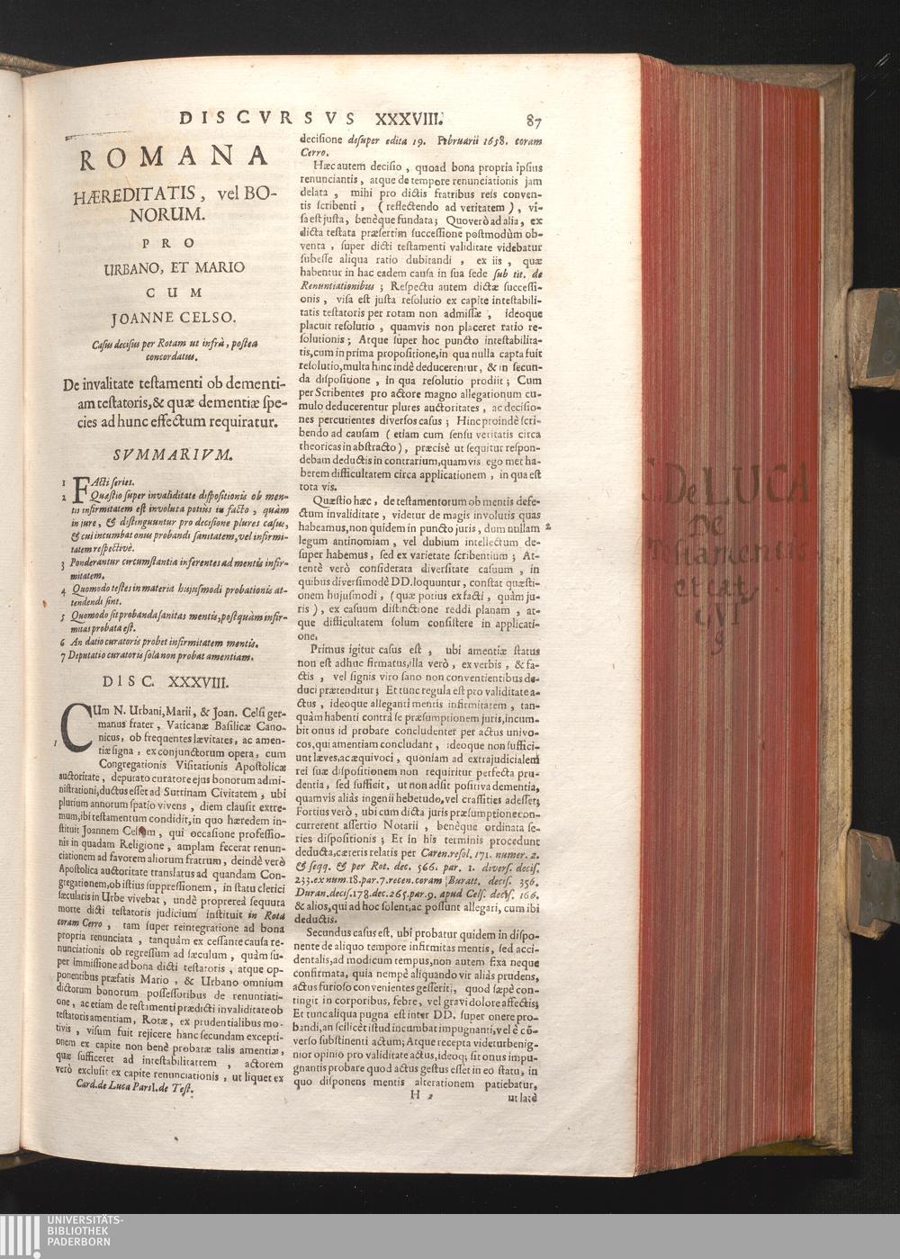 Disc. XXXVIII. Romana hæreditatis, vel bonorum. De invaliditate testamenti ob dementiam[...]